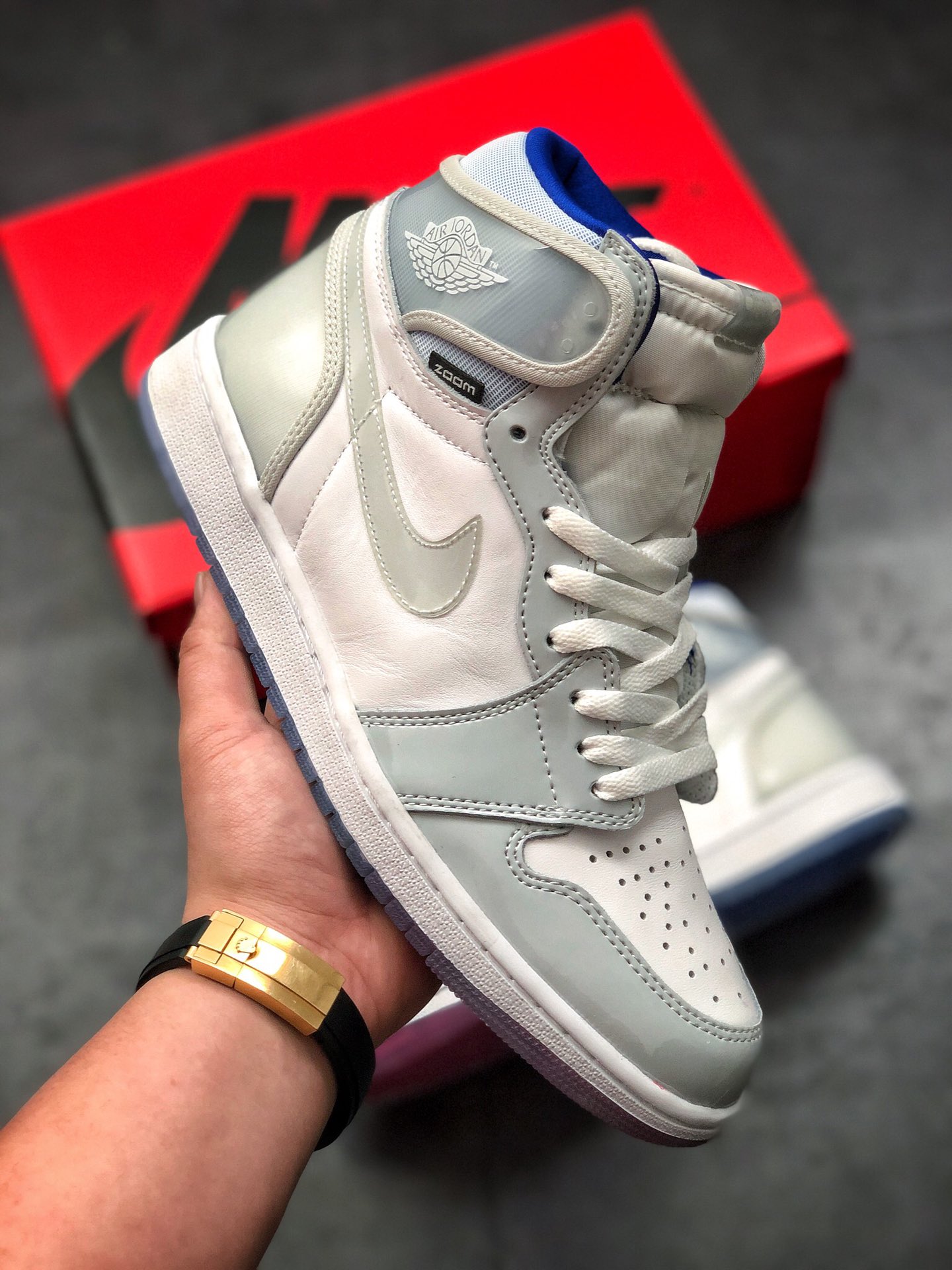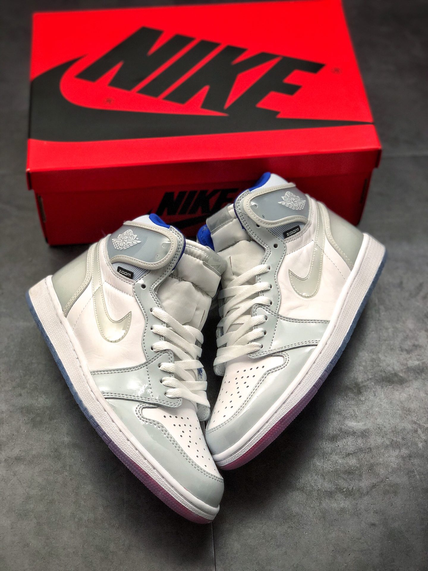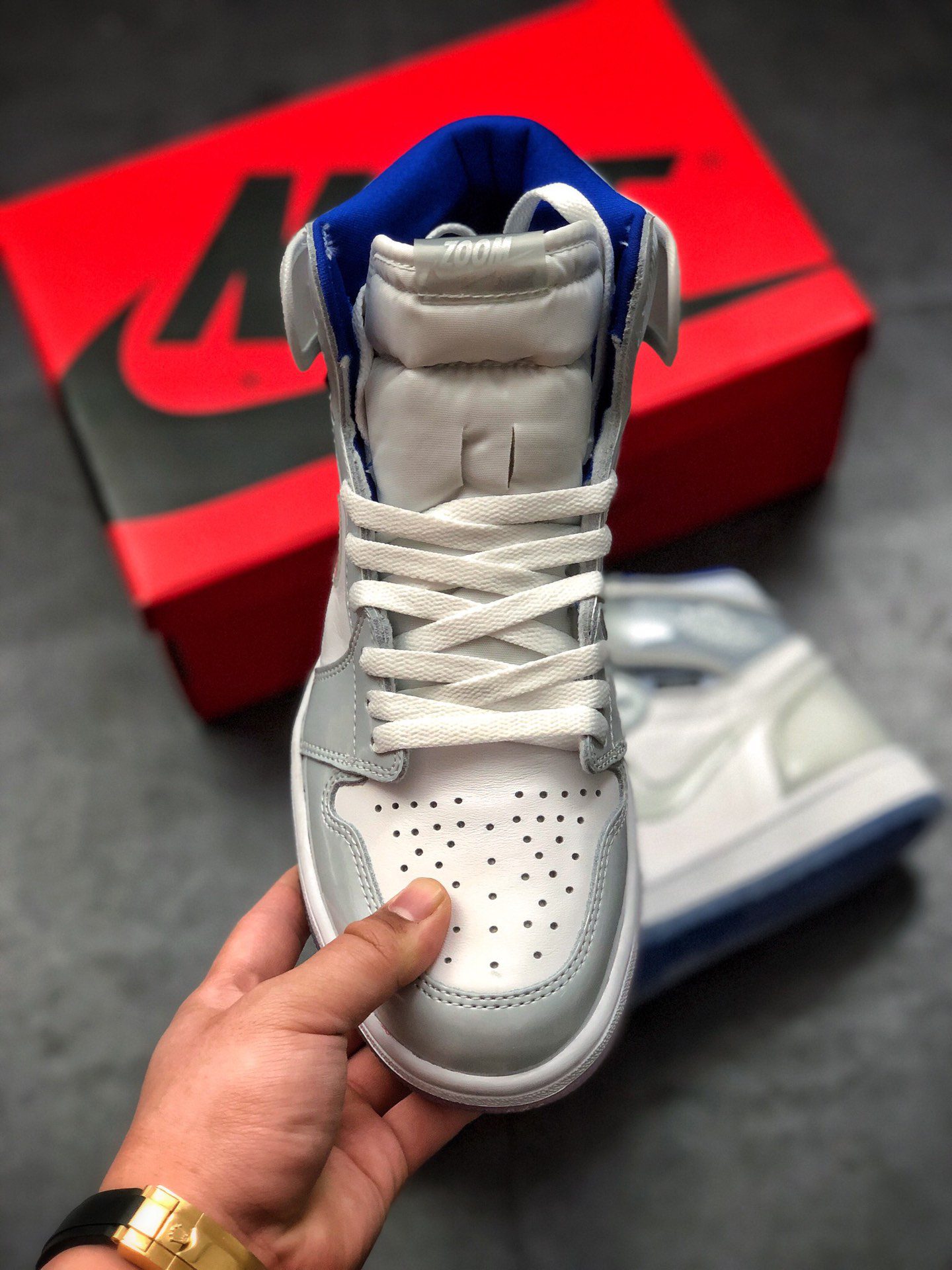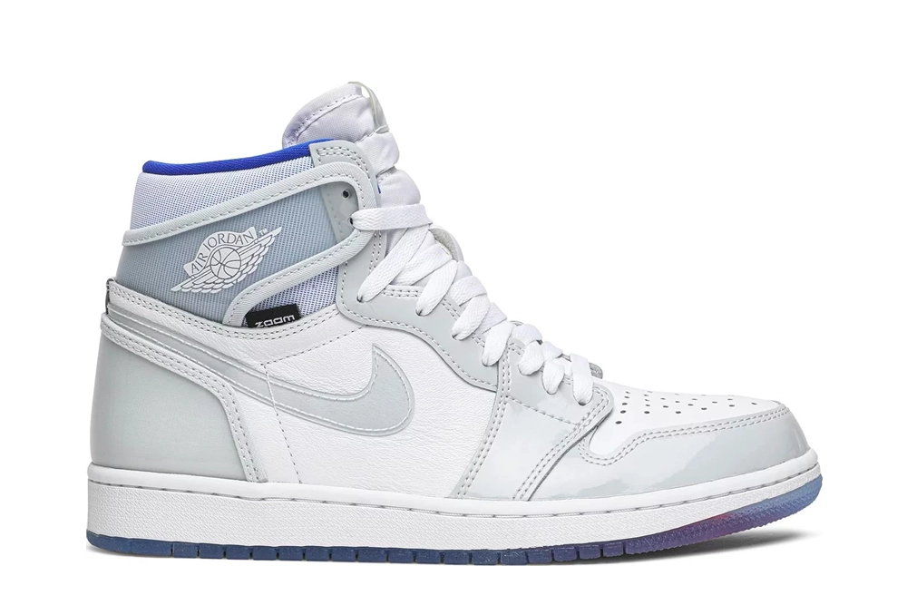 The Air Jordan 1 Retro High Zoom Racer Blue is a standout sneaker that blends classic design with modern technology. Featuring a clean white and racer blue colorway, this model incorporates Nike Zoom Air technology for enhanced comfort and responsiveness. The shoe showcases translucent TPU wings on the lateral side with the iconic Air Jordan wing logo, adding a futuristic touch. Its upper combines patent leather and mesh, creating a sleek yet breathable structure. The sneaker comes with flat white laces with blue tips and an additional pair of vibrant pink laces for style versatility. The inner lining and insoles highlight the bold racer blue color, while the outsole adds a subtle pop of pink. The Air Jordan 1 Retro High Zoom Racer Blue is a perfect fusion of heritage and innovation, making it a must-have for sneaker enthusiasts. This shoe is highly sought after for its unique design and performance features, making it a top choice among Air Jordan 1 fans.