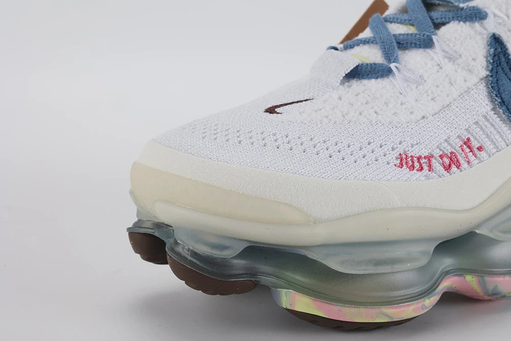 The Nike Air Max Scorpion Just Do It edition elevates the classic Air Max silhouette with fresh details and sustainable materials. Its Flyknit upper features a crisp white base accented by pink and blue highlights, complemented by denim Swooshes and laces that echo the collections denim theme. The lateral forefoot proudly displays the pink “Just Do It” text, reinforcing the sneakers bold identity. Underfoot, the layered midsole with semi-translucent off-white tones and a colorful camouflage-like traction pattern complete the look. Beyond aesthetics, the Air Max Scorpion Just Do It offers a stable ride thanks to its wide Air unit base, providing excellent energy return and springy cushioning. While the cushioning is springy and responsive, the ride is somewhat firm, delivering a unique feel compared to other Air Max models. This sneaker is perfect for those who want a statement piece that combines Nikes innovative Air technology with a vibrant, motivational design.