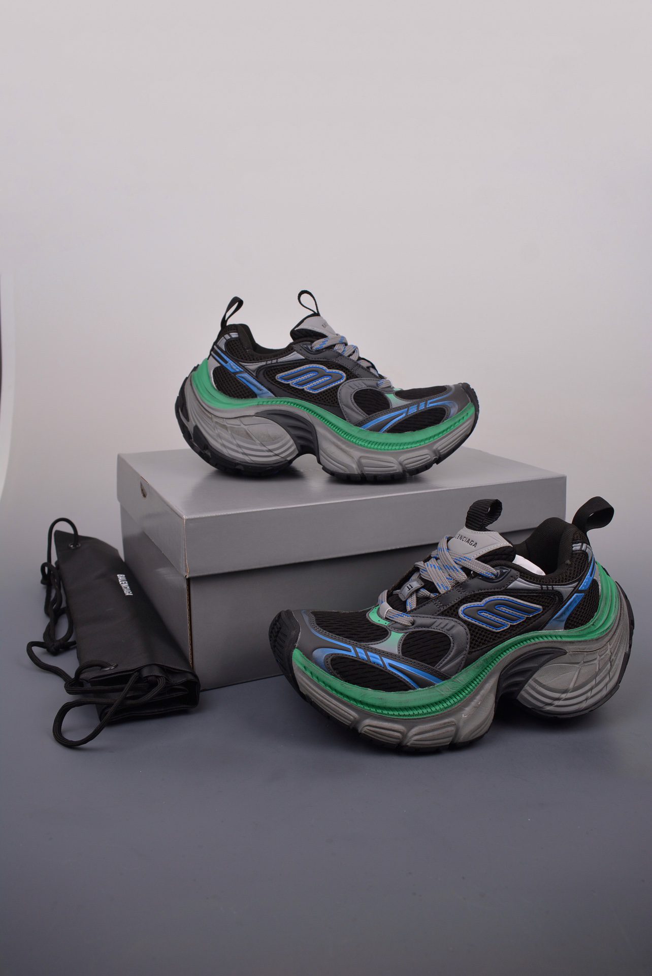Balenciaga’s 10XL sneakers are renowned for their exaggerated volume and worn-out effect, blending mesh, TPU, and rubber for a unique texture and durability. The men’s 10XL low-top sneakers come in a variety of color combinations, including black, grey, blue, and green, all crafted without leather to appeal to eco-conscious consumers. These sneakers feature a lace-up front and cushioned footbed, ensuring comfort alongside their bold design. The oversized silhouette is a hallmark of Balenciaga’s innovative approach, making the 10XL model a standout in the luxury sneaker market. Available in multiple sizes, these sneakers are perfect for those who want to combine avant-garde style with everyday wearability. The brand’s commitment to authenticity and quality is reflected in their detailed inspection process, covering stitching, logos, and packaging. This ensures that every pair of Balenciaga 10XL sneakers meets the highest standards of craftsmanship and design.