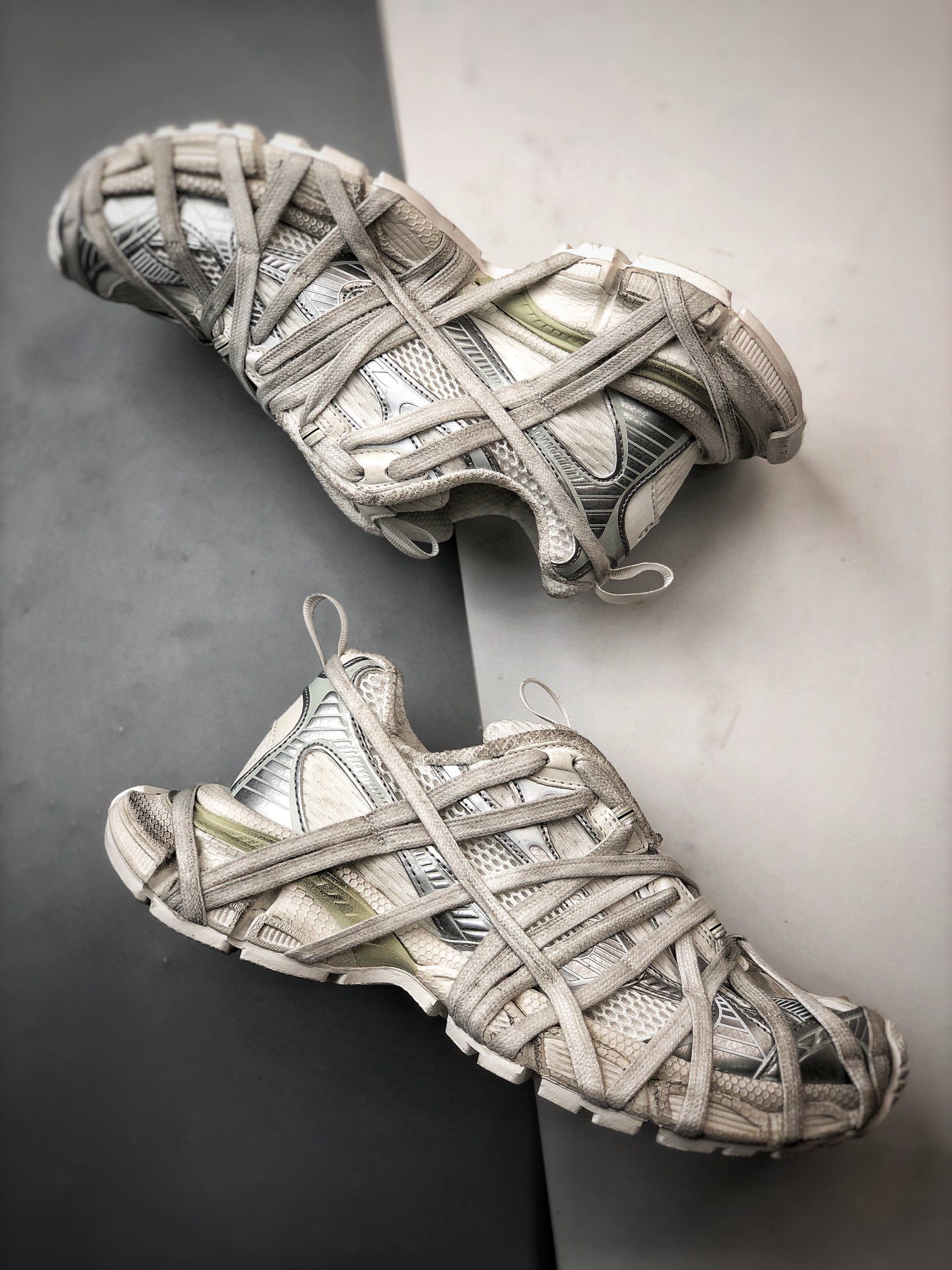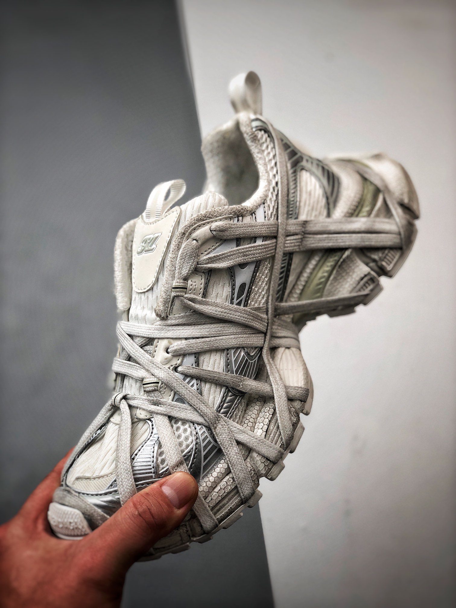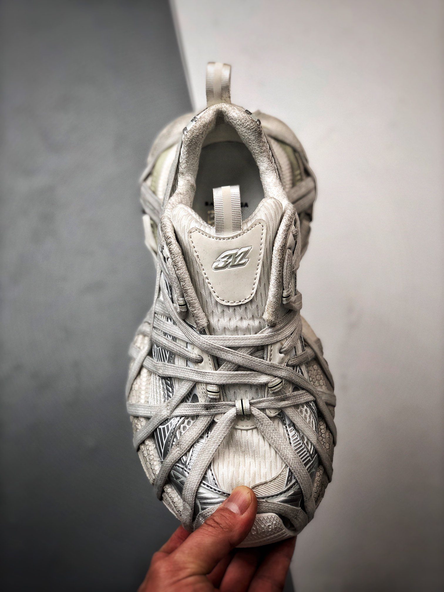 The Balenciaga men’s 3XL Extreme Lace sneaker in white is a standout piece that blends avant-garde design with a nod to early 2000s running shoes. This sneaker features a heavily distressed white mesh upper accented with silver faux-leather trim, creating a worn-in, edgy aesthetic. Its signature detail is the lace-up design that wraps decoratively around the foot, giving it a unique spider web effect. The sneaker also includes reflective detailing, a round toe, and a chunky rubber sole for both style and comfort. Designed with a slip-on style and branded insole, the Balenciaga men’s 3XL Extreme Lace sneaker in white offers a bold statement for fashion-forward individuals. Crafted from polyester, polyurethane, fabric lining, and rubber sole, this sneaker balances durability with high-end style. Whether for casual wear or making a fashion statement, the Balenciaga men’s 3XL Extreme Lace sneaker in white is a must-have for sneaker enthusiasts.