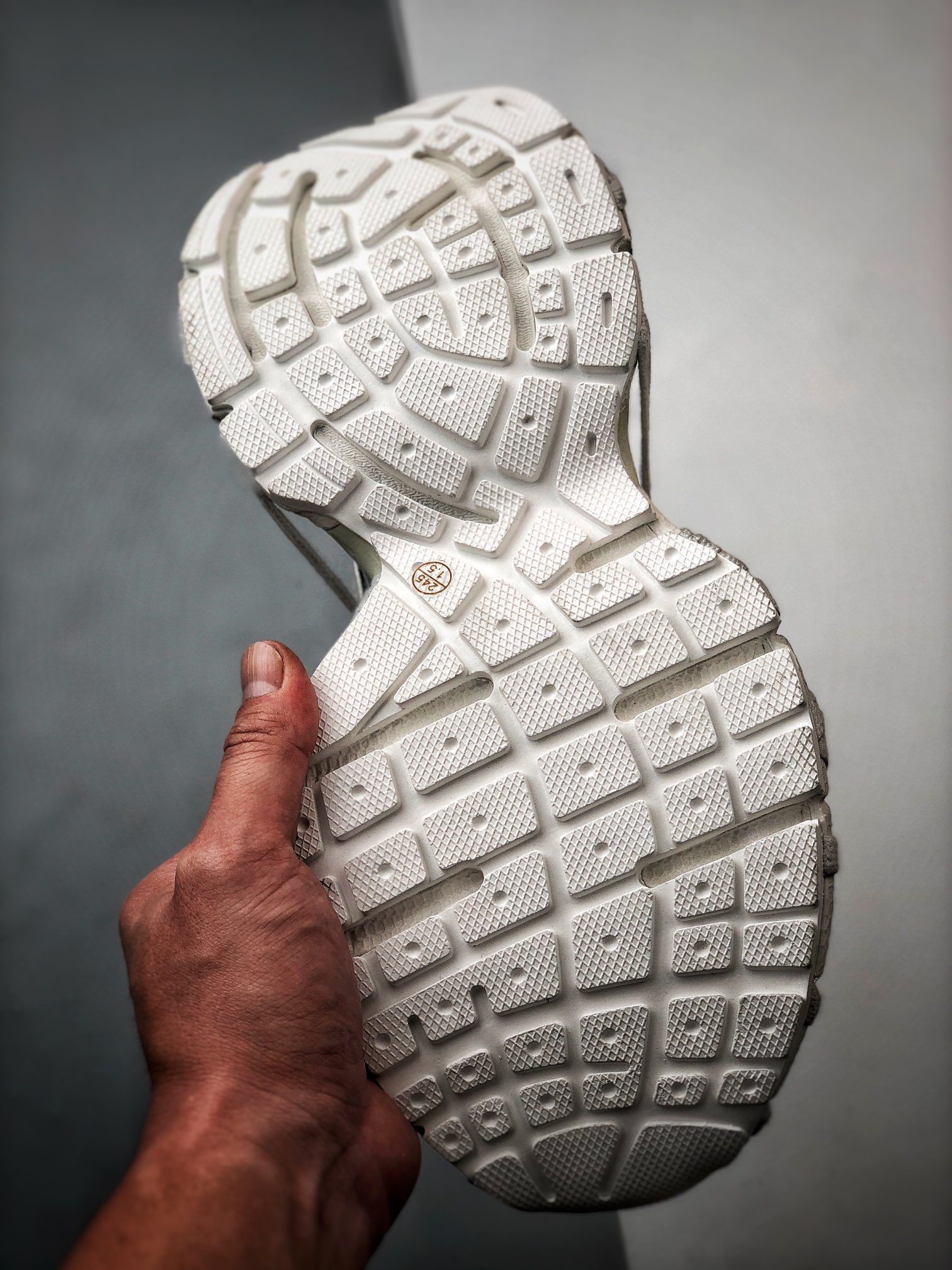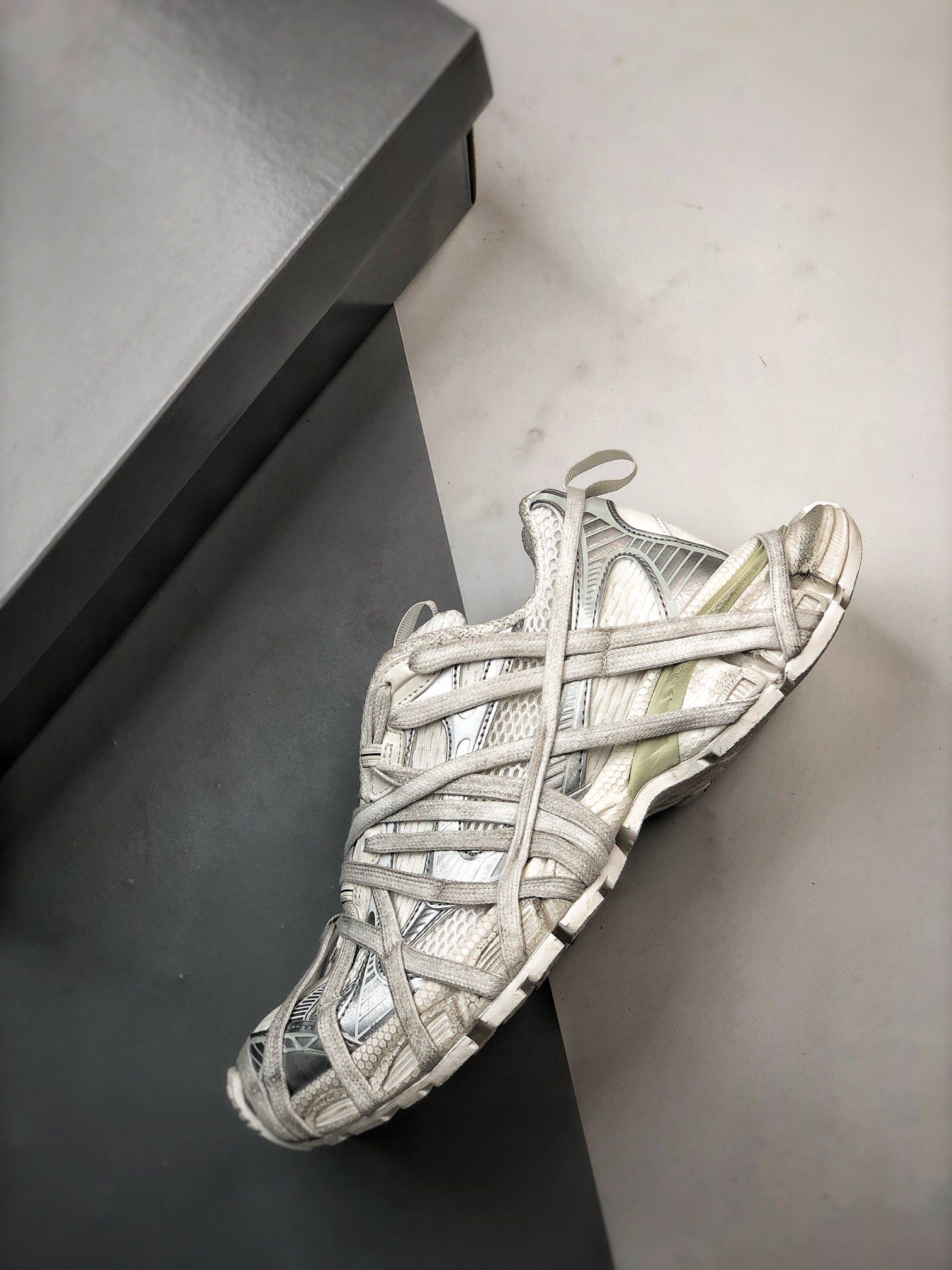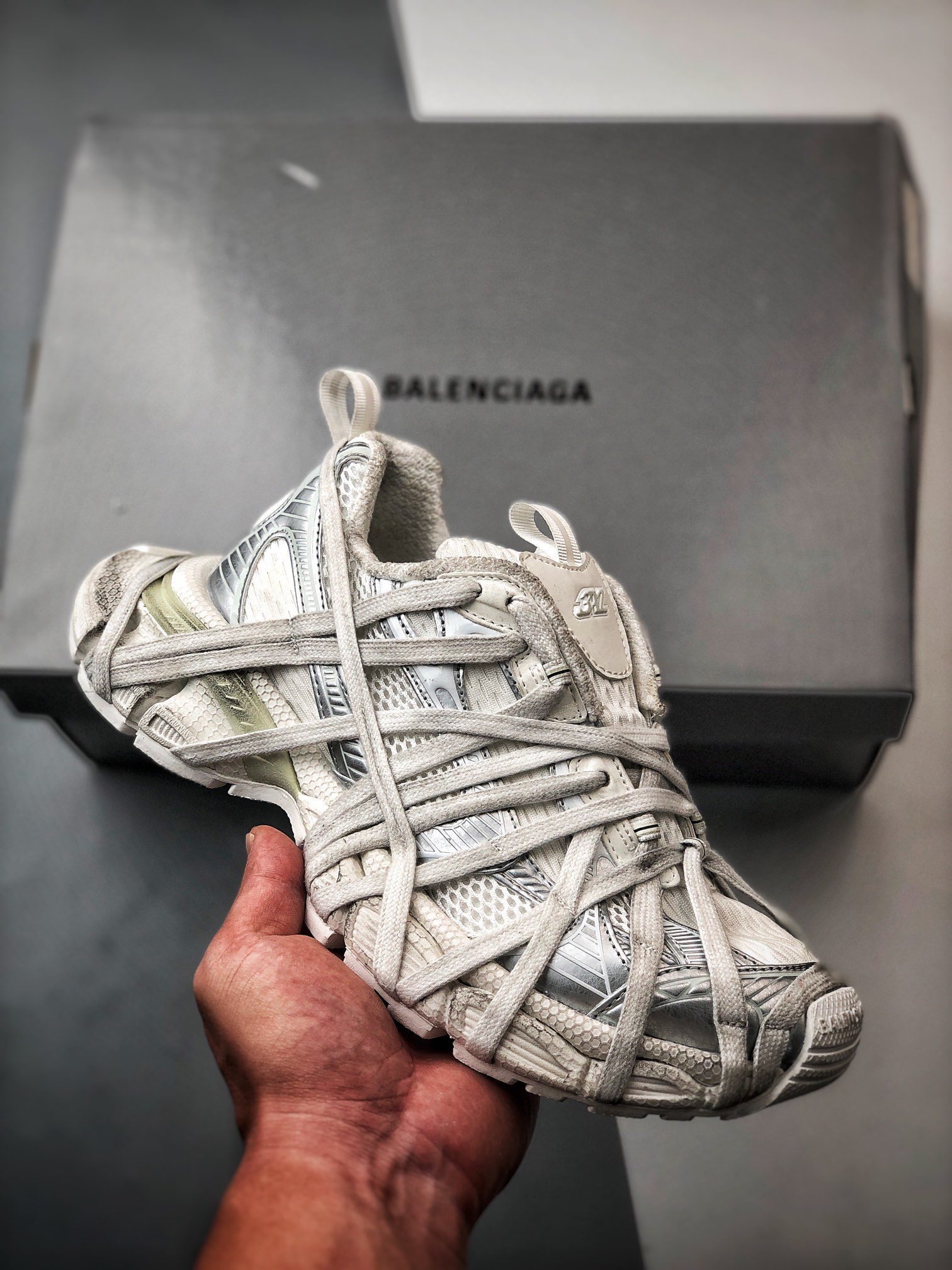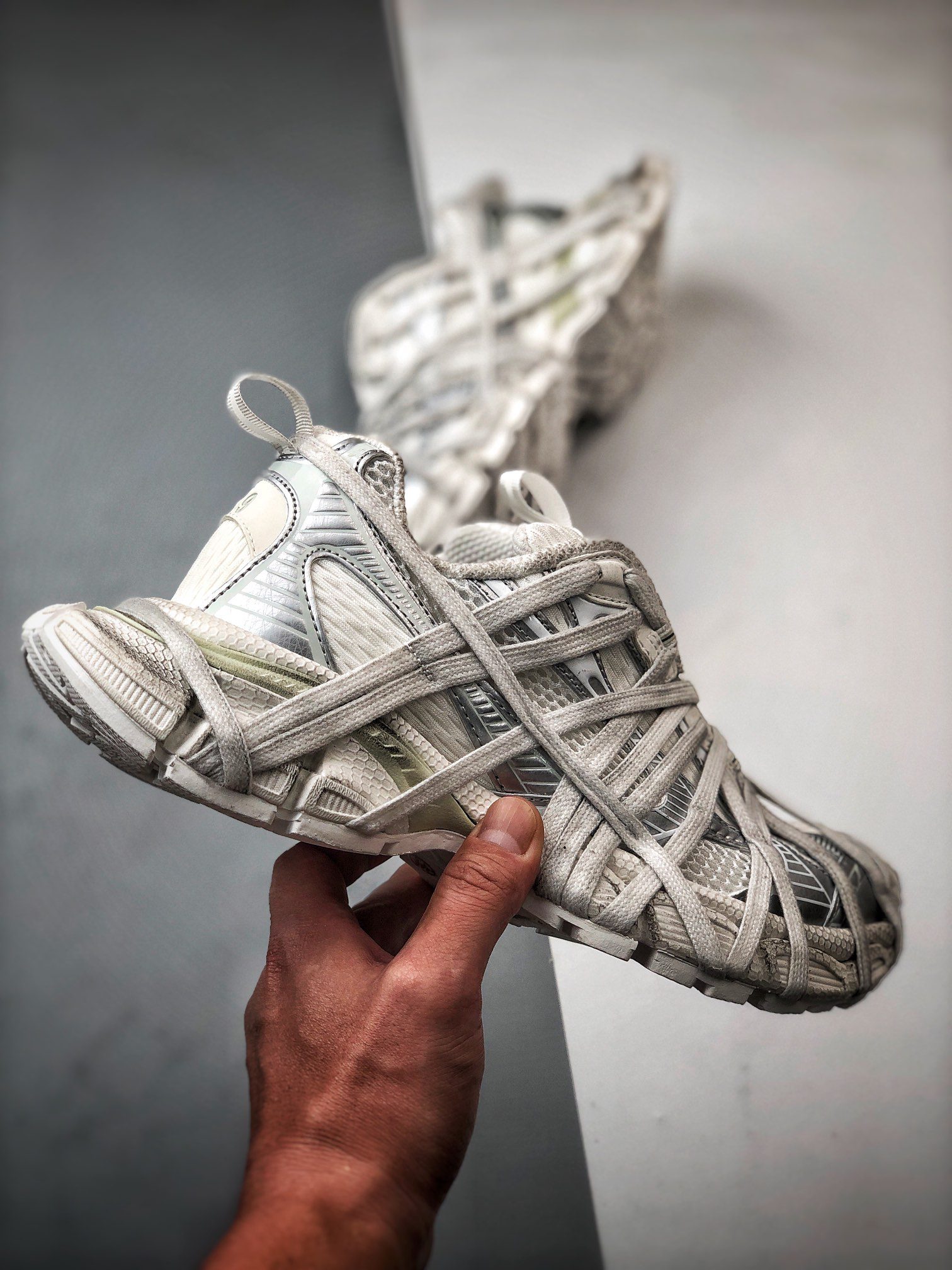 The Balenciaga men’s 3XL Extreme Lace sneaker in white is a standout piece that blends avant-garde design with a nod to early 2000s running shoes. This sneaker features a heavily distressed white mesh upper accented with silver faux-leather trim, creating a worn-in, edgy aesthetic. Its signature detail is the lace-up design that wraps decoratively around the foot, giving it a unique spider web effect. The sneaker also includes reflective detailing, a round toe, and a chunky rubber sole for both style and comfort. Designed with a slip-on style and branded insole, the Balenciaga men’s 3XL Extreme Lace sneaker in white offers a bold statement for fashion-forward individuals. Crafted from polyester, polyurethane, fabric lining, and rubber sole, this sneaker balances durability with high-end style. Whether for casual wear or making a fashion statement, the Balenciaga men’s 3XL Extreme Lace sneaker in white is a must-have for sneaker enthusiasts.