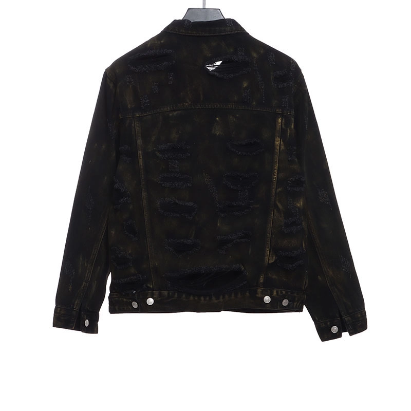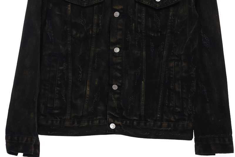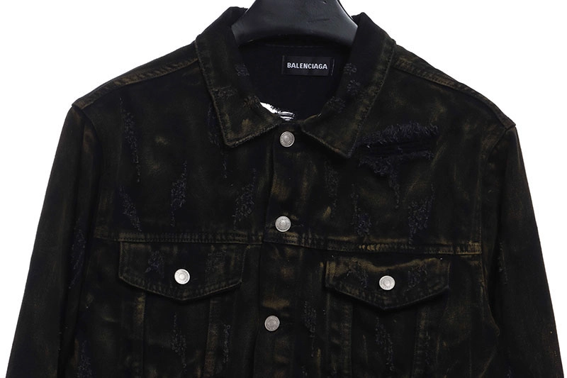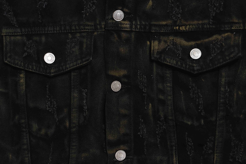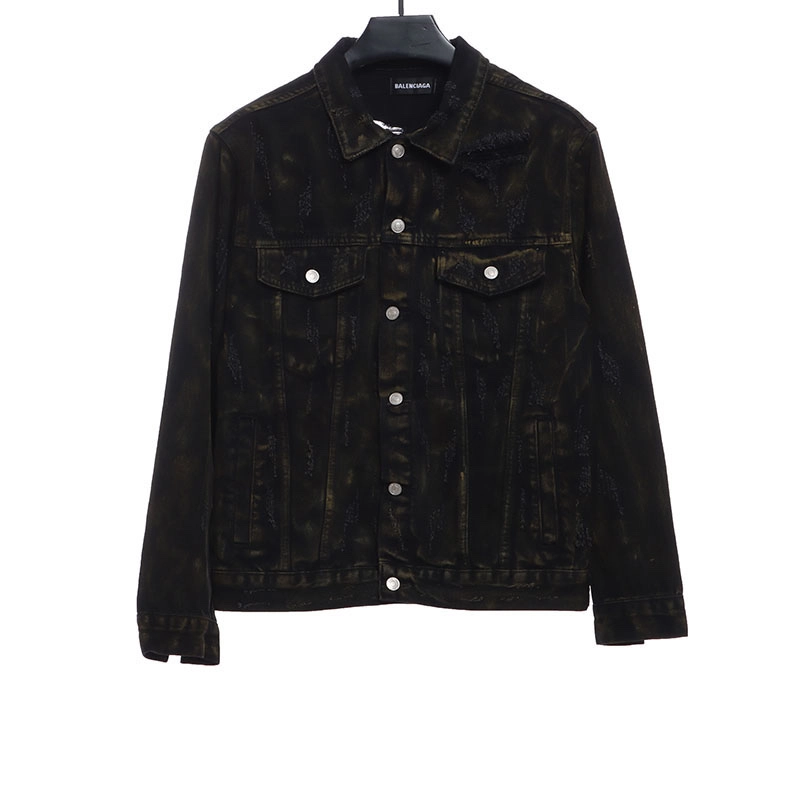 The Balenciaga mud dyed all over printed ripped denim jacket is a standout piece that combines edgy streetwear with high fashion. This jacket features a unique mud-dyed effect that gives it a distressed, vintage look, enhanced by all-over Balenciaga prints and intentional rips throughout the denim fabric. Crafted from premium materials, it offers an oversized fit with dropped shoulders, making it both stylish and comfortable. The jackets design includes detailed repairs and a rugged aesthetic that perfectly captures Balenciagas avant-garde approach. Whether layered or worn alone, the Balenciaga mud dyed all over printed ripped denim jacket elevates any outfit with its bold, artistic flair. This jacket is a must-have for fashion enthusiasts seeking a distinctive, high-quality denim piece that stands out in any wardrobe. Experience the perfect blend of luxury and street style with the Balenciaga mud dyed all over printed ripped denim jacket.