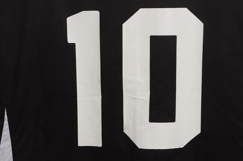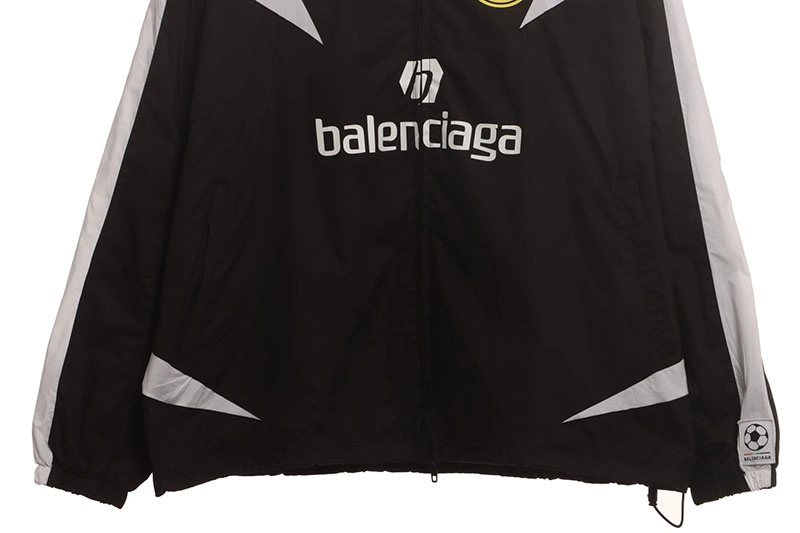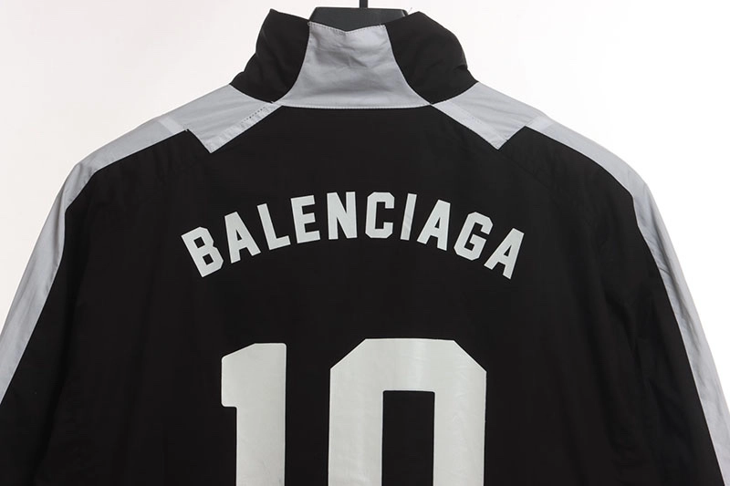 Balenciagas commitment to quality is evident in the Soccer Splicing No 10 Jacket, which uses original 80-count plain weave high-density polyester fabric for durability and a refined finish. The jackets laser draping technique enhances its structure, ensuring a sleek silhouette that complements its oversized design. Available in classic black and white colorways, this jacket incorporates embroidered logos and splicing details that add depth and texture. Its long sleeves and regular length make it suitable for various seasons, while the snap button front provides easy wearability. This jacket is part of Balenciagas 22FW collection, showcasing the brands ability to blend football-inspired elements with luxury streetwear. Ideal for mens fashion, it fits true to size and pairs well with casual or sporty outfits. Whether youre a fan of varsity jackets or looking for a unique piece to elevate your wardrobe, the Balenciaga Soccer Splicing No 10 Jacket offers a stylish and functional option that stands out in any setting.