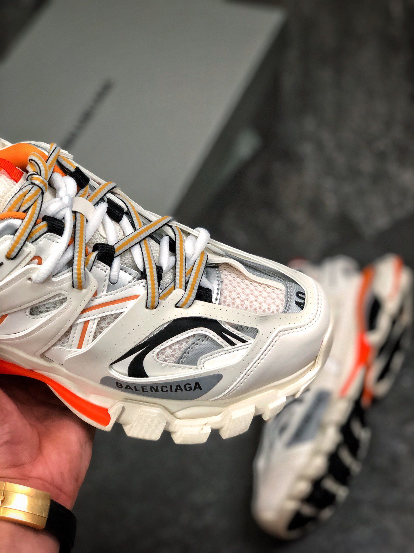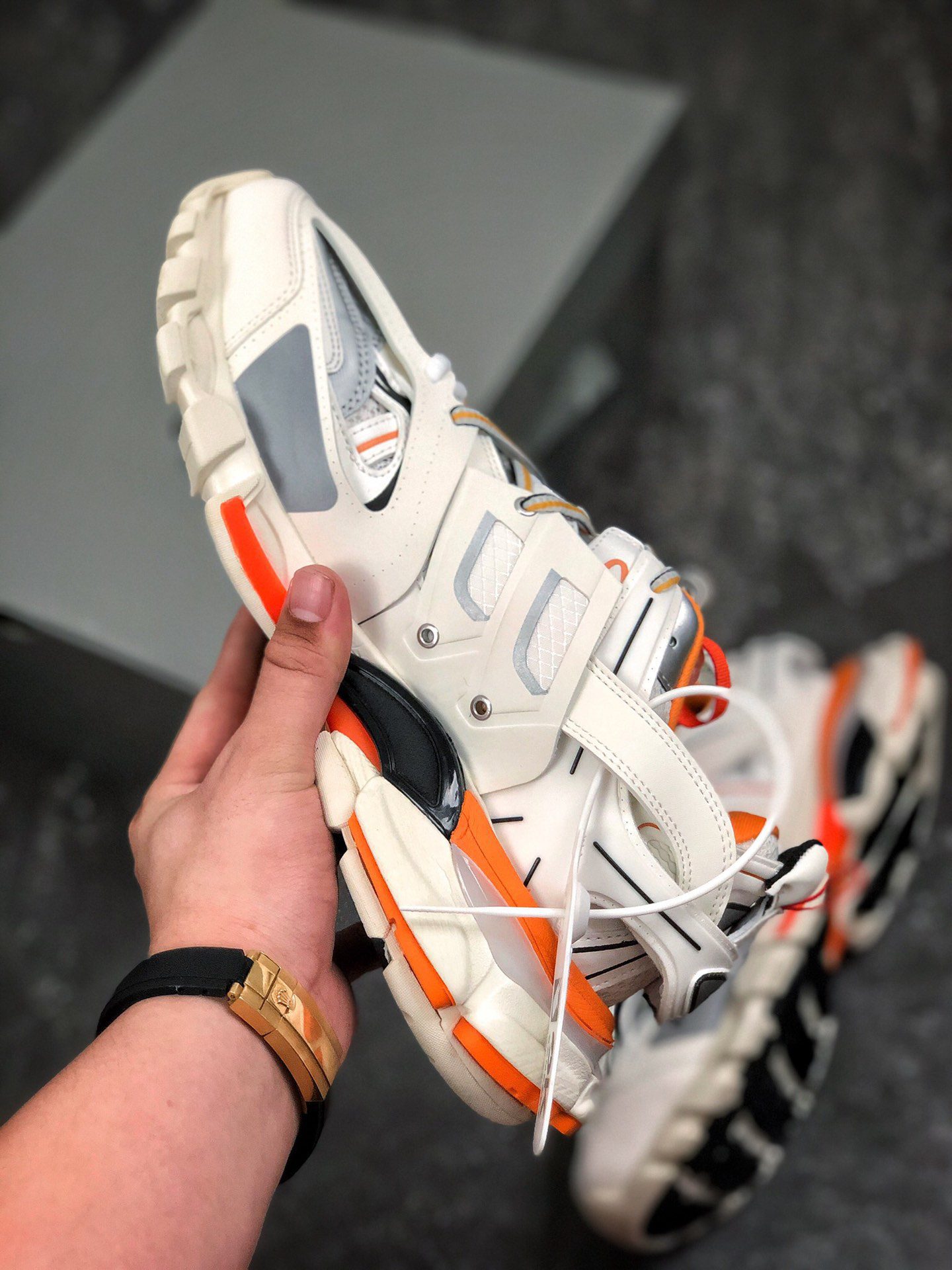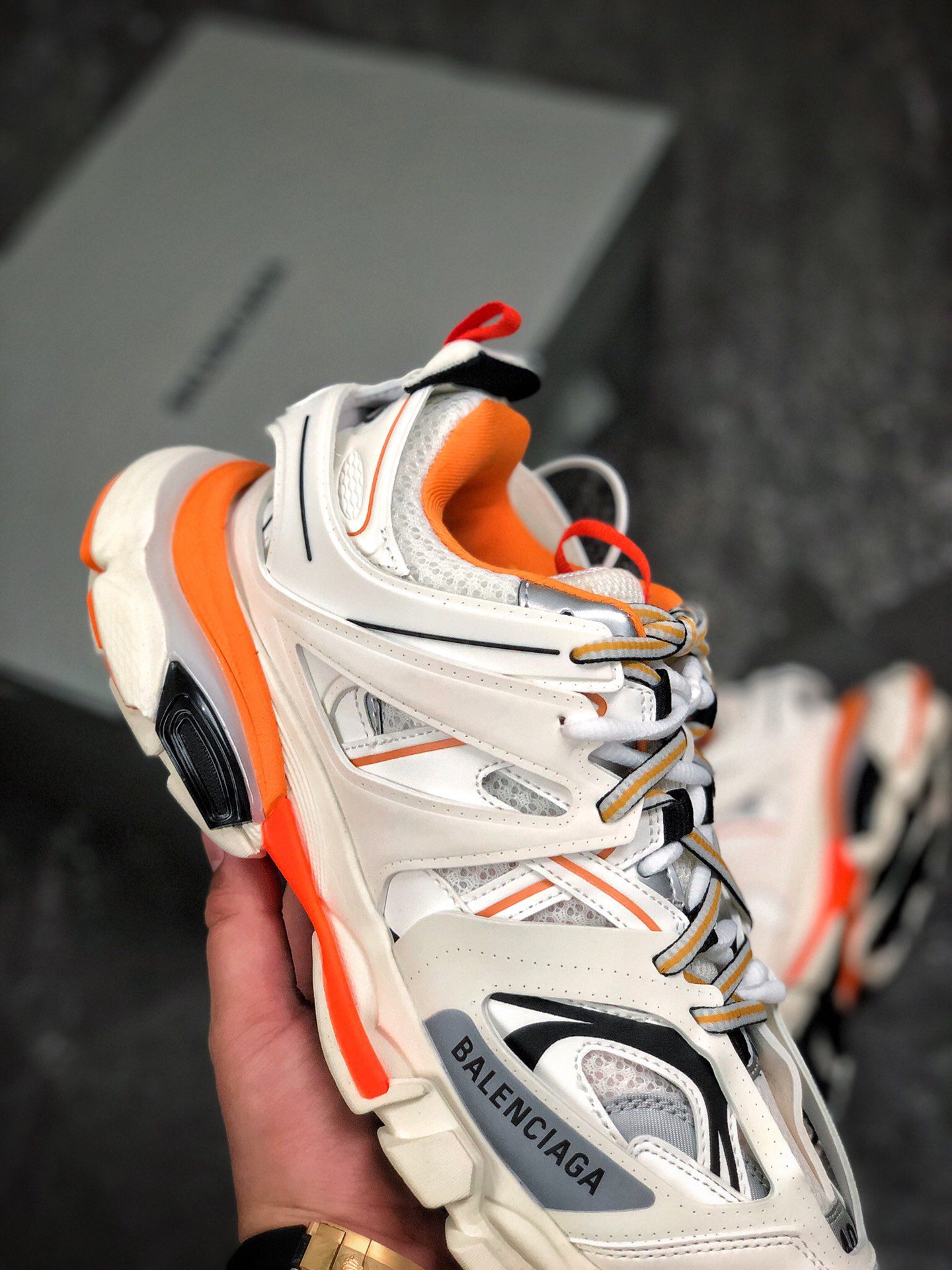 The Balenciaga Track sneaker in white and orange mesh and nylon is a standout model known for its layered design and technical construction. Featuring a combination of breathable mesh and durable nylon panels, this sneaker offers both comfort and style. The shoe is leather-free, emphasizing a modern, sporty aesthetic with a washed effect for a well-worn look. Key design elements include the written size at the edge of the toe, the Track embossing on the heel, and the BB logo embossed on the outsole front. Its dynamic sole with an augmented back ensures enhanced comfort, while double laces and pull tabs on the back and tongue add functional details. The Balenciaga Track sneaker in white and orange mesh and nylon is a versatile choice for those seeking a high-fashion sneaker with a technical edge[1][2][3].