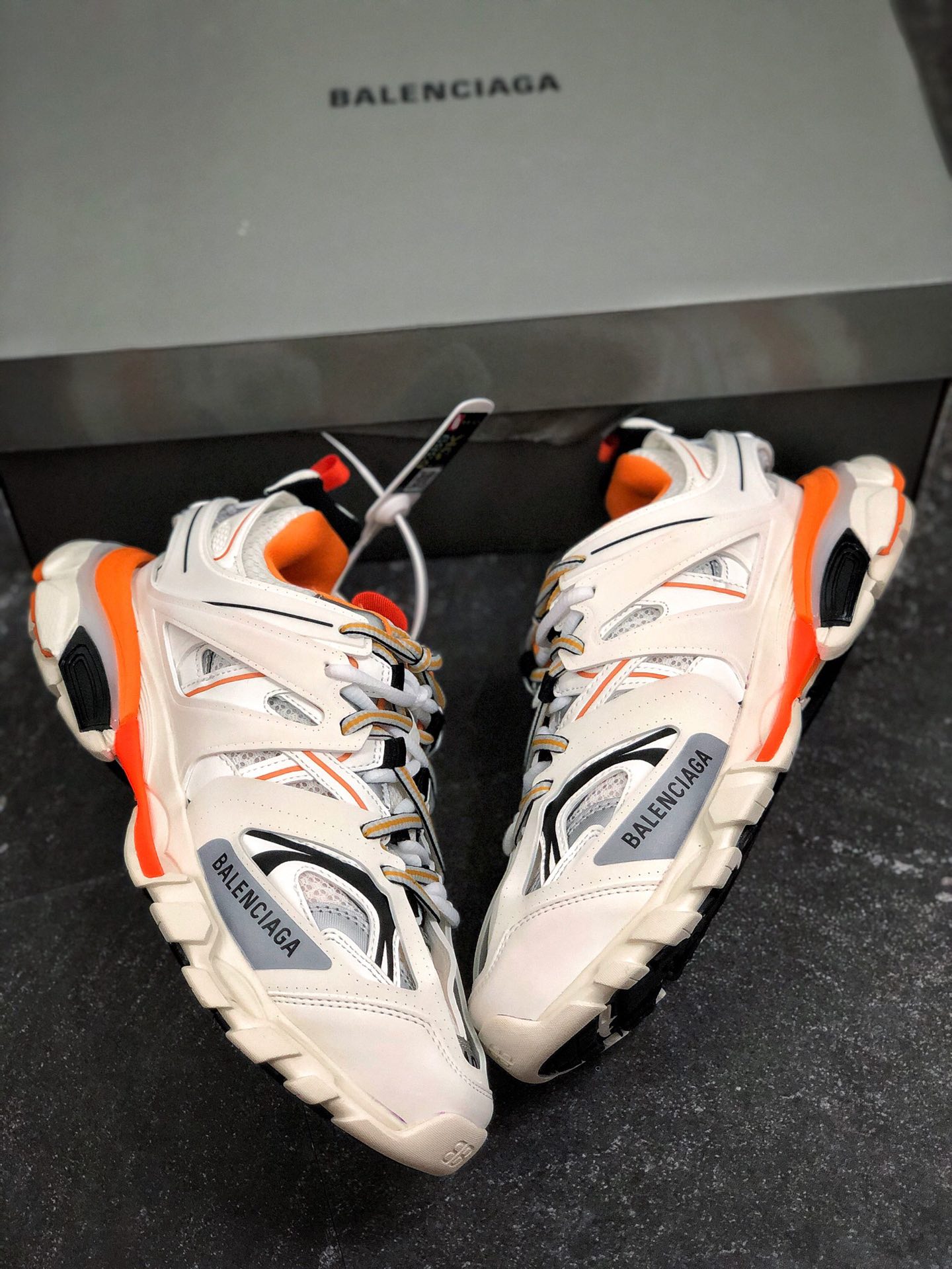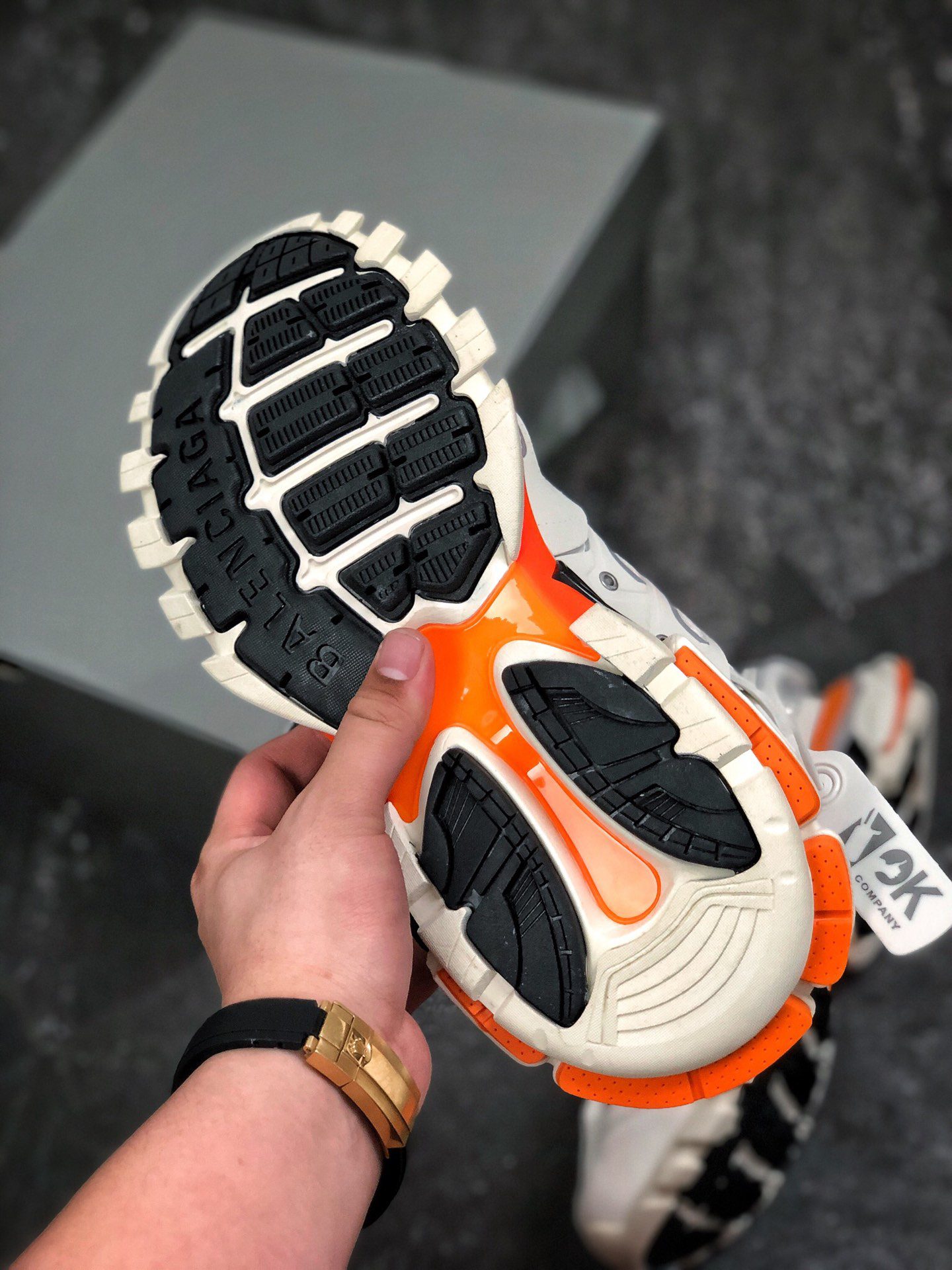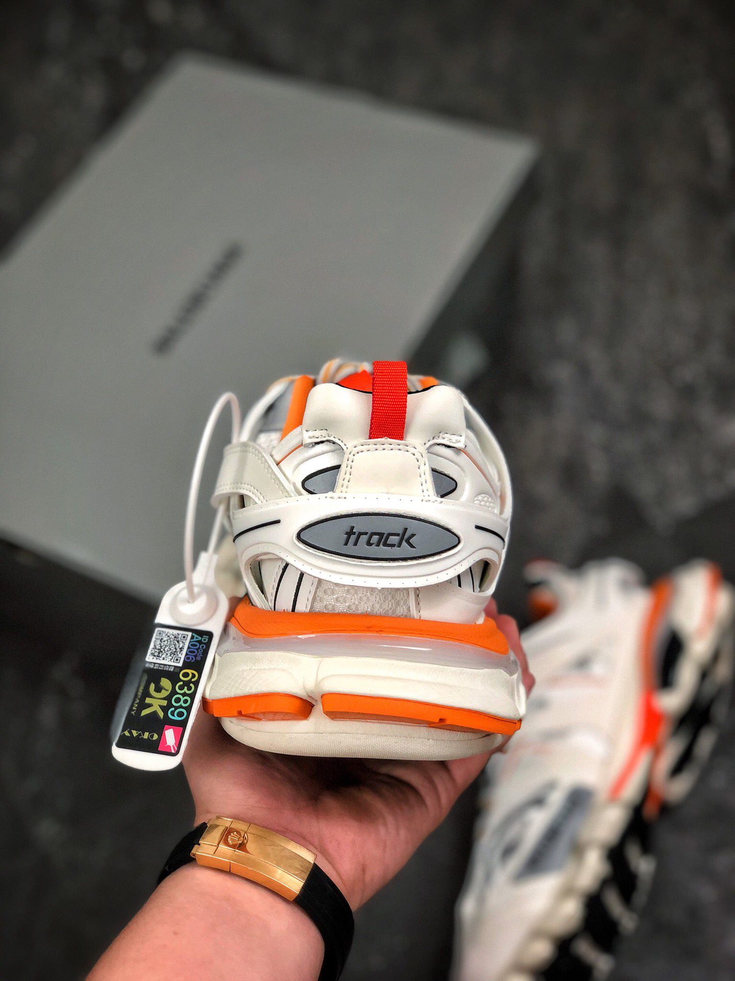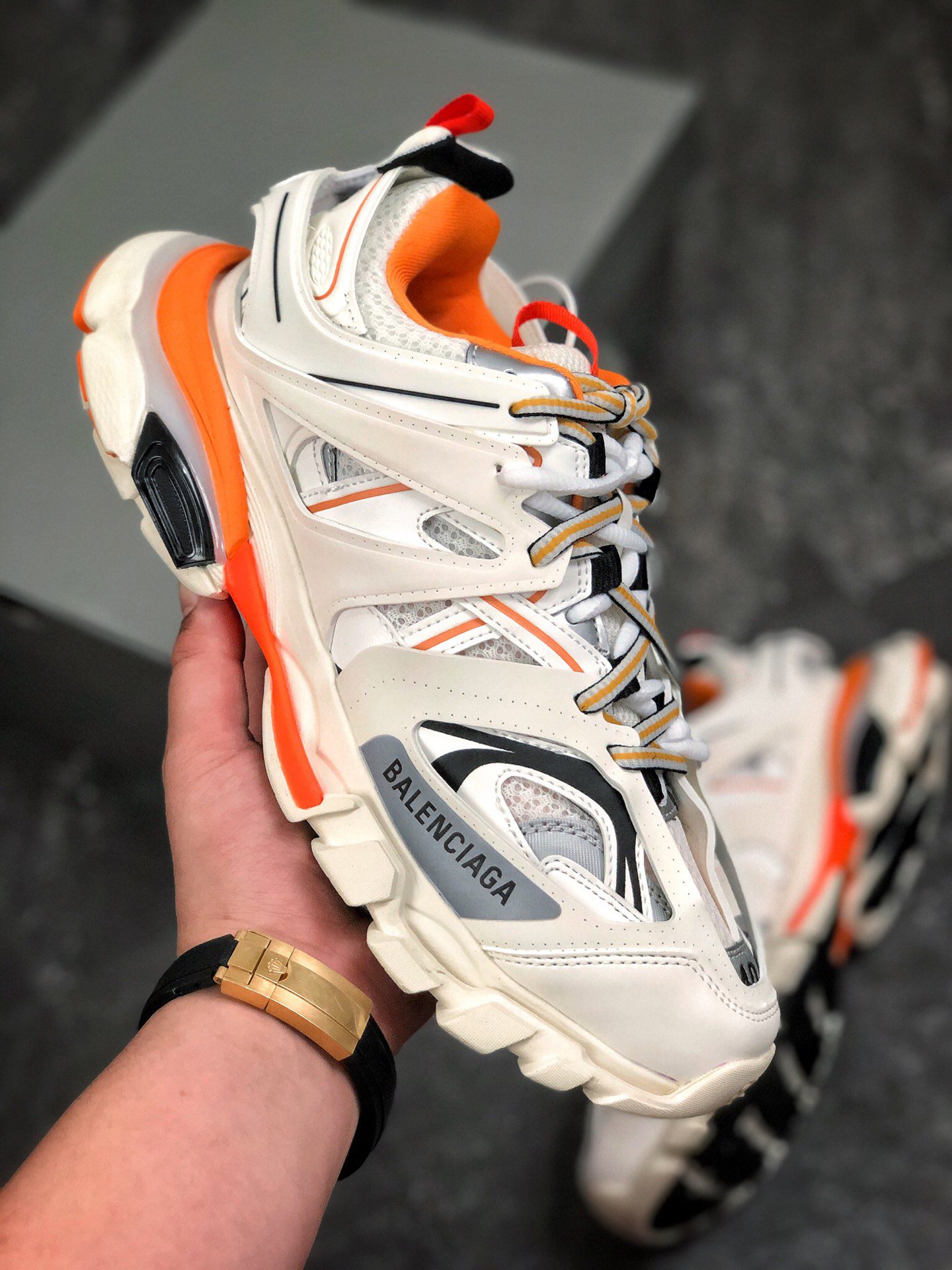 The Balenciaga Track sneaker in white and orange mesh and nylon is a standout model known for its layered design and technical construction. Featuring a combination of breathable mesh and durable nylon panels, this sneaker offers both comfort and style. The shoe is leather-free, emphasizing a modern, sporty aesthetic with a washed effect for a well-worn look. Key design elements include the written size at the edge of the toe, the Track embossing on the heel, and the BB logo embossed on the outsole front. Its dynamic sole with an augmented back ensures enhanced comfort, while double laces and pull tabs on the back and tongue add functional details. The Balenciaga Track sneaker in white and orange mesh and nylon is a versatile choice for those seeking a high-fashion sneaker with a technical edge[1][2][3].