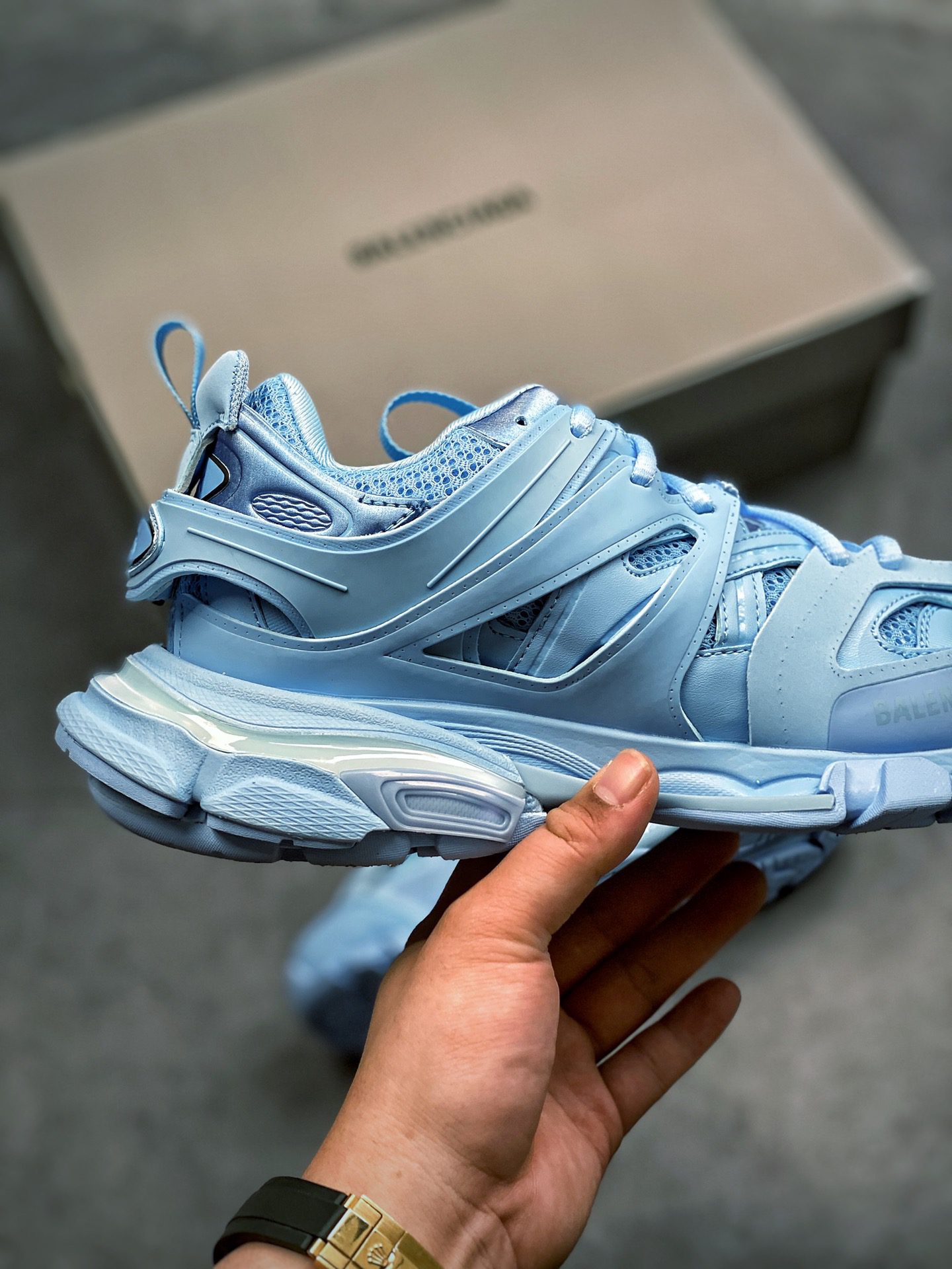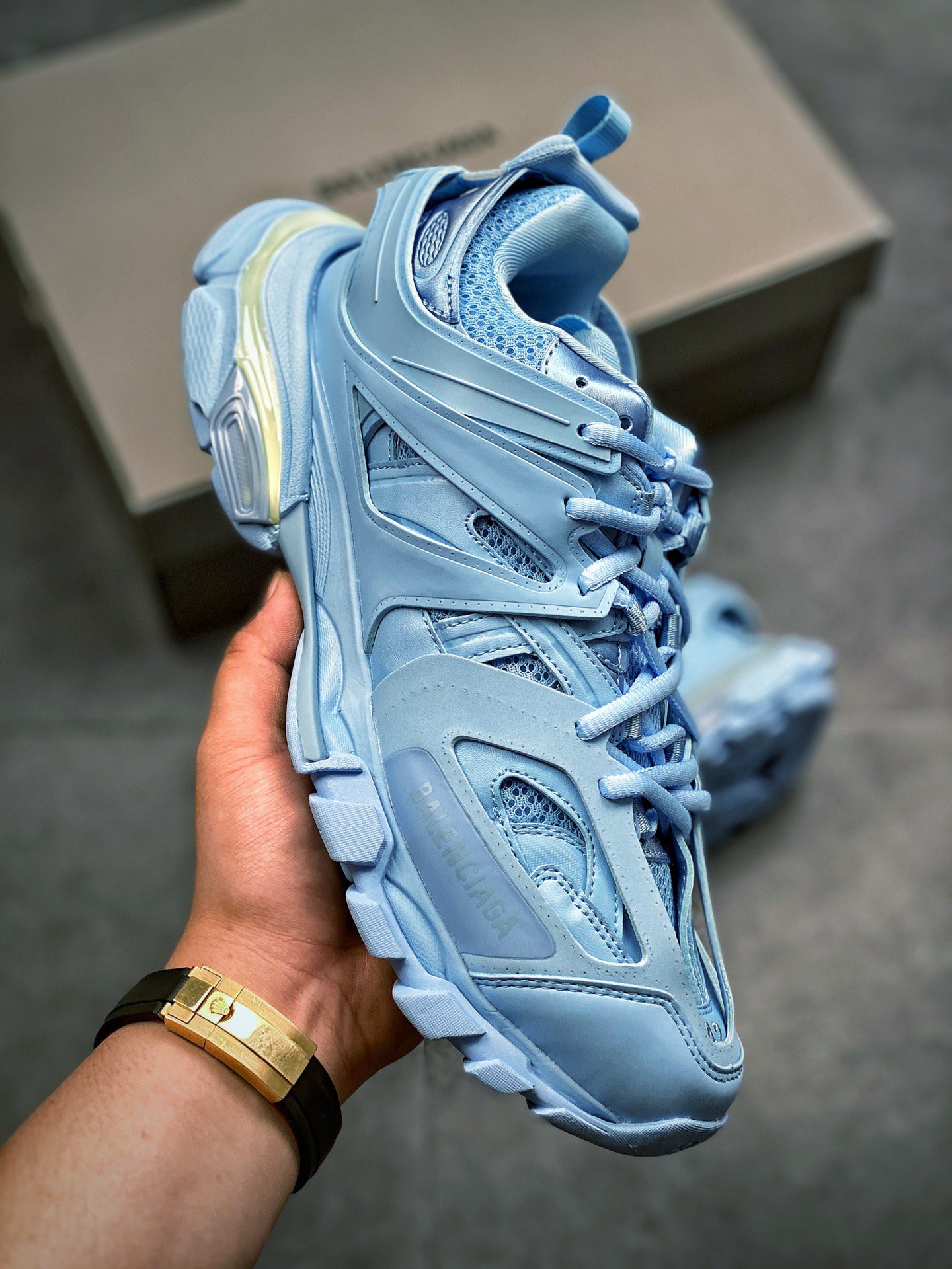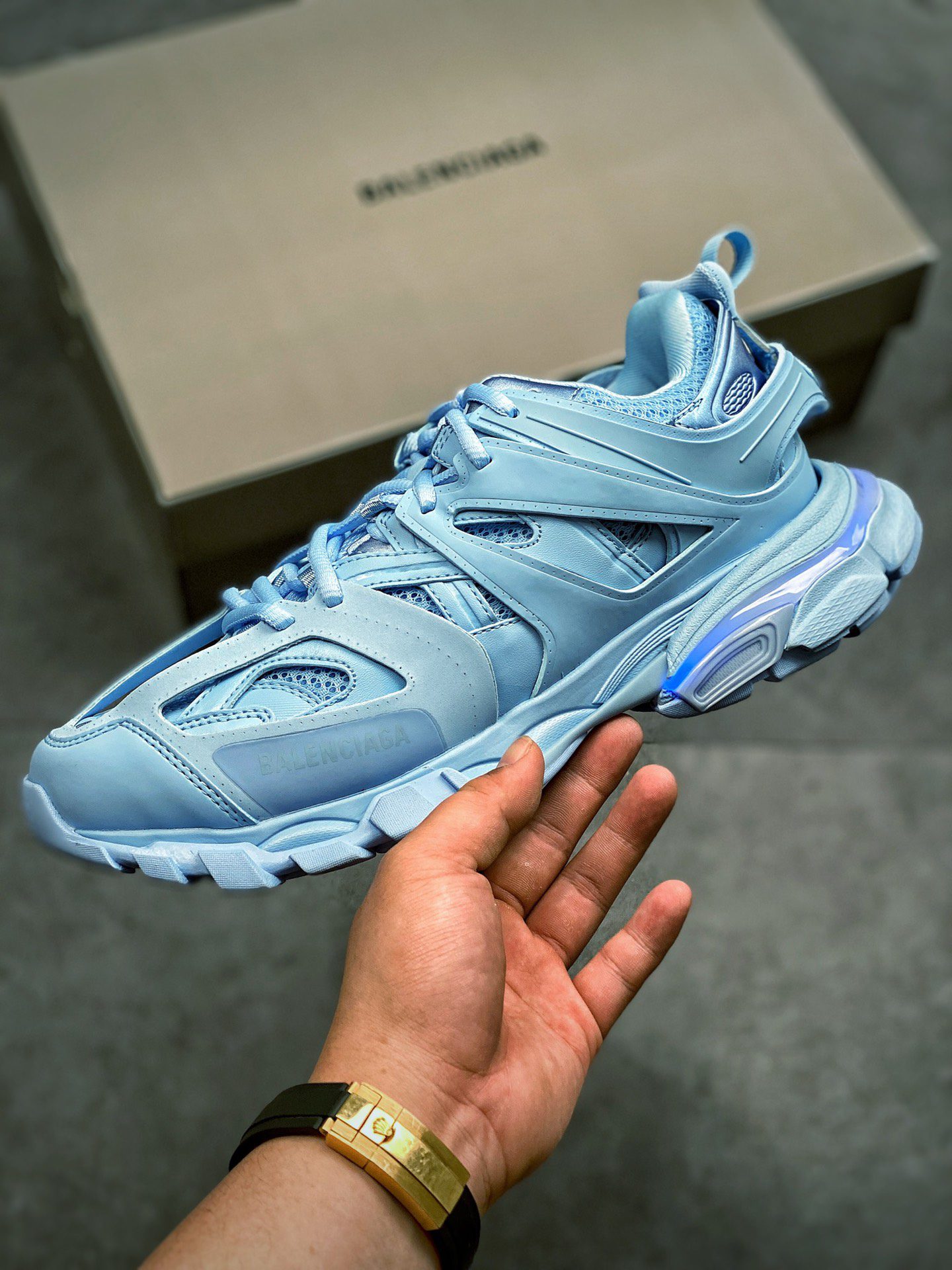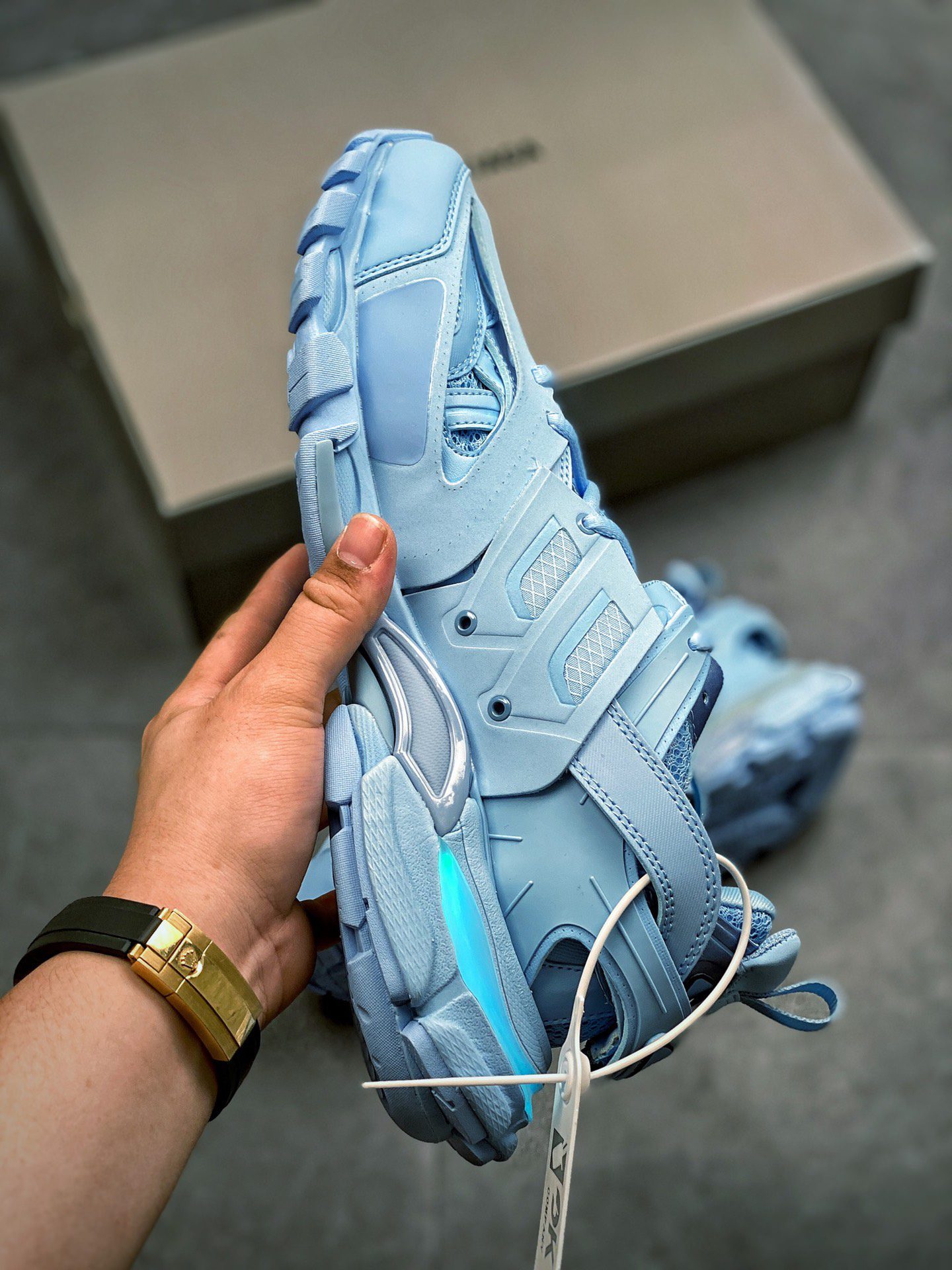 The Balenciaga Track Sneaker LED Light Blue 1.0 is a standout luxury sneaker that combines high fashion with innovative technology. Featuring a multi-paneled upper with cord laces and a layered sole with foam cushioning and reinforced rubber outsole, this sneaker offers both style and comfort. What sets this model apart is the integrated LED light in the heel, which illuminates in various colors, adding a futuristic edge to the classic trail-inspired design. Embossed branding on the tongue, side, front, and heel enhances its premium look. The Balenciaga Track Sneaker LED Light Blue 1.0 is perfect for those seeking a bold statement piece that merges fashion and tech seamlessly. This sneaker is a must-have for collectors and fashion enthusiasts alike, showcasing Balenciagas innovative approach to sneaker design. The Balenciaga Track Sneaker LED Light Blue 1.0 is priced at around $995 and remains a coveted item in the luxury sneaker market.
