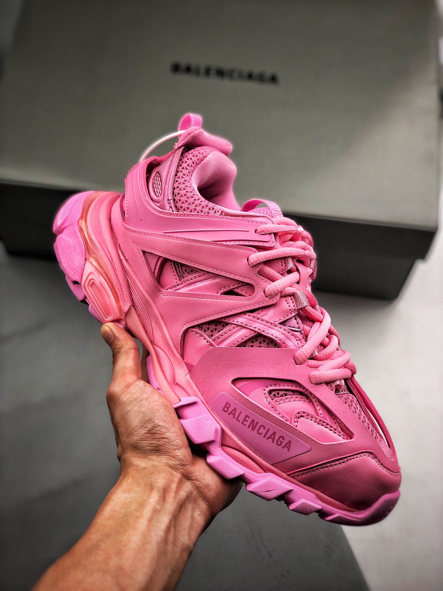 Balenciaga’s Track Trainer series is known for its multi-layered design inspired by vintage hiking and running shoes, combining nylon, mesh, and synthetic leather for durability and breathability. The pink versions, including the LED-enhanced models, maintain this hybrid aesthetic with dual lacing and a dynamic sole that enhances propulsion and comfort. These sneakers fit true to size and are designed to provide a secure, comfortable fit for everyday wear or active use. The LED feature adds a futuristic touch, cycling through colors like red, green, blue, and purple, making the sneaker stand out in low-light settings. Balenciagas commitment to craftsmanship is evident in the detailed construction and choice of materials, such as 75% polyurethane, 21% polyester, and 4% nylon, ensuring both style and functionality. Available in various sizes, these sneakers are shipped worldwide with free express options, reflecting the brands global appeal and luxury status.