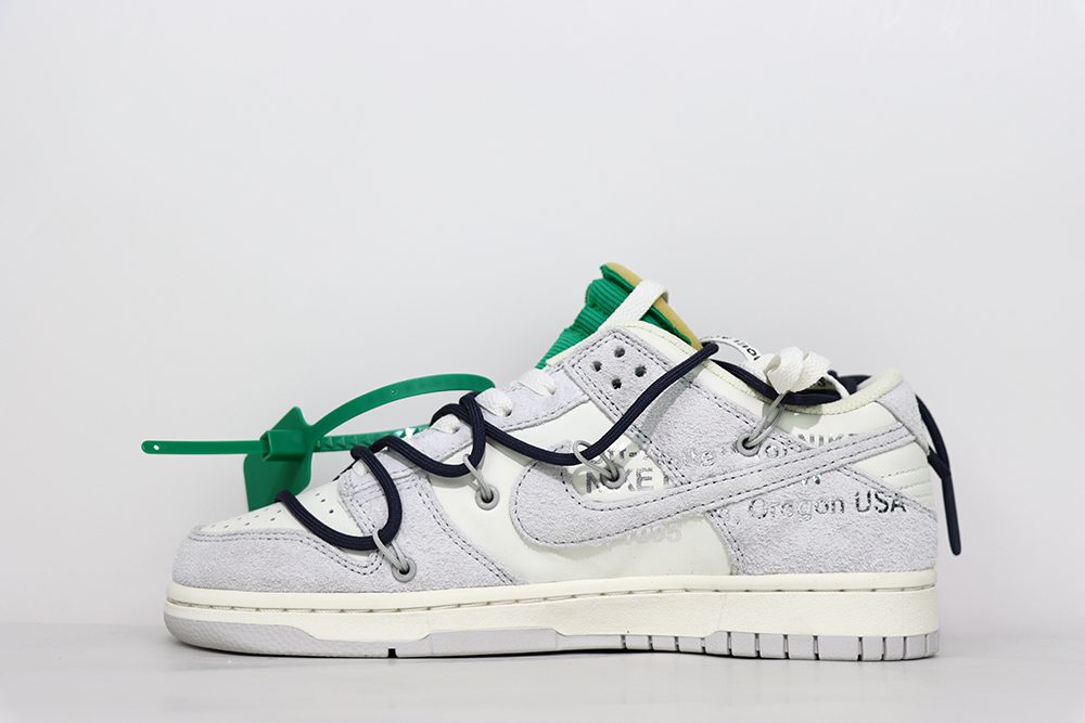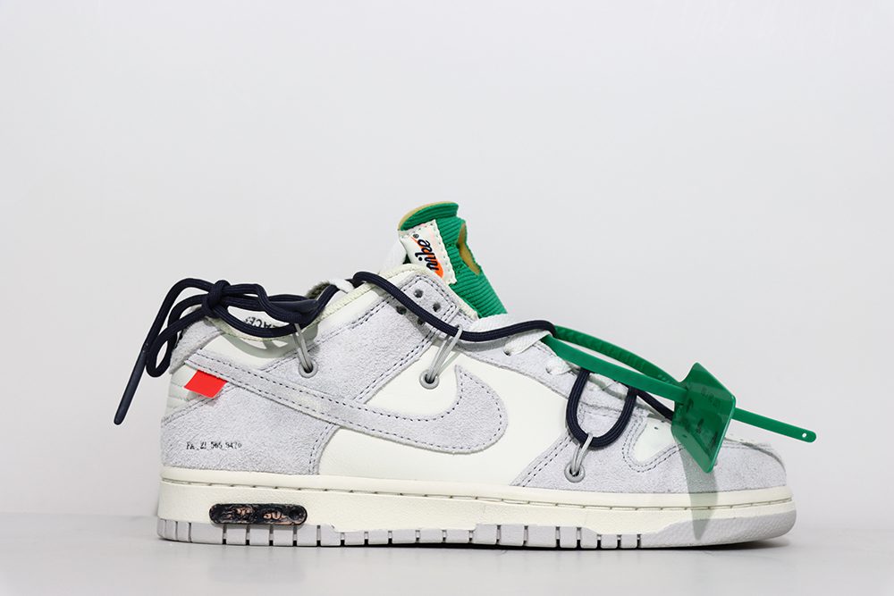 The Nike Dunk Low Off White Lot 20 is part of a limited series, often referred to as Off White Dunk 20 of 50, highlighting its exclusivity within the Off White Dunk collection. This sneaker features a light grey and sail colorway with suede upper material, giving it a premium feel and look. The Off White Dunk Low Lot 20 includes signature Virgil Abloh design touches such as printed Helvetica text and a plastic zip tie, which are iconic elements in Off White collaborations. The Lot 20 Off White Dunk is celebrated for its unique details like a vintage-style exposed foam tongue with a vibrant green tag and a serial number marking its place in the limited run. This model combines the classic Nike Dunk Low silhouette with Off White’s deconstructed aesthetic, making it a must-have for fans of both brands. Whether styled casually or as a collector’s piece, the Off White Dunk Low Lot 20 offers a blend of comfort, style, and exclusivity.