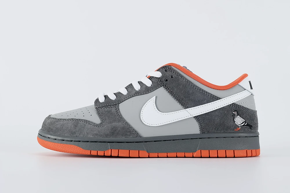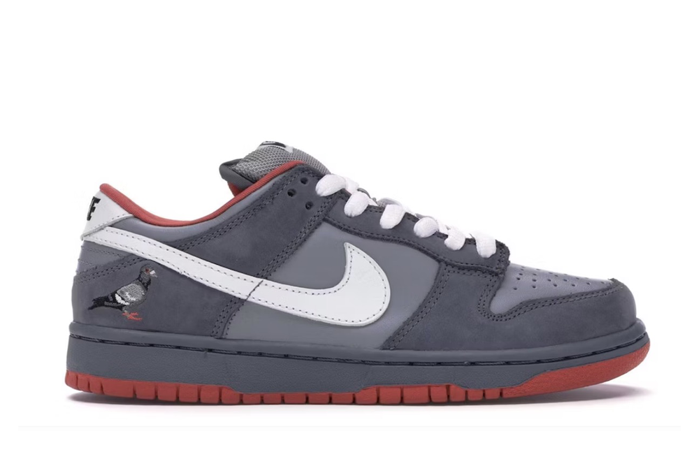 The Nike Dunk SB Low Staple NYC Pigeon is an iconic sneaker first released in 2005, designed by Jeff Staple. This model features a distinctive medium gray and dark gray upper with a white Swoosh and red accents on the lining and outsole. The standout detail is the embroidered pigeon logo on the lateral heel, symbolizing New York City’s most common bird. The sneaker caused a frenzy upon release, leading to police intervention due to massive crowds. Its unique colorway and limited production make the Dunk SB Low Staple NYC Pigeon a highly sought-after collector’s item. The shoe combines style and skateboarding technology, including Zoom Air cushioning, making it both fashionable and functional. The Nike Dunk SB Low Staple NYC Pigeon remains a legendary piece in sneaker culture and is celebrated for its design and historical significance.