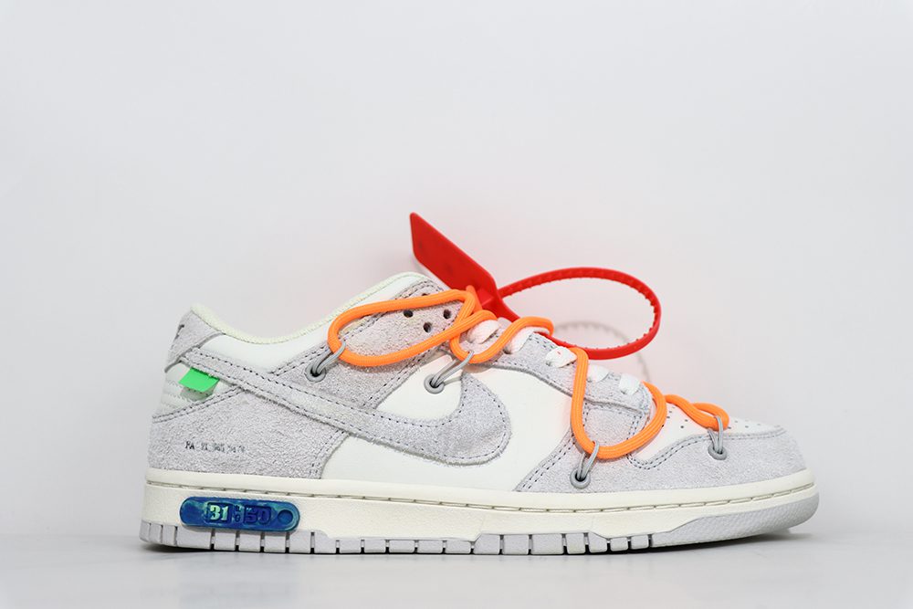 The Dunk x Off White Lot 31 is a highly sought-after sneaker from the exclusive ‘Dear Summer’ collection by Virgil Abloh and Nike. This limited edition Dunk Low features a clean white leather upper combined with soft grey suede overlays, accented by Off-White’s signature design elements such as a plastic zip tie, exposed foam tongue, and printed Helvetica text. A distinctive ’31 of 50′ badge on the lateral midsole marks its rarity, making the Dunk x Off White Lot 31 a prized piece for collectors and sneaker enthusiasts alike. Released in August 2021, this collaboration blends classic Dunk aesthetics with Off-Whites modern, deconstructed style, ensuring it stands out in any sneaker rotation. The Dunk x Off White Lot 31 perfectly balances style and exclusivity, embodying the innovative spirit of Virgil Ablohs design legacy.