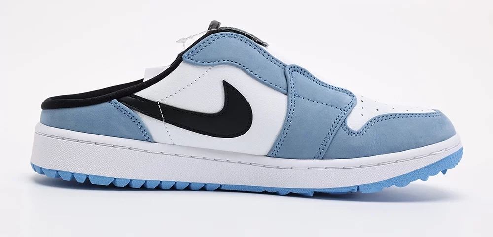 The Jordan 1 Mule Golf University Blue is a fresh take on the classic Air Jordan 1, designed specifically for golf enthusiasts seeking style and comfort. This slip-on mule version features a full-grain leather base with plush University Blue suede overlays, inspired by Michael Jordan’s alma mater, UNC. Its synthetic leather gusseted tongues allow for easy on and off, while memory foam cushioning ensures all-day comfort on the green or off. The perforated design enhances breathability, and the sturdy outsole provides excellent grip for golf performance. Priced at $110, the Jordan 1 Mule Golf University Blue blends iconic sneaker aesthetics with practical golf functionality, making it a standout choice for both golfers and sneaker collectors alike. This model perfectly balances heritage style with modern convenience, embodying the spirit of the Air Jordan 1 mule golf university blue.