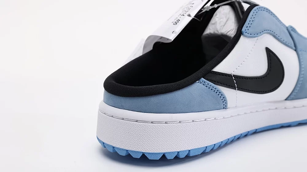 The Air Jordan 1 Mule Golf University Blue, also known by its SKU FJ1214-400, launched in March 2024 and quickly gained attention for its unique slip-on design tailored for golfers. Unlike traditional golf shoes, the Jordan 1 Golf Mule offers hands-free wearability without sacrificing style, featuring a crisp white leather base contrasted by black Swoosh logos and interior lining. This design pays homage to the iconic University Blue colorway, a favorite among Jordan Brand fans. Nike’s Air Jordan 1 Mule Golf ‘University Blue’ combines smooth suede panels with durable leather, ensuring easy maintenance and comfort. The shoe’s memory foam cushioning and perforations provide breathability and support during long rounds. Beyond the golf course, the Jordan 1 Golf Mule University Blue appeals to sneakerheads for casual wear, sparking calls for a standard sole version. Whether referred to as the Nike Air Jordan 1 Mule Golf University Blue or simply the Jordan 1 Golf Mule University Blue, this model represents a stylish fusion of sport and streetwear culture.