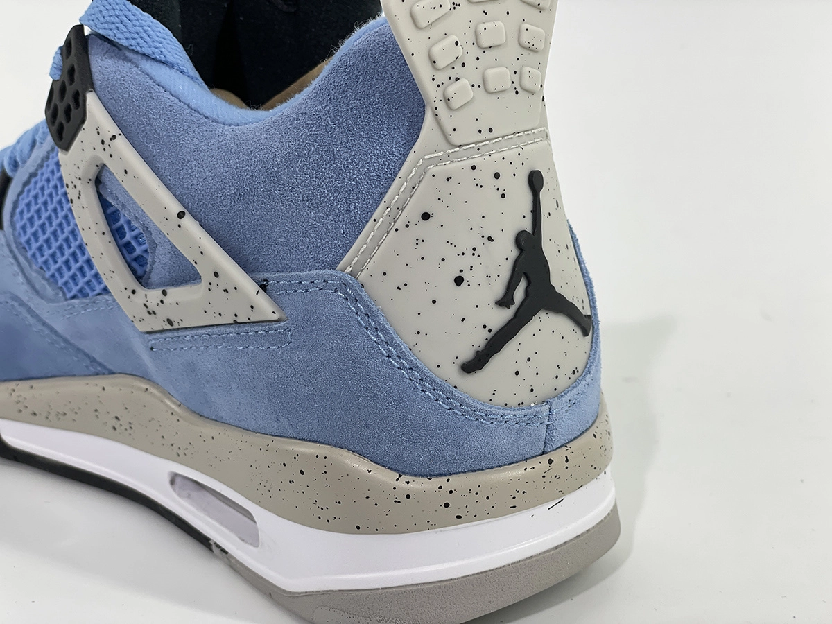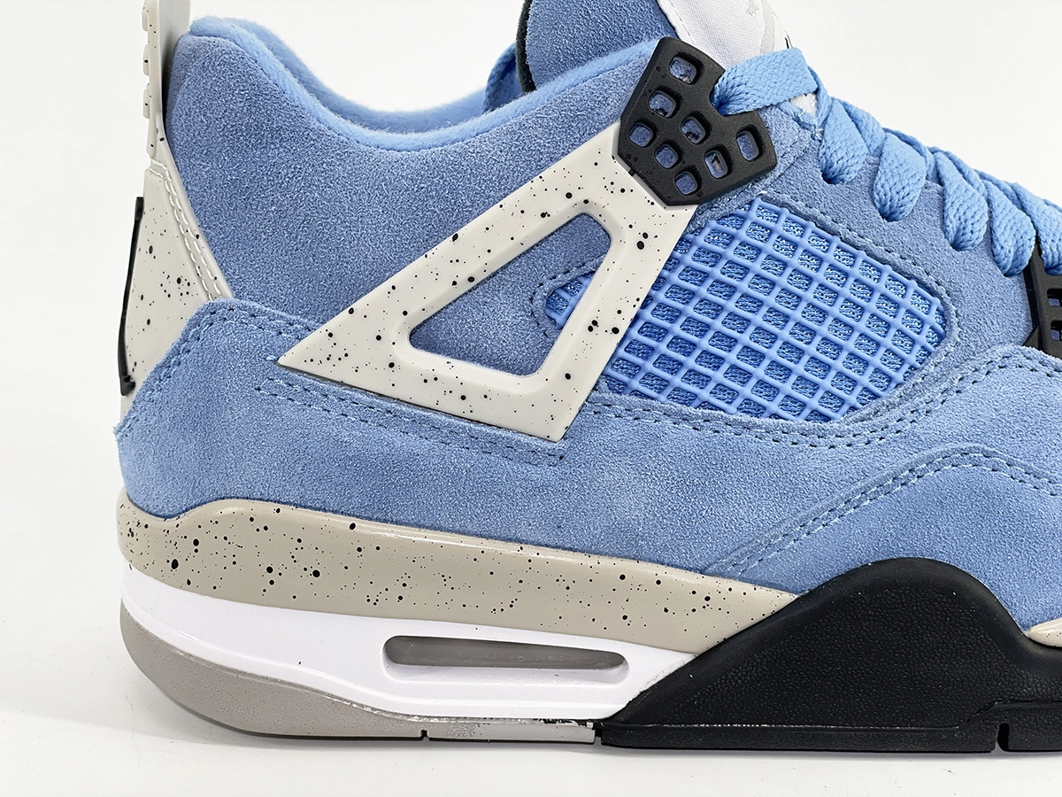 The Jordan 4 University Blue is a standout sneaker celebrated for its premium suede upper in the iconic University Blue shade, paying homage to Michael Jordan’s alma mater, the University of North Carolina. Released in April 2021, this Air Jordan 4 features a blend of University Blue, Tech Grey, White, and Black, with suede panels wrapping the toe, heel, and profile for a luxurious feel. The sneaker also includes matching netting and laces, complemented by black eyelets and a speckled grey mudguard that adds depth to the design. Its round toe and flat heel make it suitable for lifestyle wear across all seasons. The Jordan 4 University Blue combines style and comfort with cushioning and slip-resistant rubber soles, making it a must-have for collectors and fans alike. This model remains one of the most iconic Jordan 4 releases, with its unique colorway and premium materials setting it apart in the sneaker community.