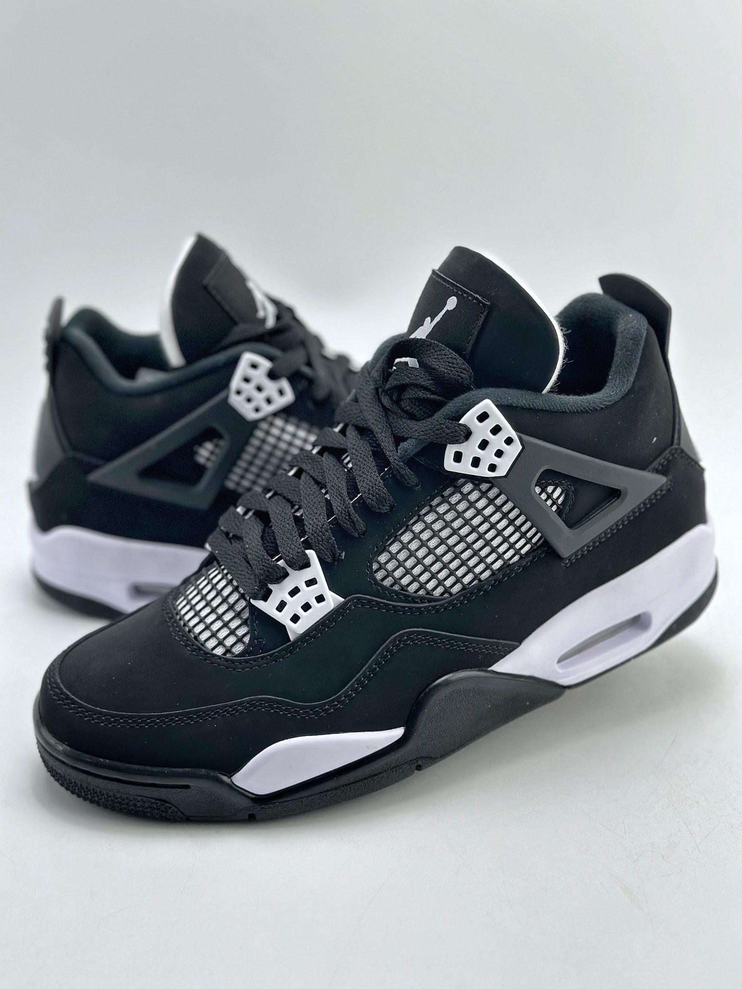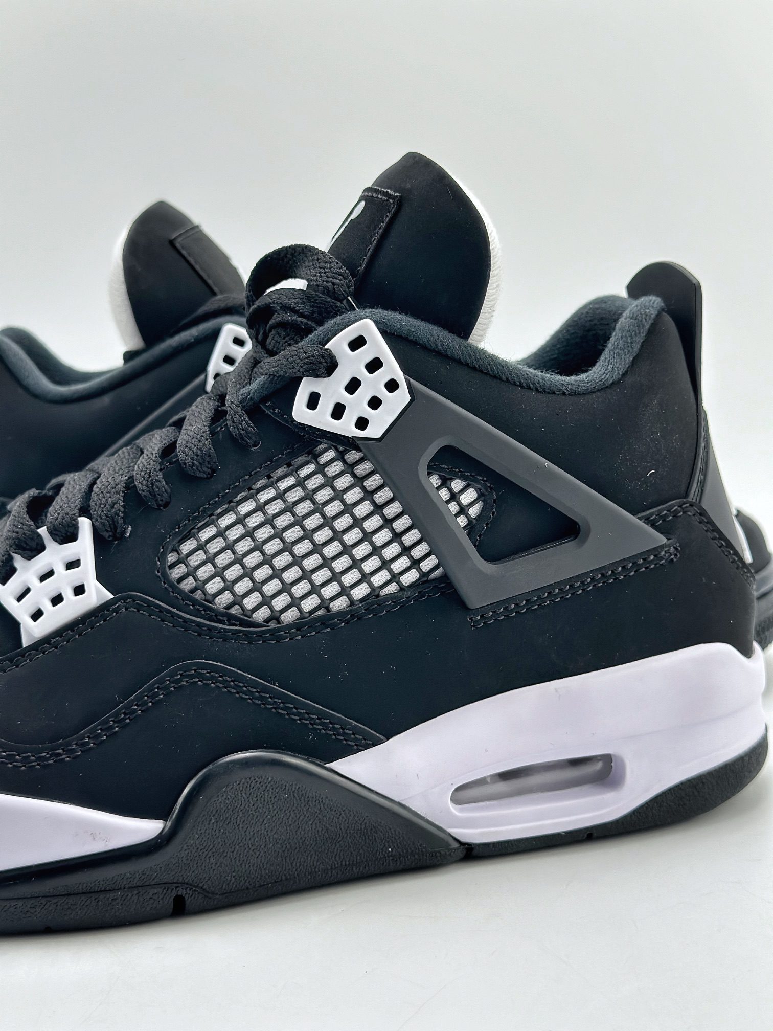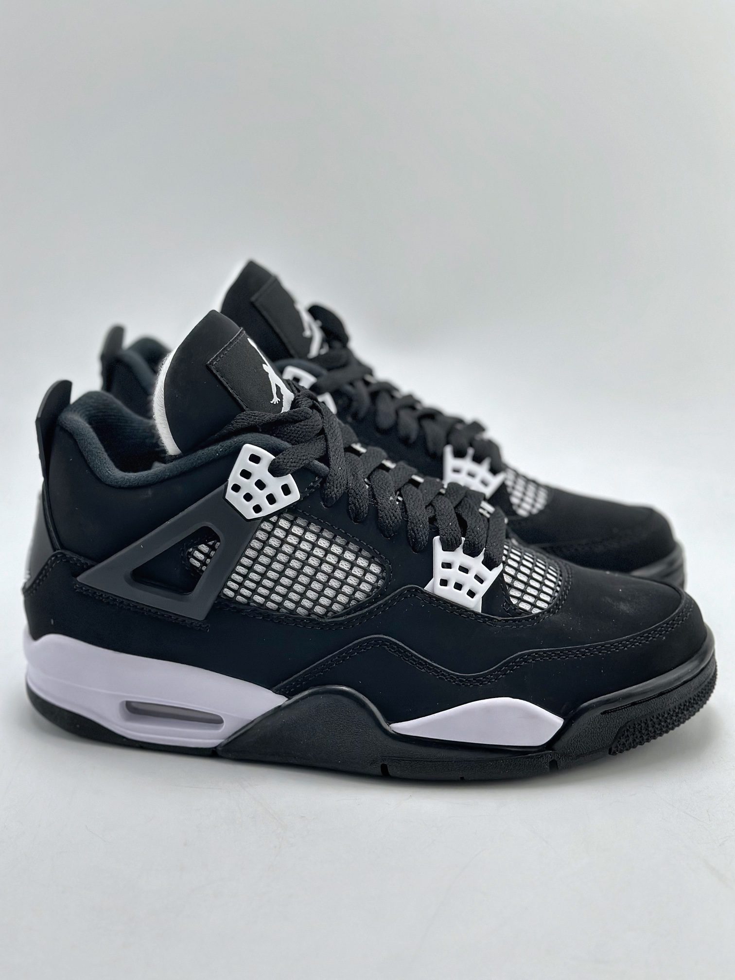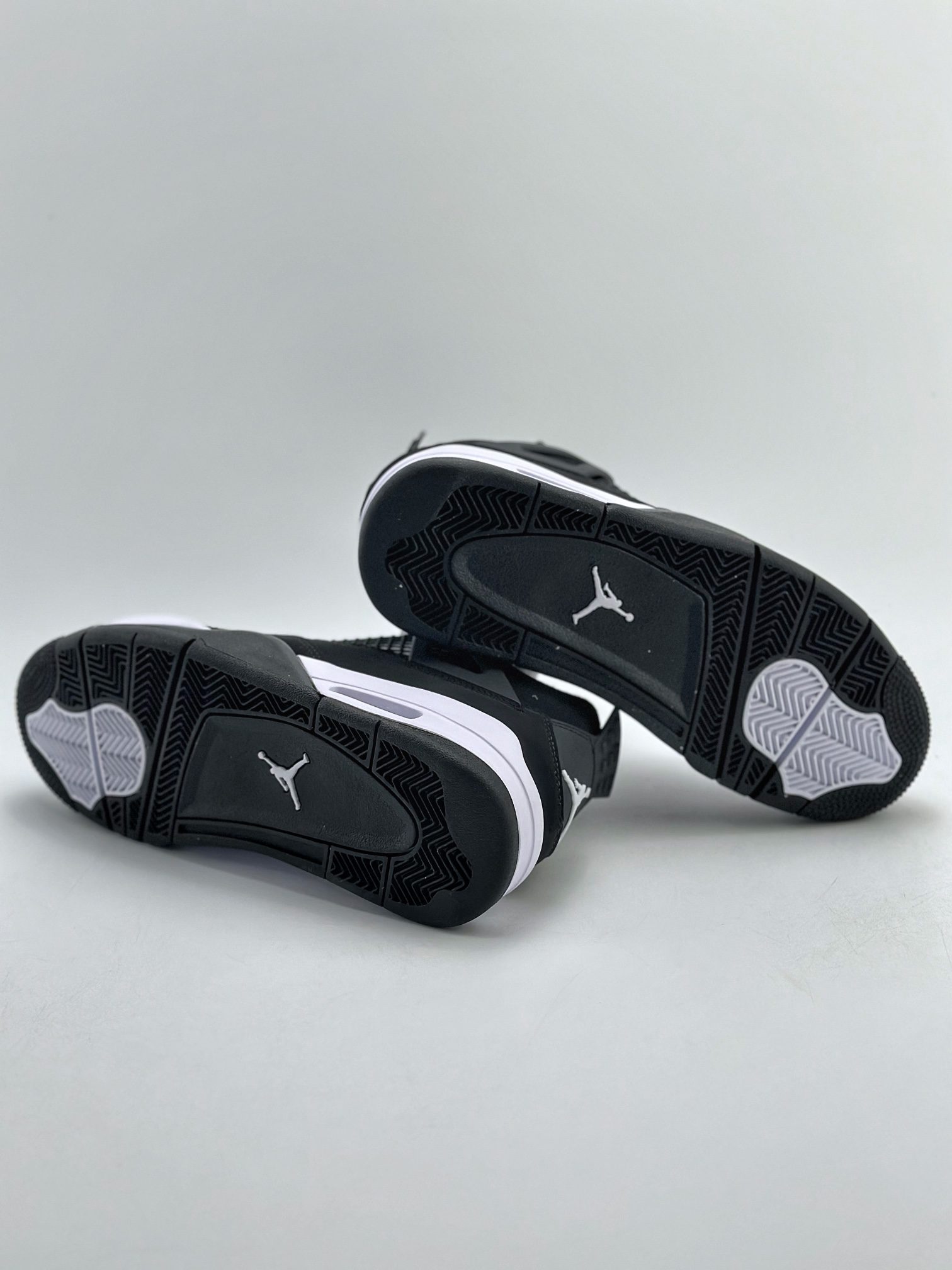 The Jordan 4 White Thunder normal version is crafted with attention to detail, featuring free-floating eyestays at the ankle that secure the foot comfortably when laced. The midsole incorporates Nike Air technology, visible in the heel, providing responsive cushioning and impact protection. The outsole combines black and white rubber with a herringbone traction pattern, delivering excellent grip and durability. This sneaker is available in mens and kids sizes, making it accessible for the whole family. Its black nubuck upper with white accents offers a sleek, modern look while maintaining the classic Jordan 4 silhouette. The shoe fits true to size, though those with wider feet might consider going half a size up. The Jordan 4 White Thunder normal version is praised for its simplicity and style flexibility, making it a staple for both casual wear and sneaker collections.