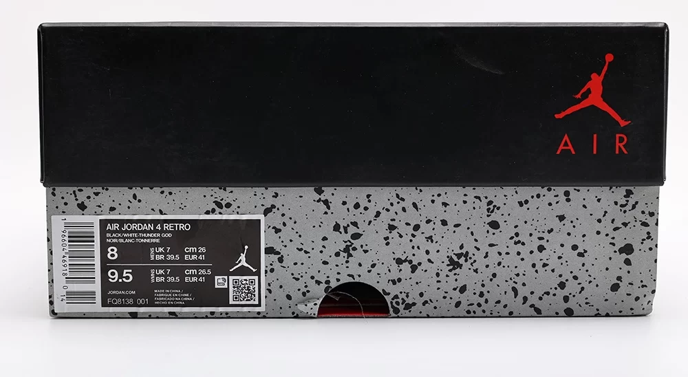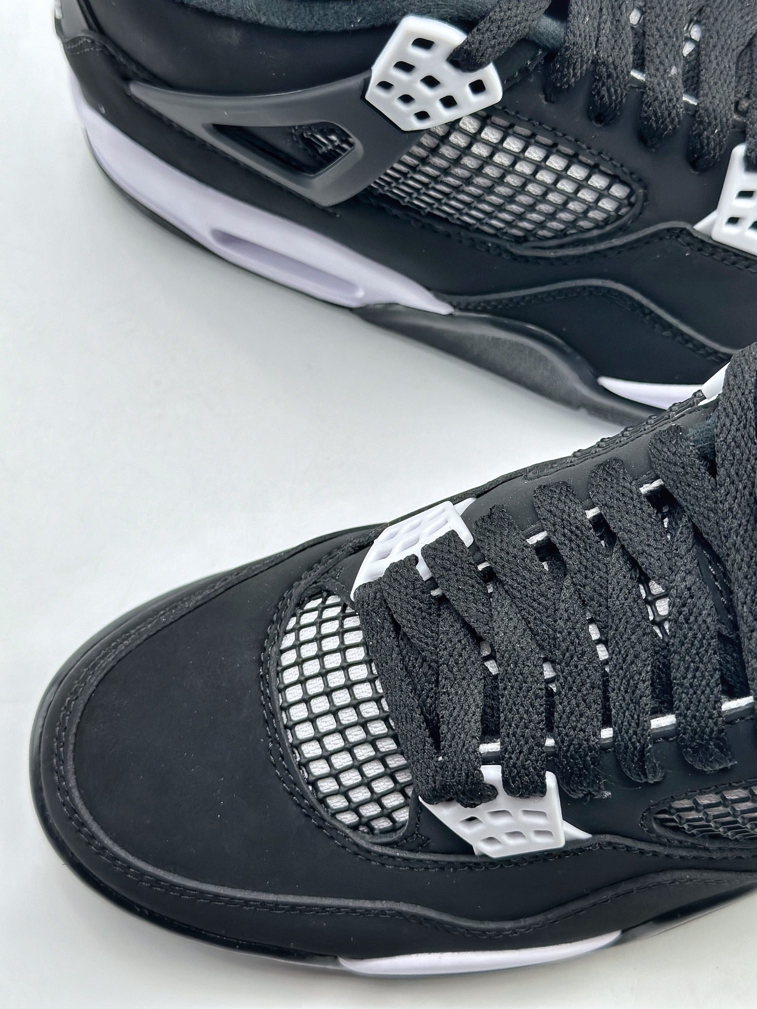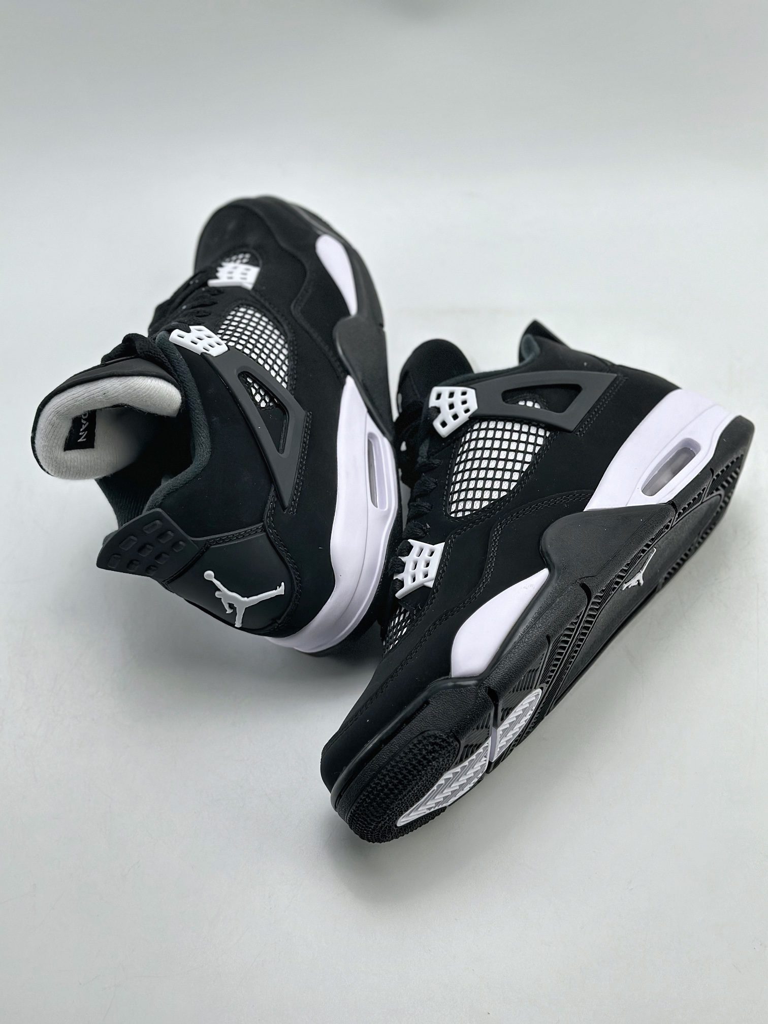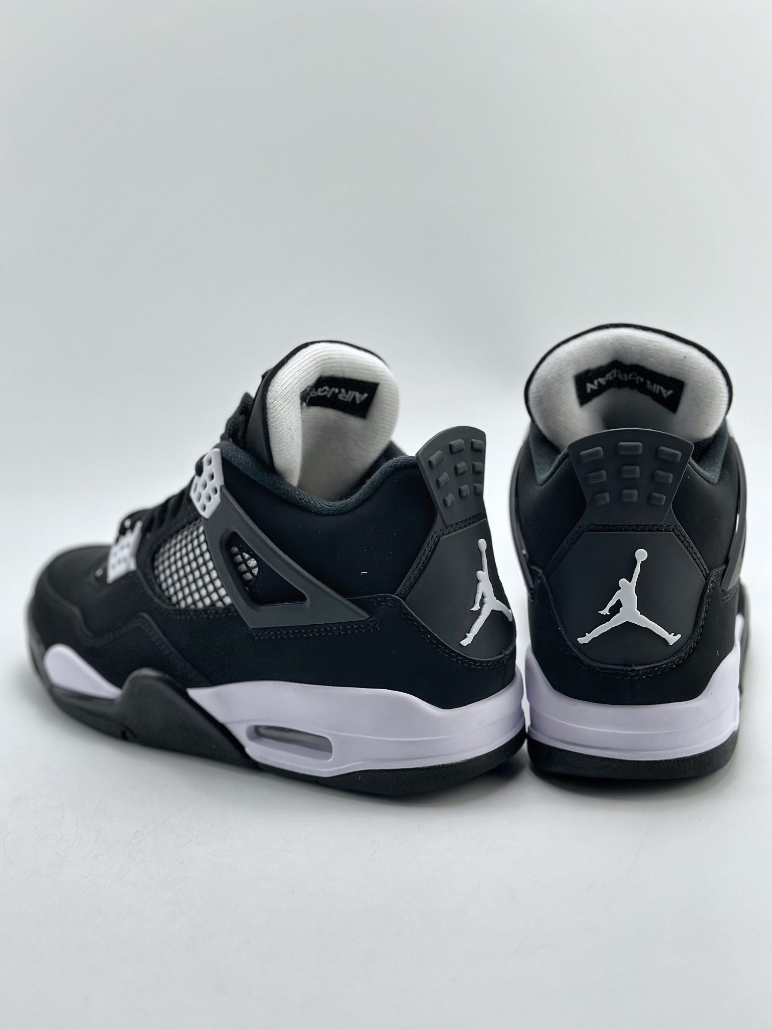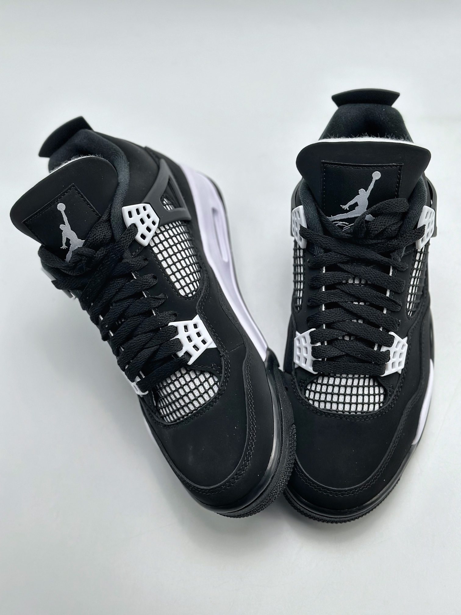 The Jordan 4 White Thunder normal version is crafted with attention to detail, featuring free-floating eyestays at the ankle that secure the foot comfortably when laced. The midsole incorporates Nike Air technology, visible in the heel, providing responsive cushioning and impact protection. The outsole combines black and white rubber with a herringbone traction pattern, delivering excellent grip and durability. This sneaker is available in mens and kids sizes, making it accessible for the whole family. Its black nubuck upper with white accents offers a sleek, modern look while maintaining the classic Jordan 4 silhouette. The shoe fits true to size, though those with wider feet might consider going half a size up. The Jordan 4 White Thunder normal version is praised for its simplicity and style flexibility, making it a staple for both casual wear and sneaker collections.