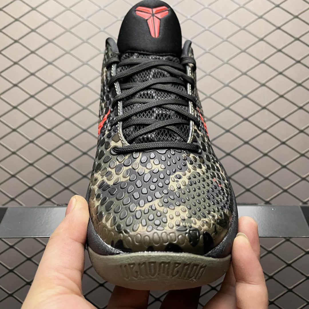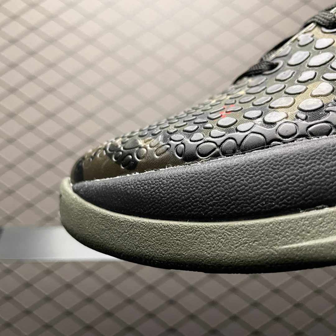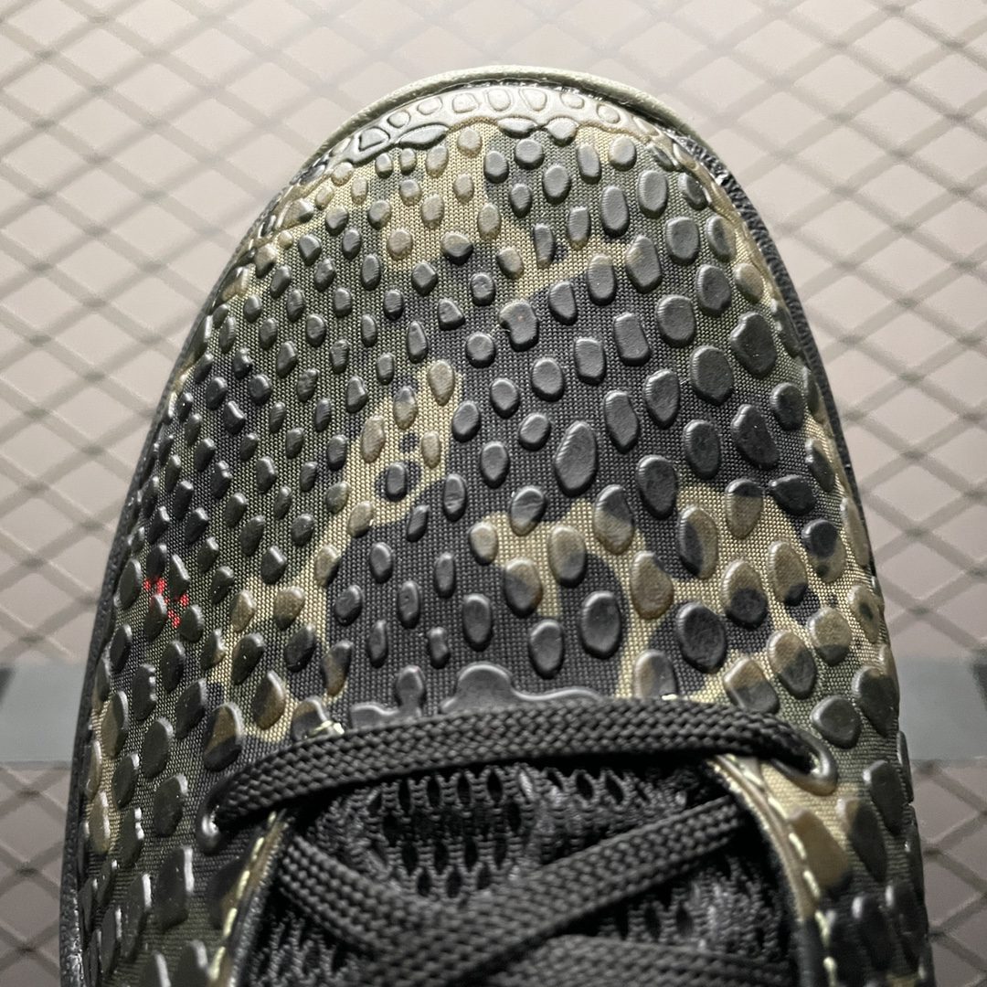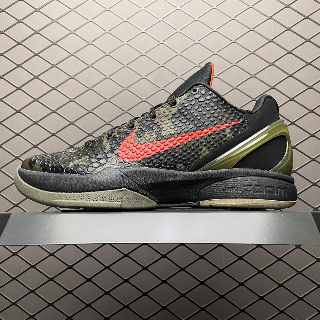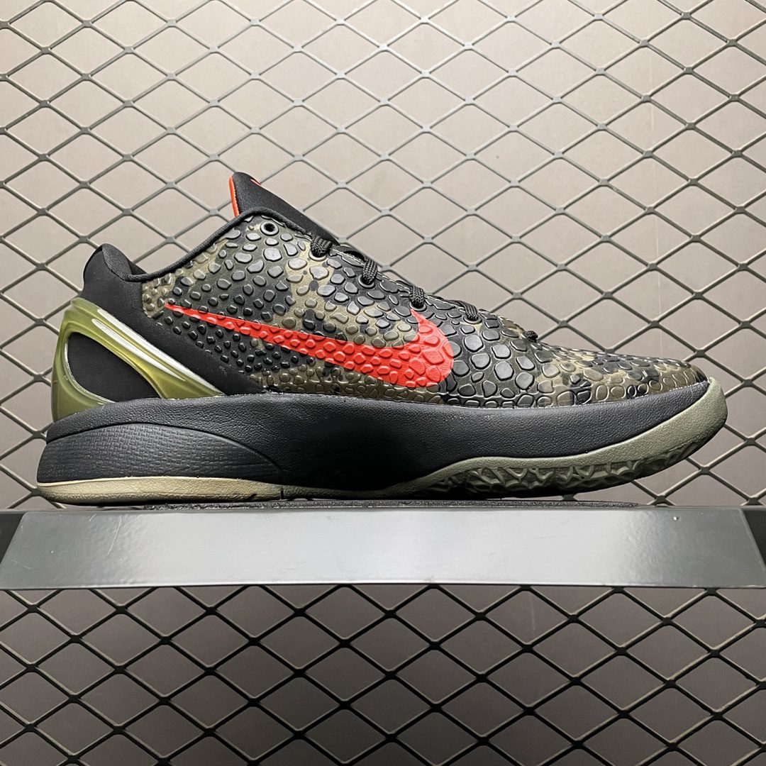 The Nike Kobe 6 Protro Italian Camo (2024) revives the classic silhouette with updated technology and a fresh colorway inspired by Italian military fatigues and the countrys diverse landscape. Known as the Italian Camo Kobe 6, this model features a polyurethane upper with a multicolor camouflage print and the signature snakeskin texture that represents Kobes reptilian alter ego. The men’s Nike Kobe 6 Protro Italian Camo includes a black phylon midsole with Nike Zoom technology for enhanced cushioning and a carbon fiber midfoot shank plate for added support and rigidity. The shoes design also incorporates crimson red accents on the swoosh, Mamba logo, and Kobes signature, adding a bold contrast to the earthy tones. Lightweight and breathable, the Kobe Italian Camo is inspired by soccer cleats, offering a low-profile fit with an Air Zoom unit in the forefoot for snappy responsiveness. This sneaker is celebrated for its blend of heritage, performance, and style, making it a prized addition to any collection.