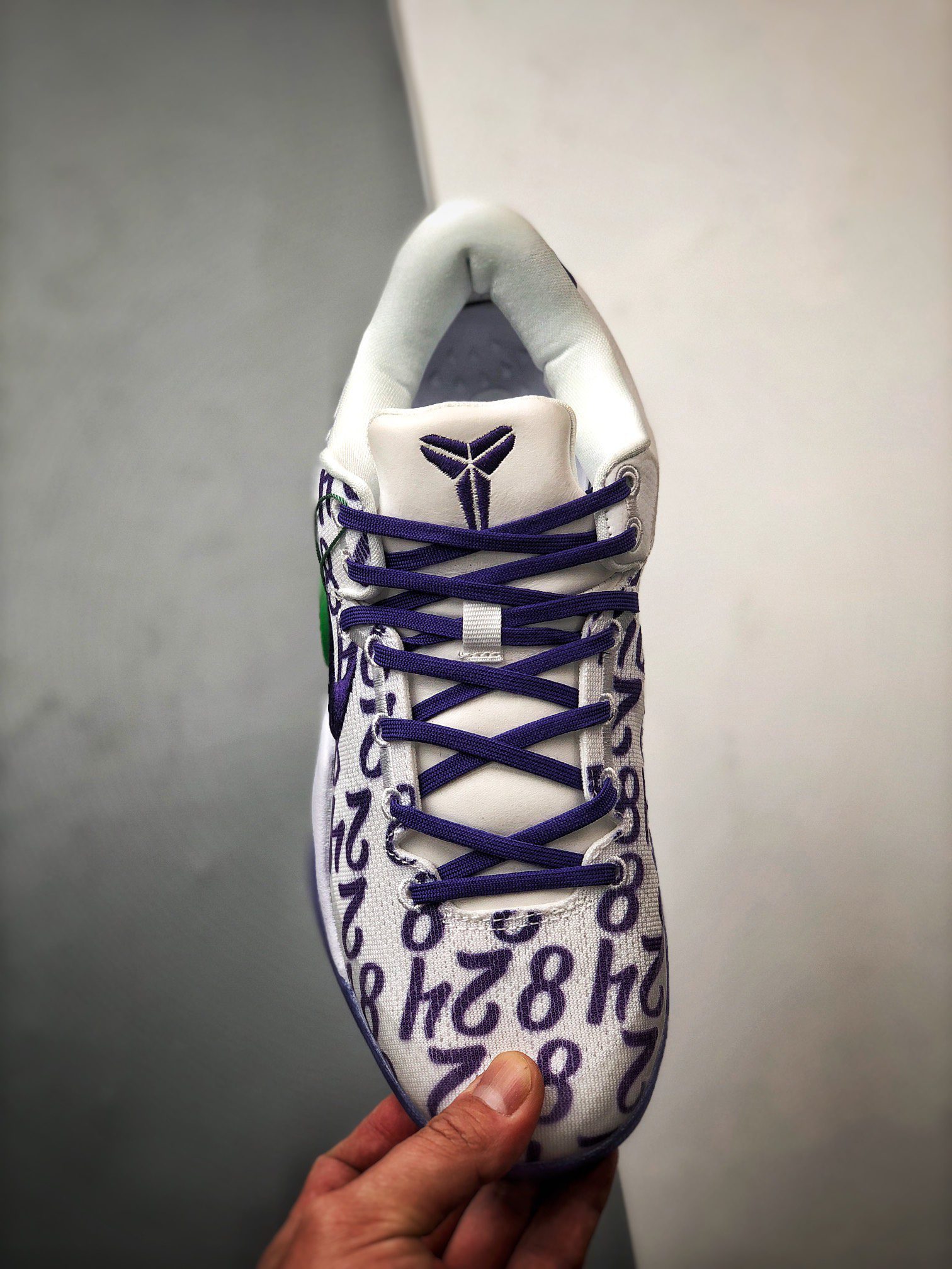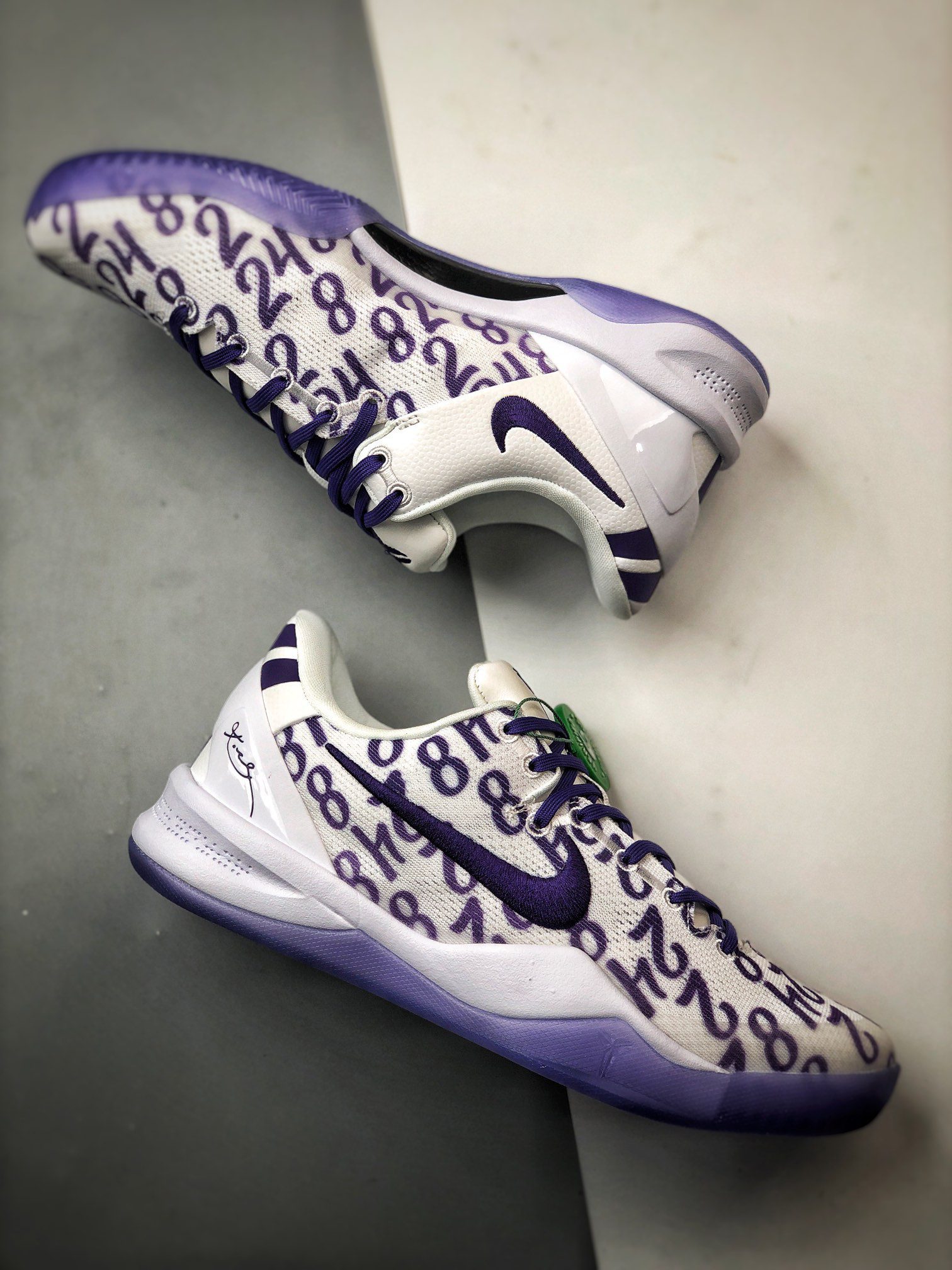 The Nike Kobe 8 Protro Court Purple is a tribute to Kobe Bryant’s iconic legacy with the Los Angeles Lakers. This sneaker features a white engineered mesh upper accented with Kobe’s jersey numbers ‘8’ and ’24’, symbolizing his storied career. Designed for performance, the Kobe 8 Protro Court Purple incorporates React foam cushioning for lightweight comfort and a carbon fiber shank plate for enhanced midfoot stability. The shoe fits small, so sizing up by half a size is recommended. Its breathable design and signature details make it a must-have for both collectors and players seeking a blend of style and functionality. The Kobe 8 Protro Court Purple stands out with its translucent purple outsole and subtle purple Nike swoosh, perfectly capturing the Lakers’ spirit while delivering modern performance upgrades. This sneaker is a perfect homage to Kobes excellence on the court.