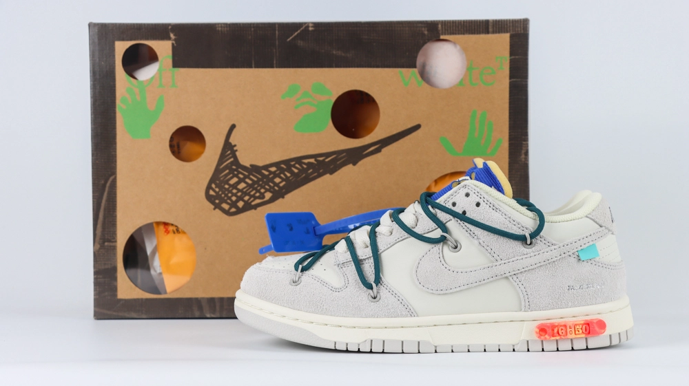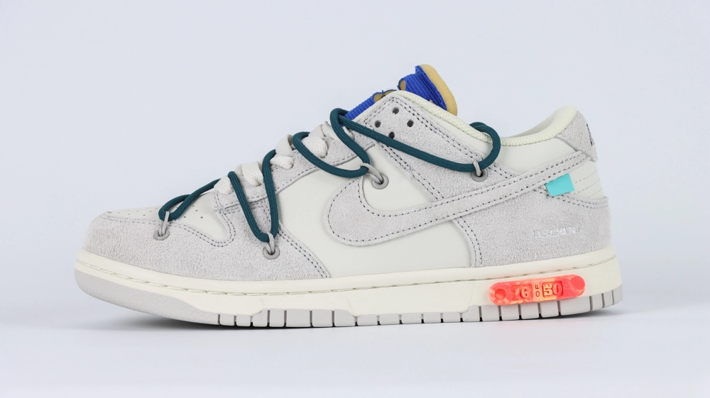 The **Lot 16 Off White Dunk** is a standout sneaker from the exclusive Off-White x Nike collaboration, part of the celebrated “The 50” collection. This model features a sleek white leather upper combined with gray suede overlays, delivering a clean yet bold aesthetic. The design incorporates signature Off-White elements such as the plastic zip tie and industrial-style text, making the Lot 16 Off White Dunk a must-have for sneaker enthusiasts. Known for its premium materials and unique detailing, the Lot 16 Off White Dunk blends streetwear edge with Nike’s classic Dunk silhouette, offering both style and comfort. This sneaker is highly sought after, reflecting the innovative partnership between Virgil Abloh and Nike. The Lot 16 Off White Dunk perfectly balances modern design with timeless appeal, making it a key piece in any collection.