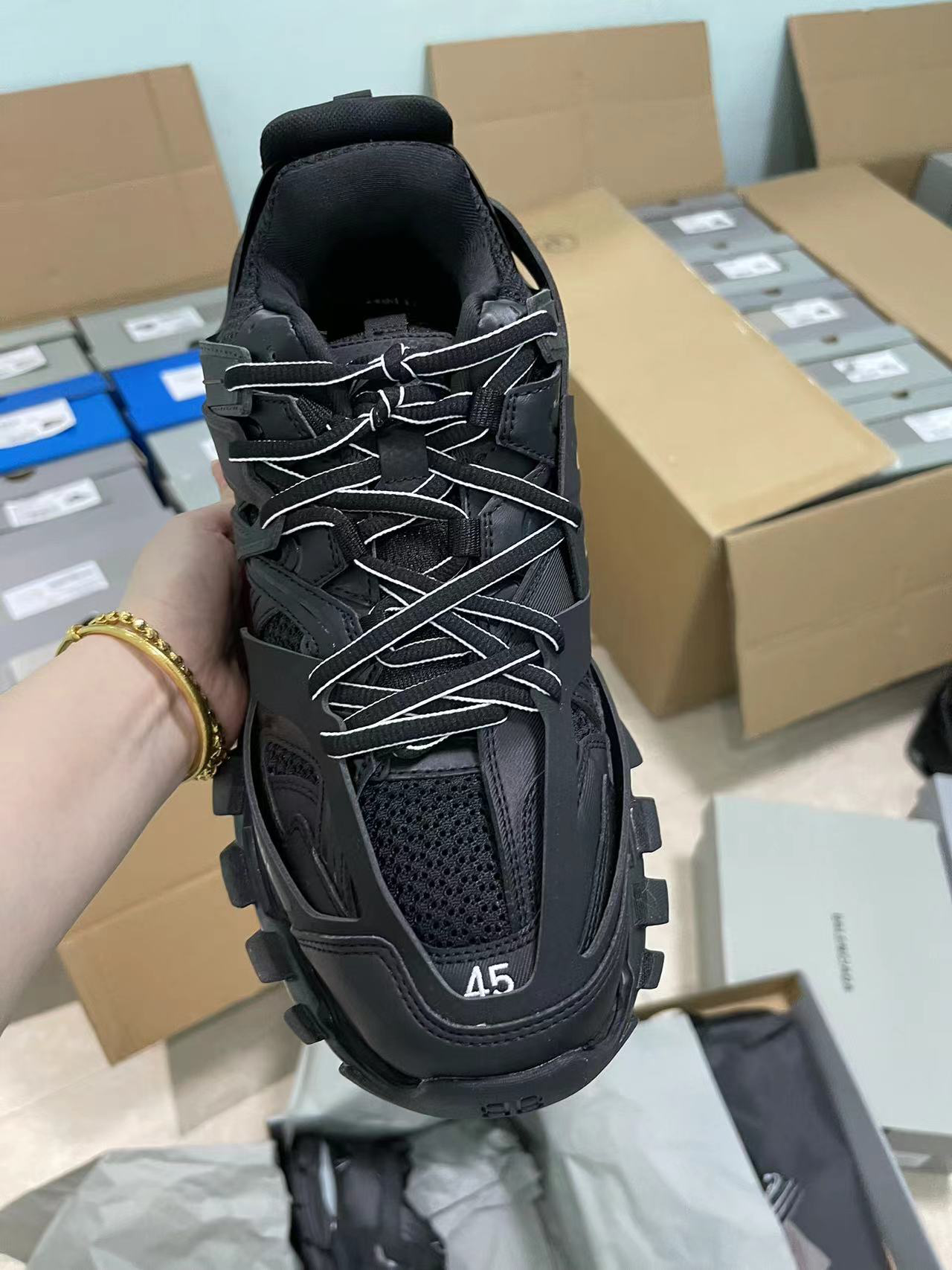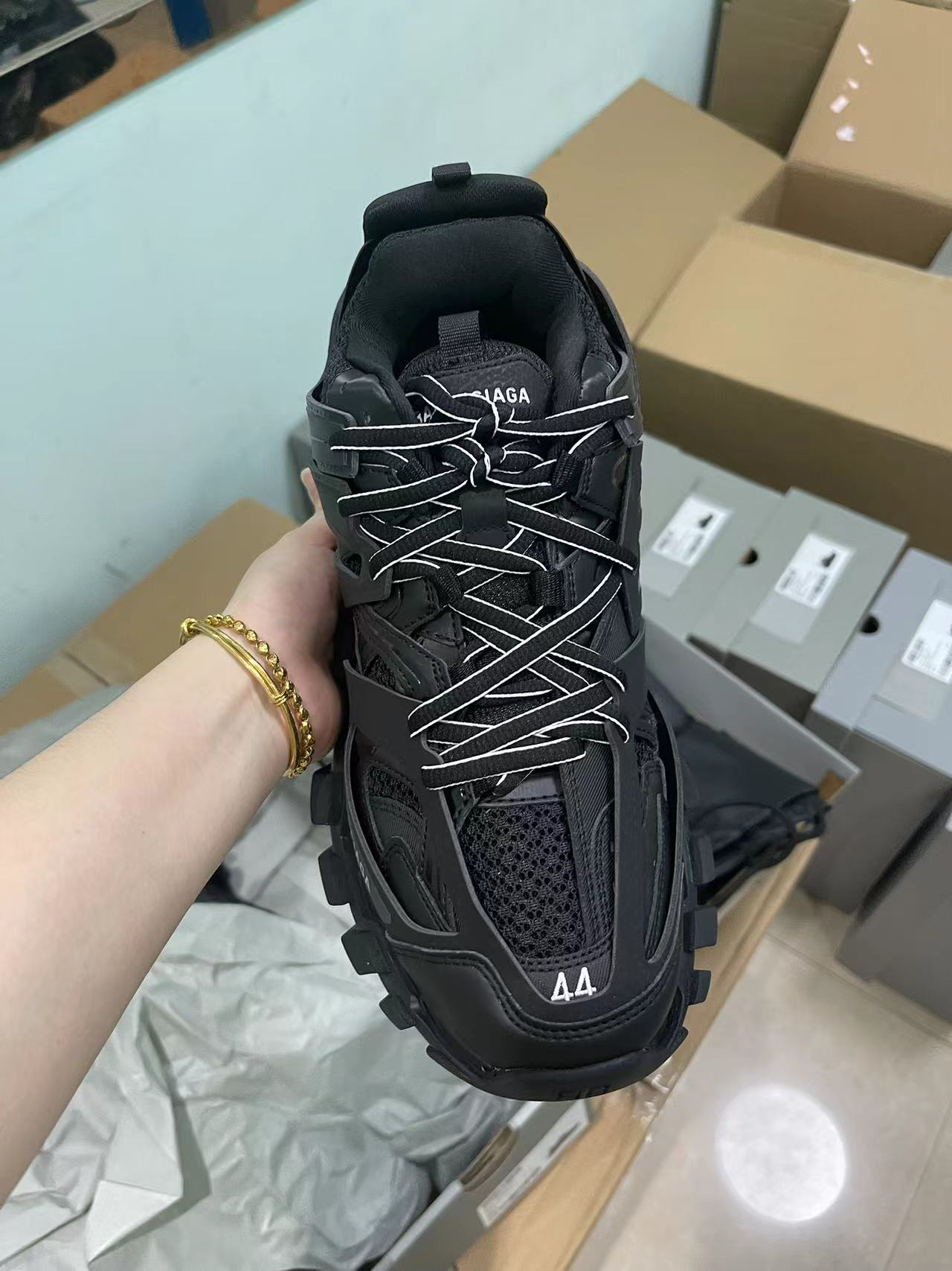 The men’s track led sneaker in black by Balenciaga offers a bold blend of style and innovation. Featuring a dynamic sole design with an augmented back for enhanced comfort, this sneaker stands out with its black mesh and nylon upper. The shoe includes double laces knotted in a traditional equipment style, a back and tongue pull-on tab, and embossed branding details such as the Track logo on the heel and BB on the outsole. Its distinctive washed effect adds a well-worn look, making it a versatile choice for both casual and streetwear fashion. The men’s track led sneaker in black is designed with a 50mm arch to support all-day wear, combining aesthetics with functionality. This sneaker is a premium option for those seeking a statement piece with modern comfort. The men’s track led sneaker in black is crafted without leather, emphasizing a contemporary, sustainable approach to sneaker design.