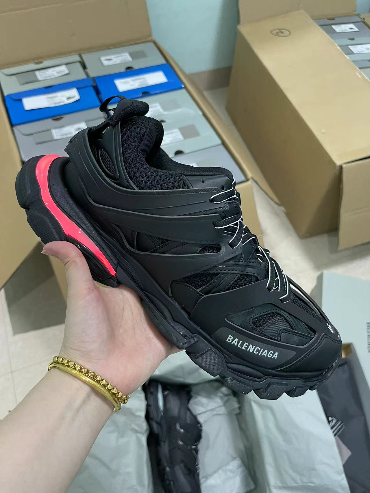 Balenciaga’s Track LED sneaker in black is a standout in luxury footwear, combining synthetic and mesh materials with a rubber sole for durability and style. The sneaker features a lace-up front with double laces knotted in a unique way, enhancing its distinctive look. Made in China, this model includes a padded tongue and collar for optimal comfort, fitting true to size with recommendations to size up if between sizes. The sneakers design includes embossed logos on the tongue and heel, and a printed logo on the exterior, reinforcing its premium branding. Despite its bulky and substantial build, the sneaker offers excellent traction, making it suitable for various activities beyond fashion. The LED feature adds a futuristic touch, appealing to sneaker enthusiasts who appreciate both aesthetics and technology. Although currently on backorder at some retailers, the men’s track led sneaker in black remains a coveted item for collectors and fashion-forward individuals.