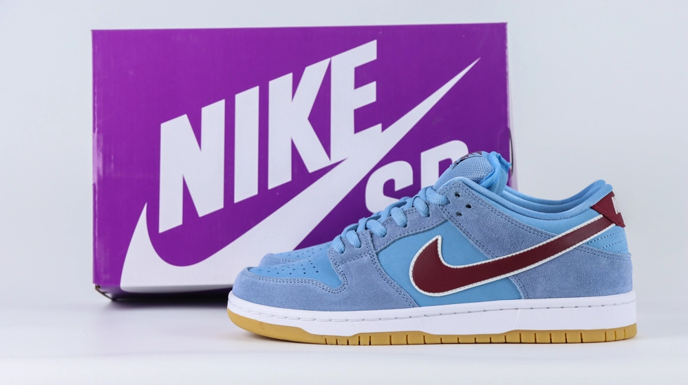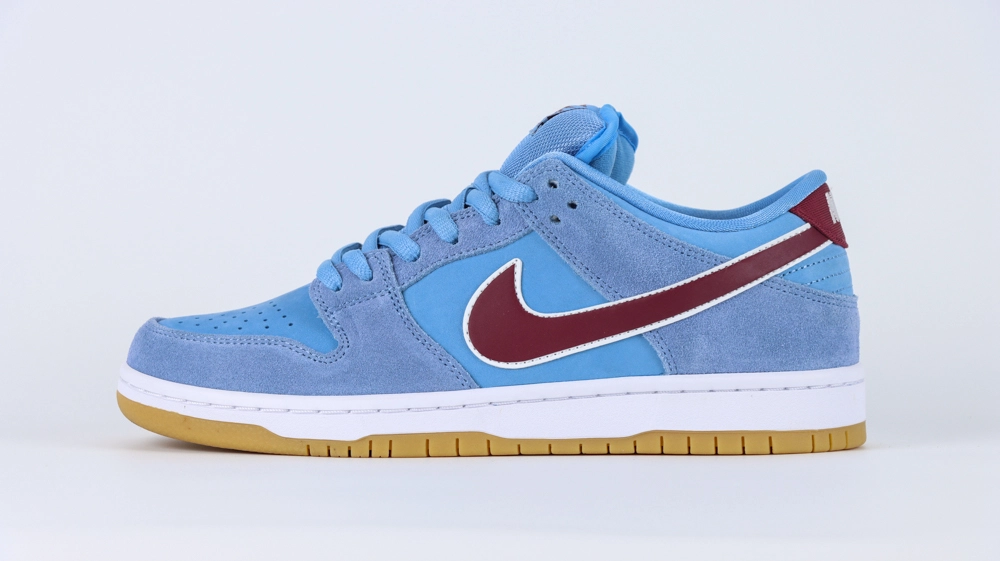 Released in 2022, the Dunk Low Premium SB Philadelphia Phillies quickly became a sought-after model among sneaker enthusiasts and baseball fans. Known as the 2022 Dunk Low Premium SB Philadelphia Phillies, this edition is part of the Bubblegum Pack, inspired by the retro uniforms of the Philadelphia Phillies from the 1980s. The Nike SB ‘Phillies’ Dunk Low Premium skate shoes feature a Valor Blue suede upper contrasted by a Team Maroon Swoosh outlined in white, capturing the classic team colors with a modern twist. The sneakers interior boasts a silky smooth blue nylon lining, while the foam-lined insole with Nike SB and Zoom Air branding ensures superior comfort. Available in select men’s stores, the Nike Dunk Low Premium SB ‘Philadelphia Phillies’ offers authentic style and performance, making it a prized addition for collectors and skaters. The gum rubber outsole with a circular pivot point enhances grip and durability, perfect for skateboarding or everyday wear. Overall, the Dunk Low Premium SB ‘Philadelphia Phillies’ combines nostalgic design with premium features for a unique sneaker experience.