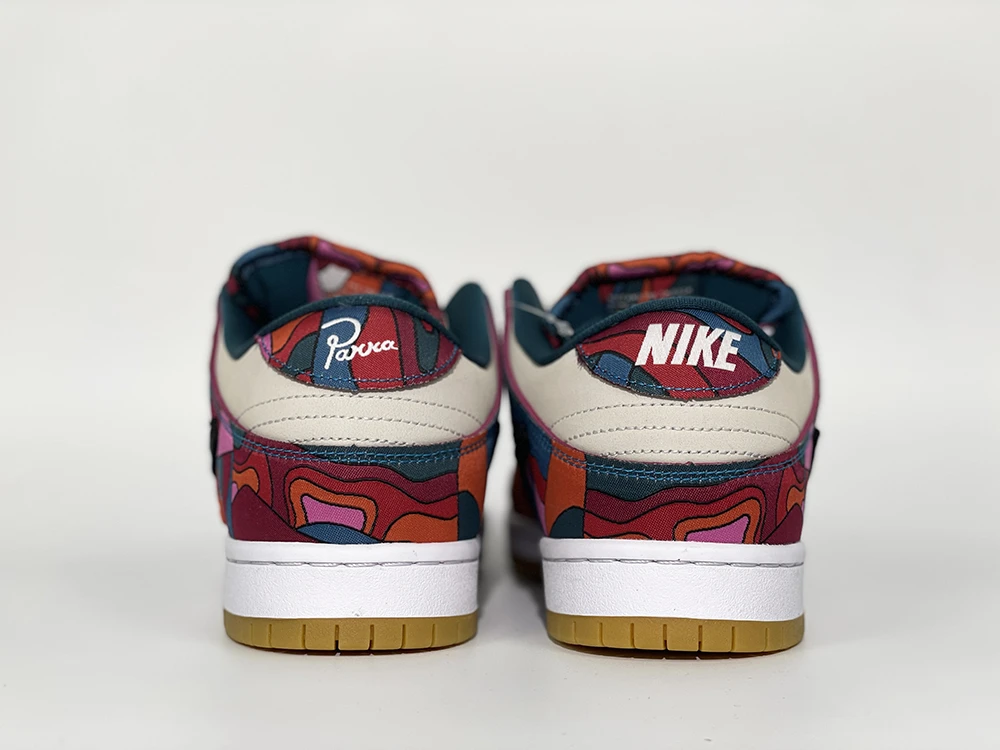 The Nike SB Dunk Low Pro Parra Abstract Art sneaker is crafted with premium materials, including a white nubuck leather base that complements the colorful abstract panels on the mudguard, eyestays, heel, and tongue trim. Parras signature logo is subtly placed on the heel, adding an exclusive touch to the design. The shoe features a round toe and front lace-up fastening for a secure fit, while the rubber sole ensures durability and grip. The insole is branded and covered with the same abstract art pattern, enhancing the overall aesthetic. This collaboration between Nike and Parra highlights the fusion of streetwear culture and fine art, reflecting Parras recent works showcased on social media. The sneakers padded Achilles area and Zoom Air unit in the heel provide comfort and support, making it suitable for both casual wear and skateboarding. Its limited release and artistic design make the Nike SB Dunk Low Pro Parra Abstract Art a highly sought-after piece in the sneaker community.