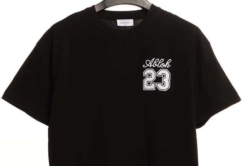 The Off-White 23 logo print t-shirt navy white variant offers a fresh take on the classic design, combining navy and white hues for a crisp, modern look. This colorway maintains the same high-quality cotton construction and crew neck style, ensuring comfort and durability. The navy white palette adds versatility, making it easy to pair with various outfits while keeping the iconic 23 logo print visible and stylish. Off-Whites attention to detail is evident in the precise logo placement and the premium fabric choice, which guarantees a soft feel and long-lasting wear. Whether worn casually or styled for a more polished streetwear look, the off-white 23 logo print t-shirt navy white is a perfect choice for those seeking a blend of bold branding and subtle color contrast. This t-shirt reflects Off-Whites commitment to merging contemporary design with functional fashion, appealing to trendsetters and sneaker enthusiasts alike.