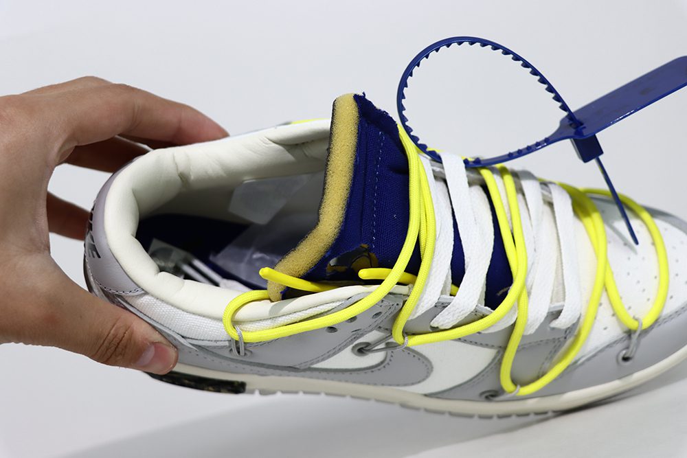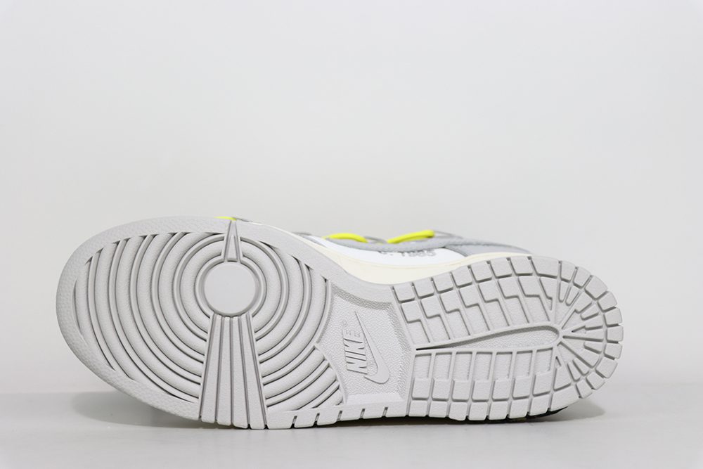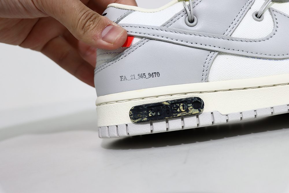The Dunk Low Off White Lot 27 continues the legacy of the Nike Dunk and Off-White collaborations, featuring bold design cues that set it apart from standard releases. The sneaker’s outsole is crafted from durable rubber with a lug and circular tread pattern, providing excellent grip and longevity. The heel prominently displays Nike branding, visible also on the sole’s base, reinforcing its authentic appeal. The Dunk Off White Lot 27 integrates Off-Whites signature aesthetic with a grey Swoosh and contrasting leather panels, creating a visually striking look. Fans of the Lot 27 Dunk appreciate the combination of style and comfort, making it suitable for both casual wear and sneakerhead collections. The Nike Dunk Off White Lot 27 is a perfect example of how Off-Whites design philosophy elevates classic sneaker models with innovative details and premium materials.