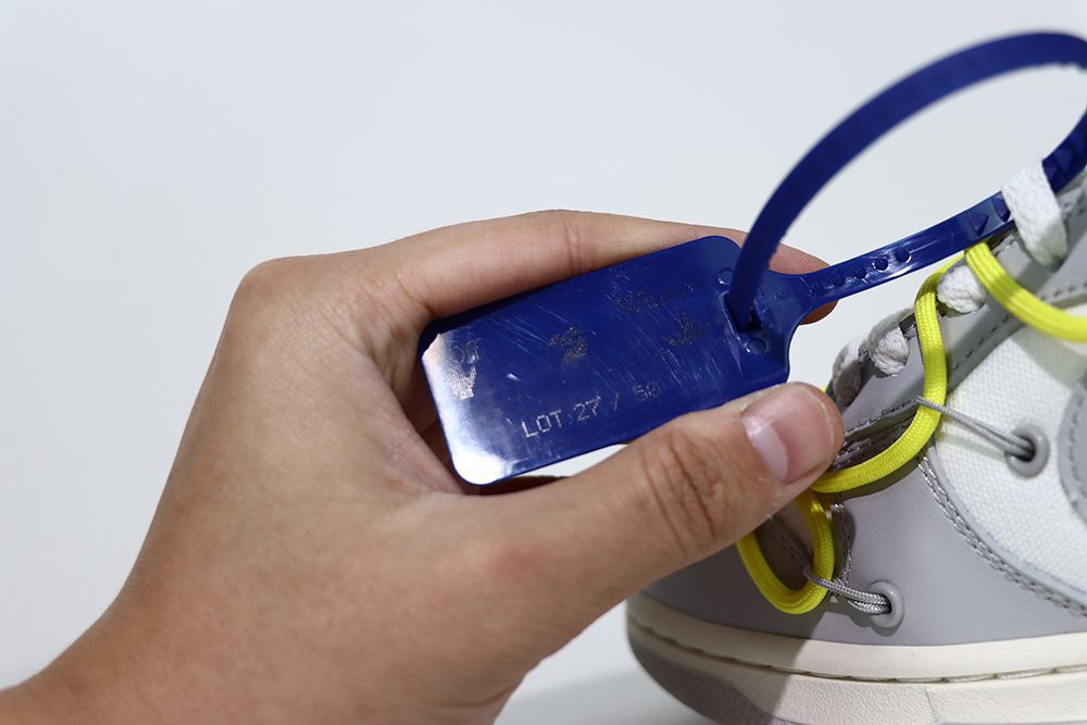 The Off White Dunk Lot 27 is a standout sneaker collaboration between Nike and Off-White, known for its unique design and premium craftsmanship. This limited-edition sneaker features signature Off-White elements such as a plastic zip-tie, printed text, and an exposed-foam tongue, combined with a grey leather construction and a distinctive overlaid rope lacing system. The Off White Dunk Lot 27 offers a fresh take on the classic Dunk Low silhouette, blending streetwear aesthetics with high-quality materials. Collectors and sneaker enthusiasts highly seek the Off White Dunk Lot 27 for its exclusivity and iconic design, making it a must-have in any sneaker collection. Authentic pairs showcase precise stitching and a clear style ID ‘DM1602-120’ on the label, ensuring genuine quality and craftsmanship.