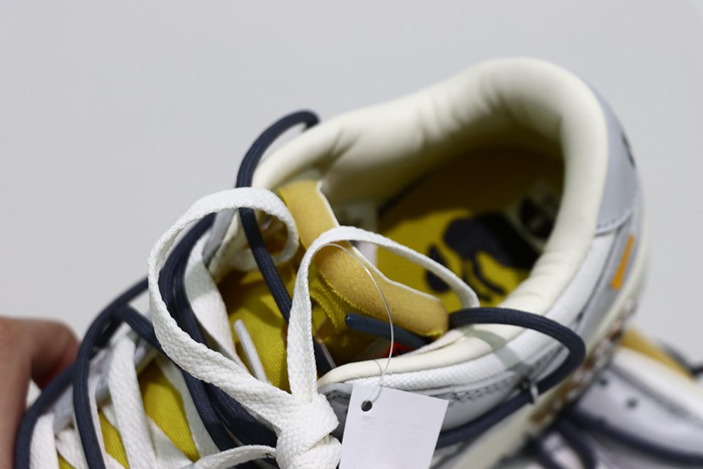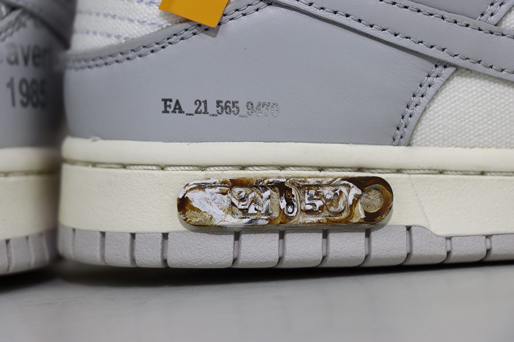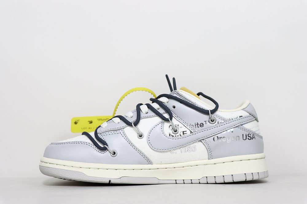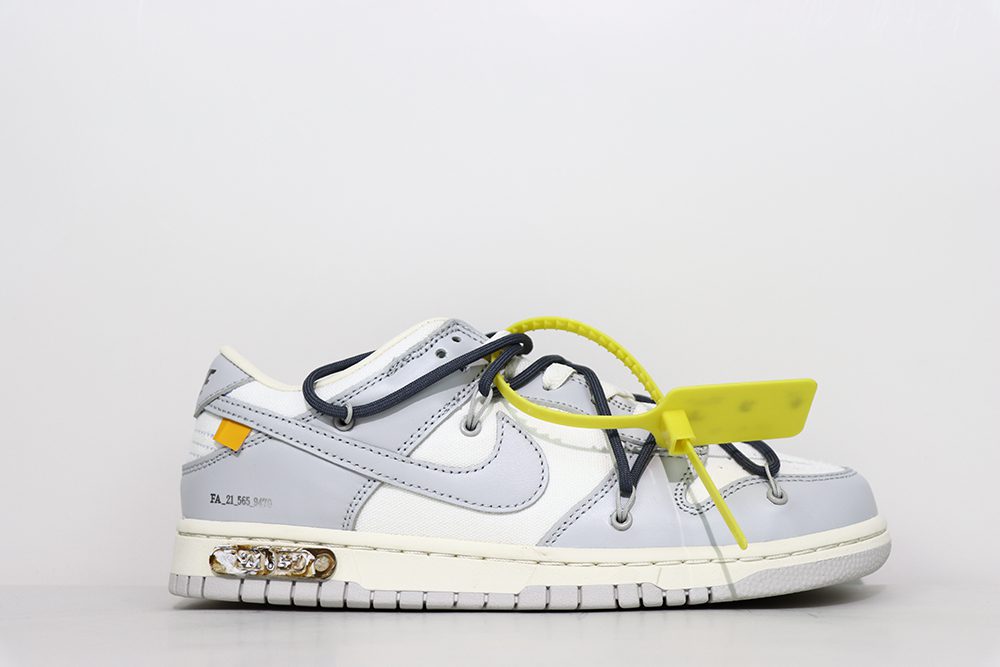 The Off White Dunk Lot 41 is a standout sneaker from the exclusive Off-White x Nike Dunk Low collection. This model features a smooth white leather upper combined with soft gray canvas overlays, creating a clean yet textured look that embodies the iconic Dunk silhouette. The Off White Dunk Lot 41 showcases signature Off-White design elements, including subtle branding and unique material contrasts that elevate its style. With its blend of premium materials and distinctive color blocking, the Off White Dunk Lot 41 appeals to sneaker enthusiasts seeking both fashion and comfort. This sneaker is a must-have for collectors and fans of the Off-White Dunk series, offering a fresh take on the classic Dunk Low design. The Off White Dunk Lot 41 perfectly balances modern aesthetics with timeless appeal, making it a versatile addition to any sneaker rotation.