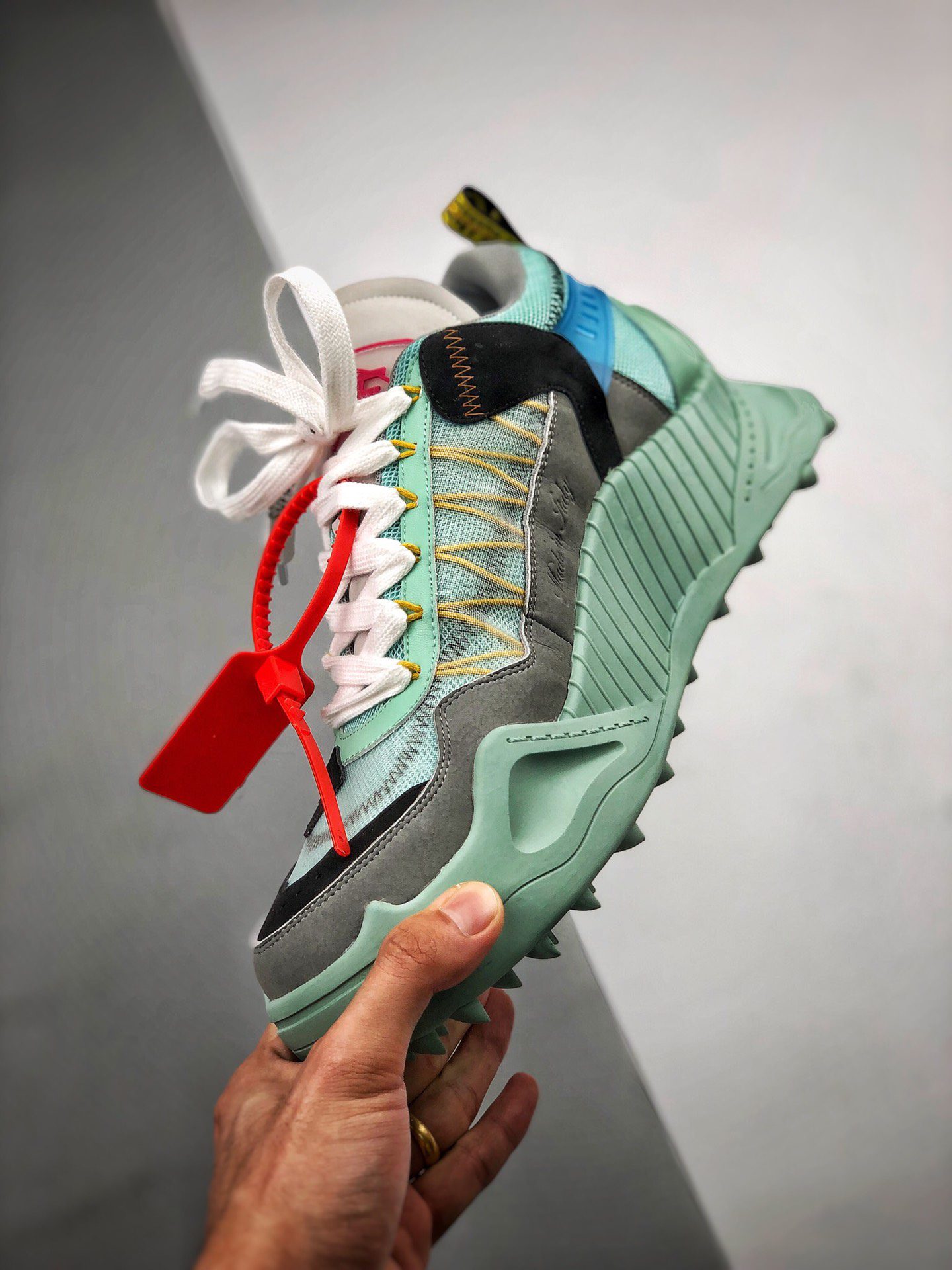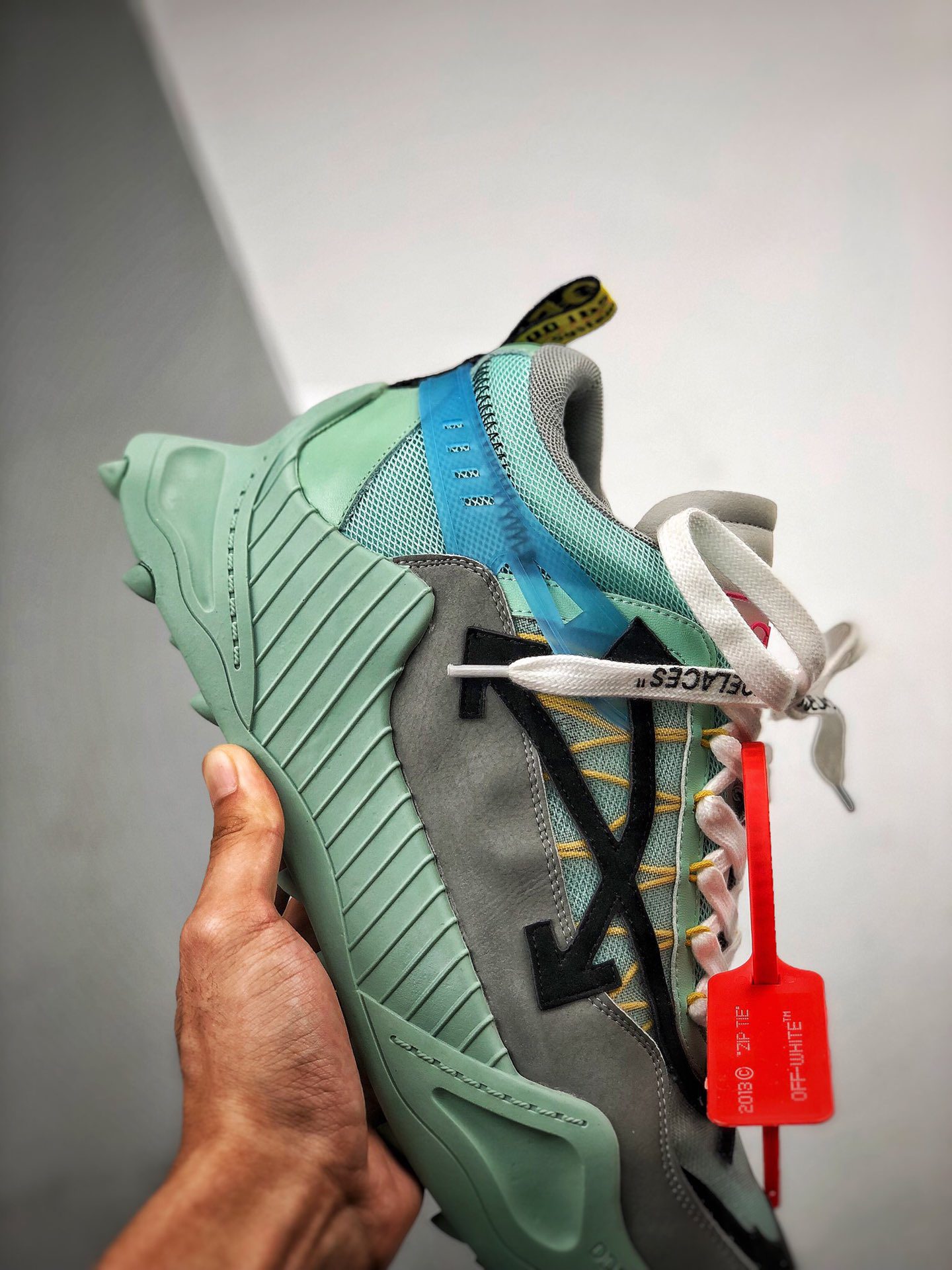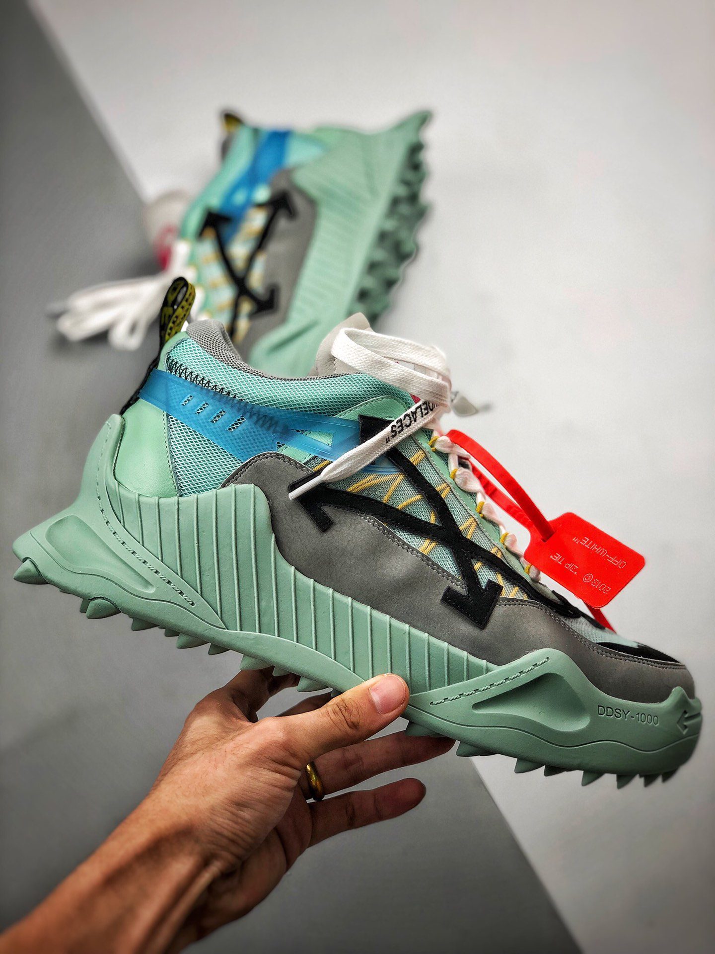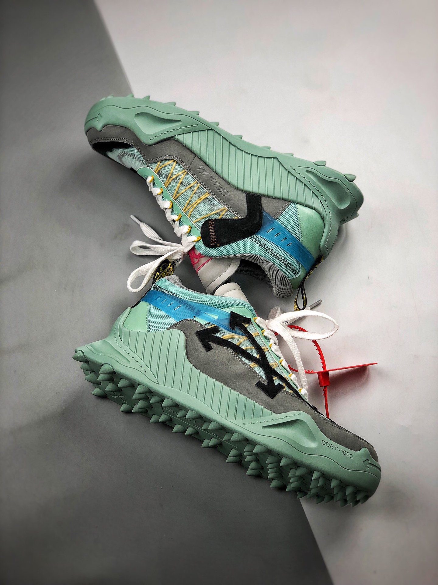 The Off White Odsy 1000 Light Blue FW20 is a standout sneaker from Off-White’s Fall/Winter 2020 collection, known for its chunky silhouette and bold design. Featuring a light blue mesh and leather upper, this model combines technical overlays with Virgil Ablohs signature arrow branding, creating a distinctive look. The shoe is completed with a bulky midsole and a jagged rubber outsole, offering both style and durability. The Off White Odsy 1000 Light Blue FW20 perfectly blends streetwear aesthetics with high-performance elements, making it a sought-after piece for sneaker enthusiasts. This sneaker embodies the innovative spirit of Off-Whites FW20 lineup, balancing eye-catching color with functional design. Collectors and fashion-forward individuals alike appreciate the Off White Odsy 1000 Light Blue FW20 for its unique colorway and iconic branding.