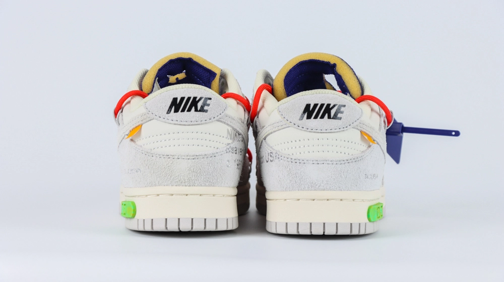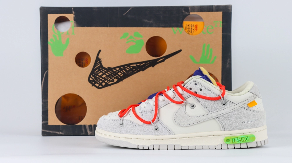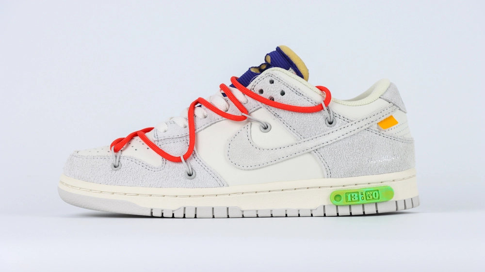 The Off White Dunk 13 of 50 is part of a limited series of 50 unique Dunk Low designs released by Off-White in collaboration with Nike. Each pair in this series, including the Off White Dunks 13 of 50, showcases distinct colorways and material choices, making every lot a rare find. The Off-White x Dunk Low ‘Lot 13 of 50’ stands out with its soft leather upper that resists creasing, a feature appreciated by wearers who value both aesthetics and durability. Additionally, the 13 of 50 Off White Dunks include signature Off-White elements such as the iconic zip tie, rope lacing system, and Helvetica text branding on the medial side. These details highlight the brands industrial design language while maintaining the classic Dunk silhouette. Whether styled casually or as a collectors item, the Off White Dunk 13 of 50 continues to attract sneakerheads seeking exclusivity and innovative design.