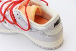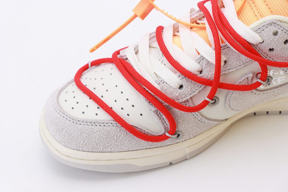 The Off-White x Dunk Low ‘Lot 40 of 50’ is one of the 50 unique colorways released in the highly anticipated collaboration between Nike and Virgil Abloh’s Off-White brand. This particular lot features a white leather upper with soft grey suede overlays, giving it a refined yet urban look. Signature Off-White details such as the plastic zip tie and exposed foam tongue add to its distinctive style. Released via exclusive access in August 2021, the ‘Lot 40 of 50’ sneaker was part of a limited drop that generated significant hype worldwide. Each pair is numbered, emphasizing its rarity and collectible nature. The sneaker combines classic Dunk Low silhouettes with Off-White’s deconstructed design philosophy, making it a perfect blend of heritage and modern streetwear. Fans appreciate the subtle color palette and premium materials, which elevate the sneaker beyond typical releases. The Off-White x Dunk Low ‘Lot 40 of 50’ continues to be a highlight for collectors and fashion-forward sneakerheads alike.