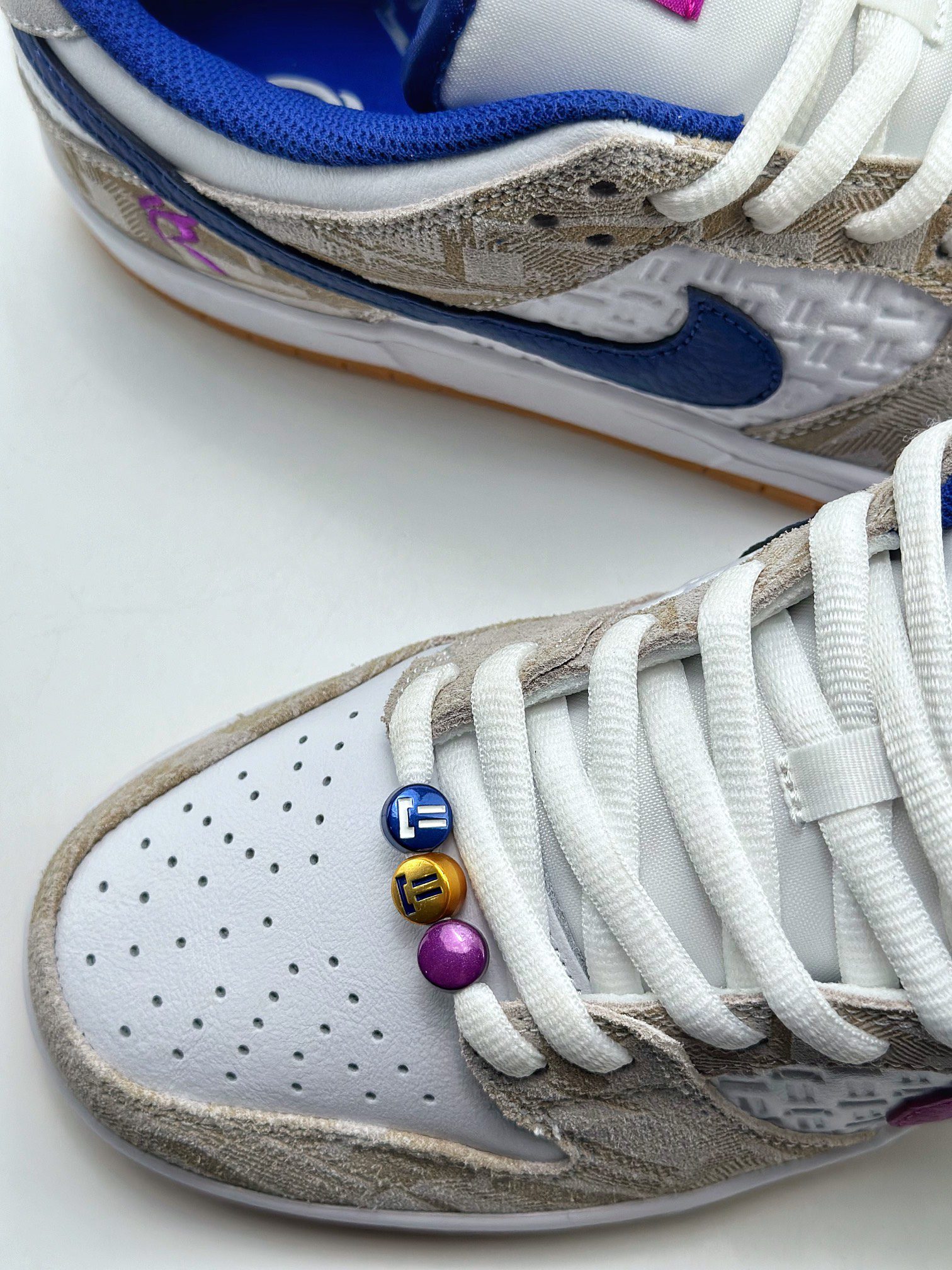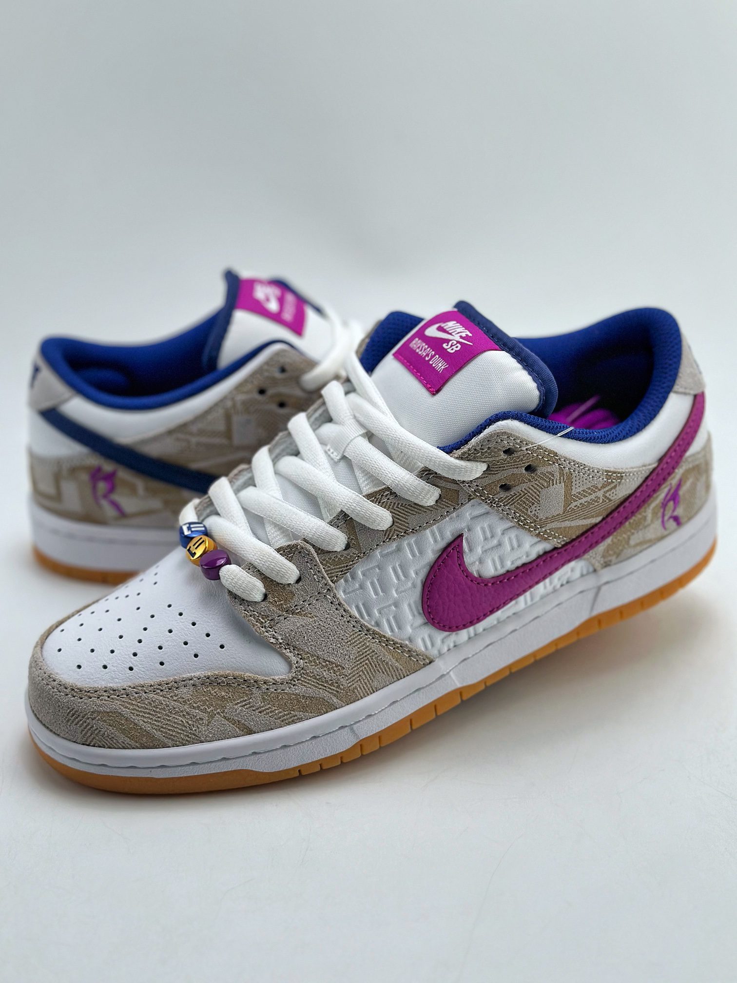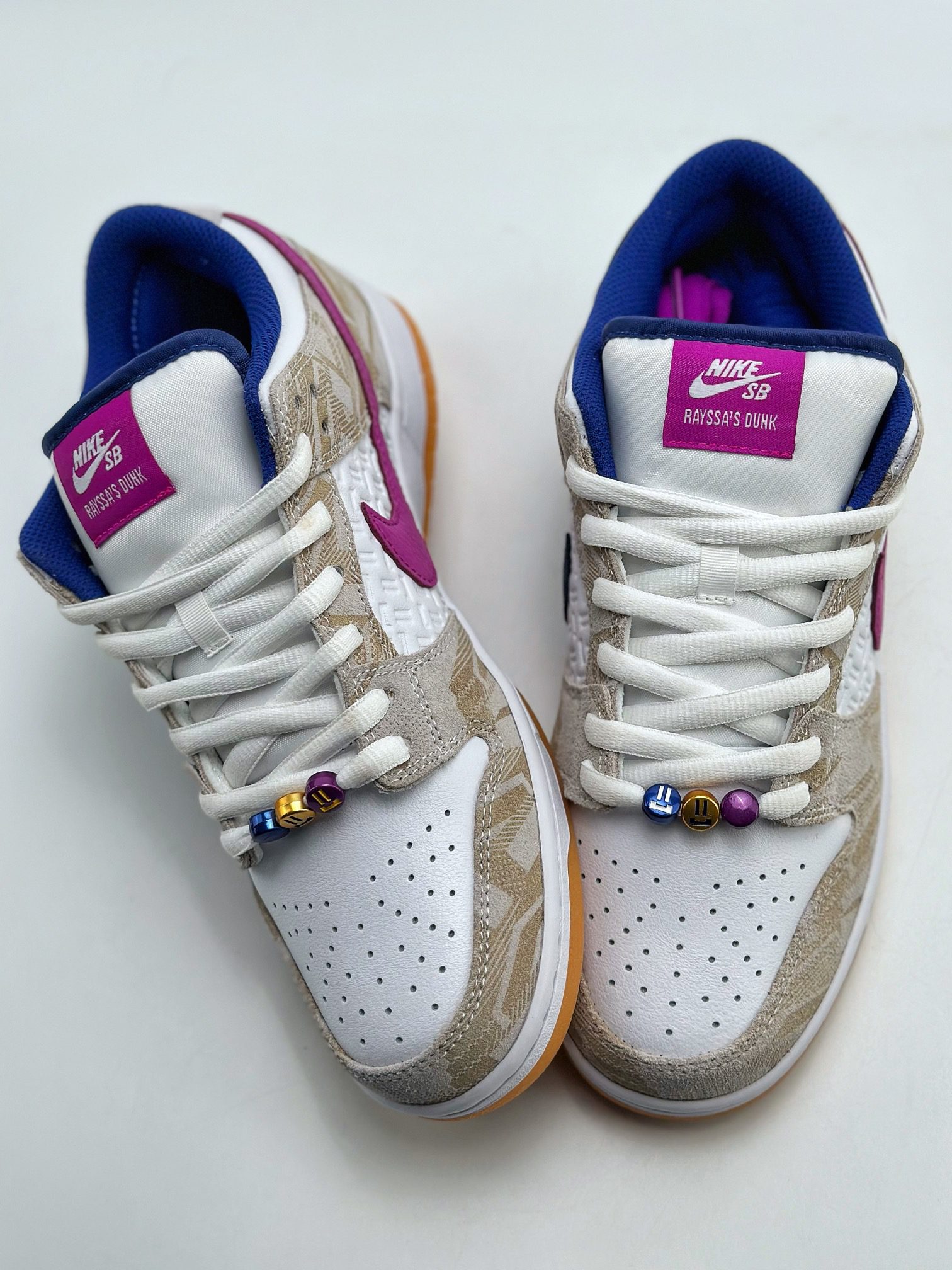 The Rayssa Leal SB Dunk Low is a standout sneaker collaboration between Nike SB and Brazilian skateboarding prodigy Rayssa Leal. Released in early 2024, this model features a vibrant colorway combining Pure Platinum, Deep Royal Blue, Vivid Purple, White, and Gum Yellow, reflecting Rayssas energetic and creative spirit. Constructed with a leather base and textile overlays, the Rayssa Leal SB Dunk Low offers both durability and comfort, making it ideal for skateboarding and casual wear. Signature details include Rayssas logo on the medial heel and smiley face lace charms, adding a playful touch to the design. This sneaker perfectly blends performance with style, making the Rayssa Leal SB Dunk Low a must-have for sneaker enthusiasts and skate fans alike. The shoes bold colors and unique elements ensure it stands out in any collection, embodying Rayssas youthful vibe and skateboarding legacy. The Rayssa Leal SB Dunk Low continues to elevate the Nike SB Dunk line with its fresh and dynamic aesthetic.
