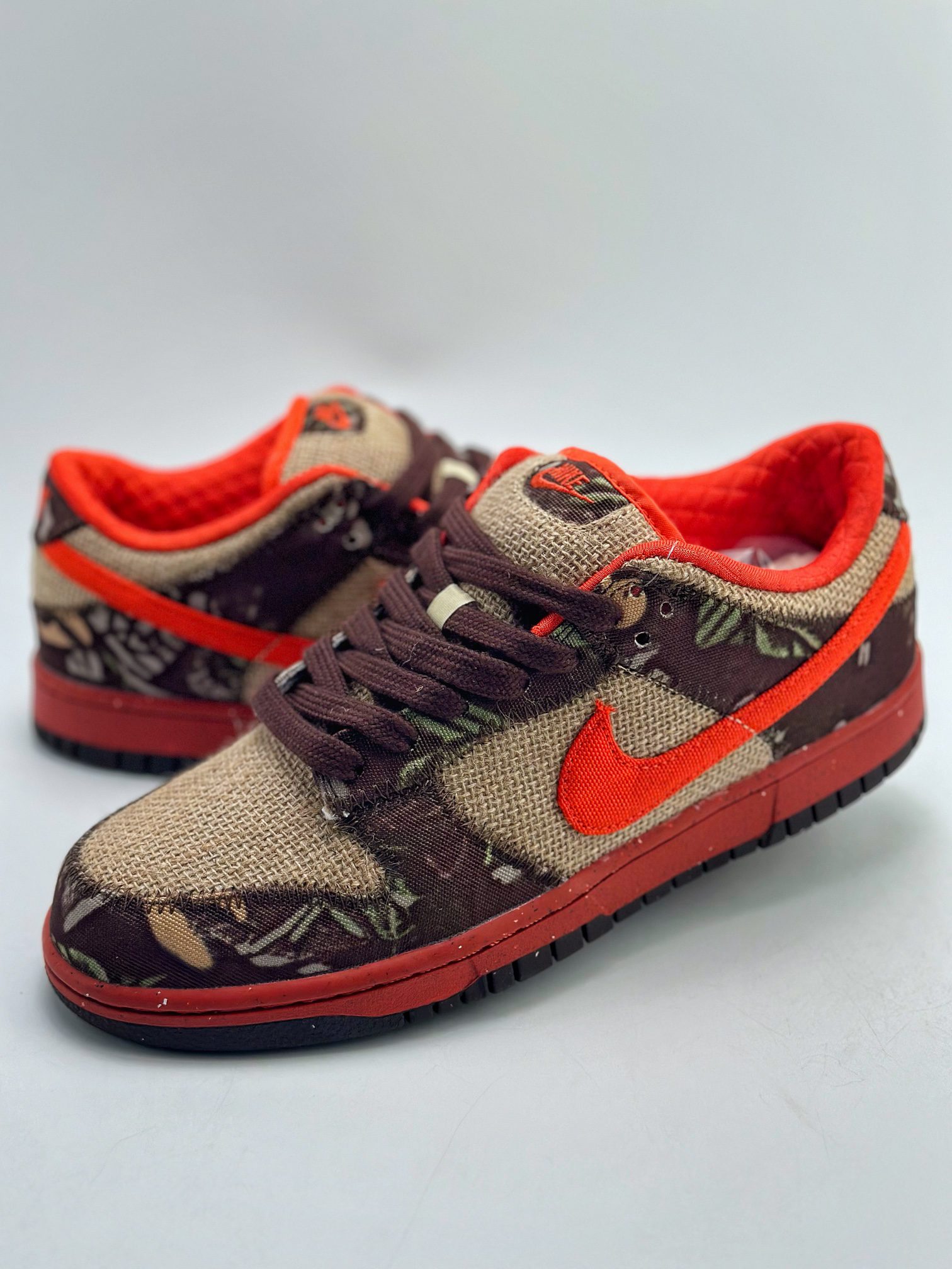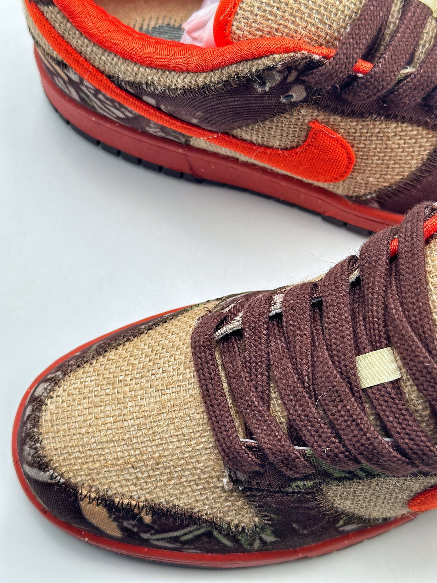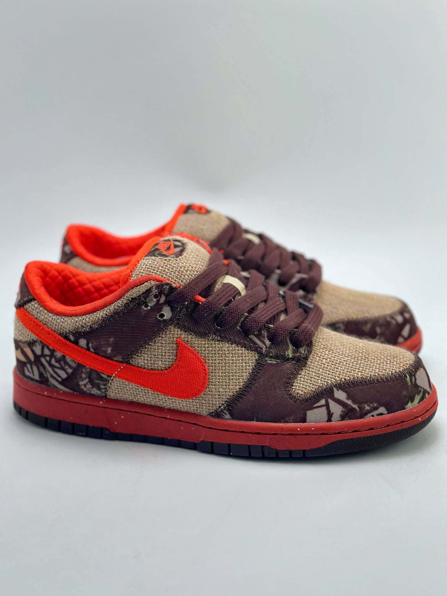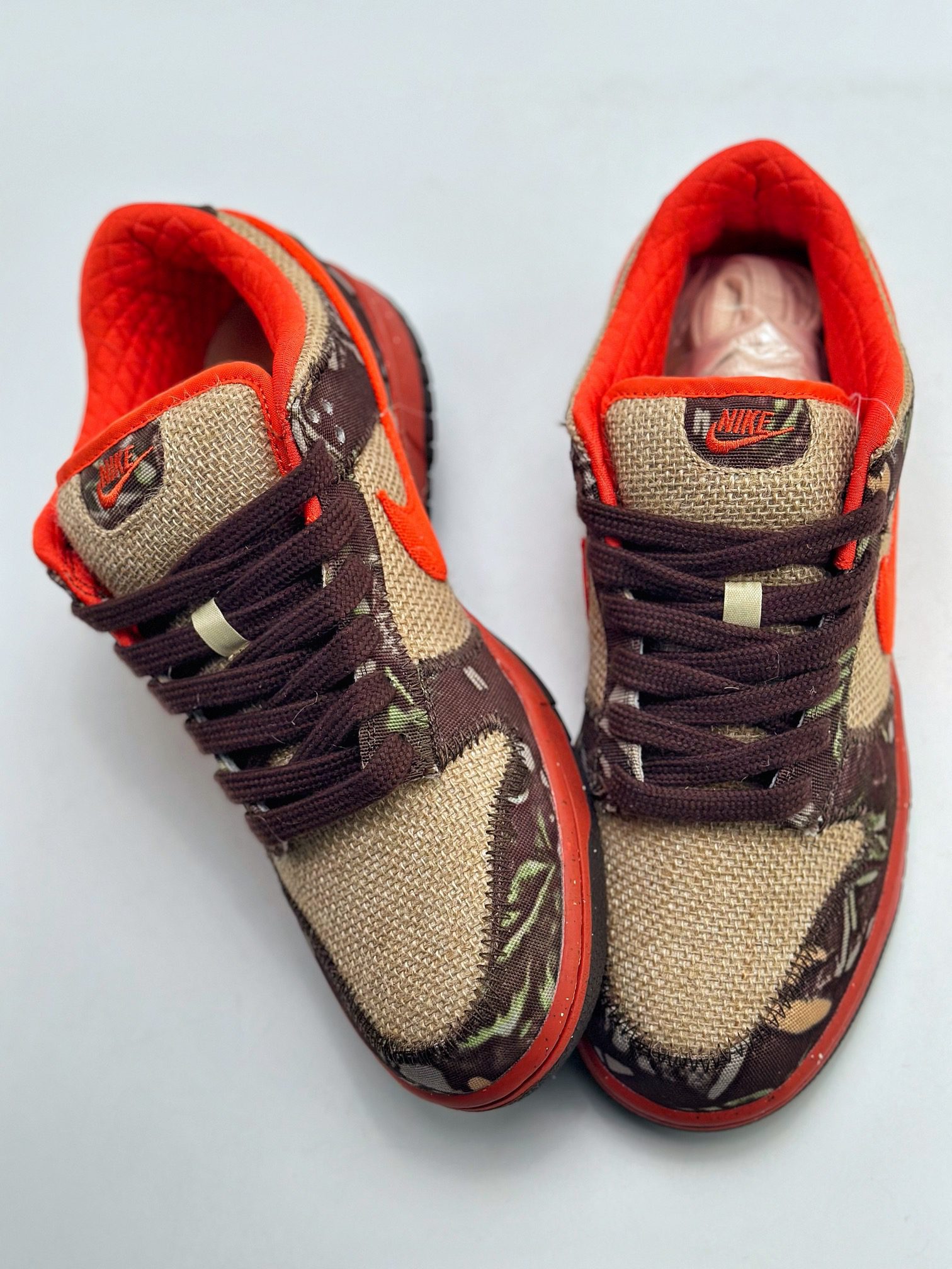 The Nike SB Dunk Low Reese Forbes Hunter is renowned for its blend of textures and colors that evoke a hunting motif. The burlap upper provides a natural, tactile feel, while the camouflage canvas overlays reinforce the outdoor theme. Safety orange accents not only enhance visibility but also add a pop of color that contrasts with the earthy tones. Released in the pink box, a hallmark of early Nike SB releases, this sneaker holds nostalgic value for collectors. Its design reflects a thoughtful approach to skateboarding footwear, combining durability with style. The chocolate brown outsole and orange-speckled midsole contribute to the shoes rugged aesthetic, suitable for both streetwear and skateboarding. Reese Forbes influence is evident in the choice of materials and color blocking, making this sneaker a unique chapter in Nike SBs history. The Hunter model is often discussed in sneaker communities for its bold departure from traditional skate shoe designs, highlighting Nike SBs willingness to experiment and innovate.