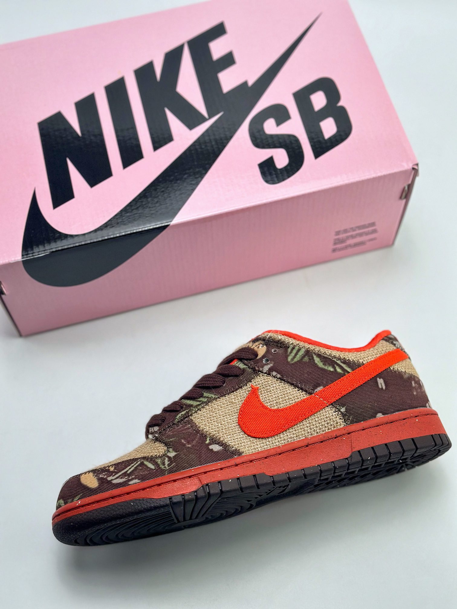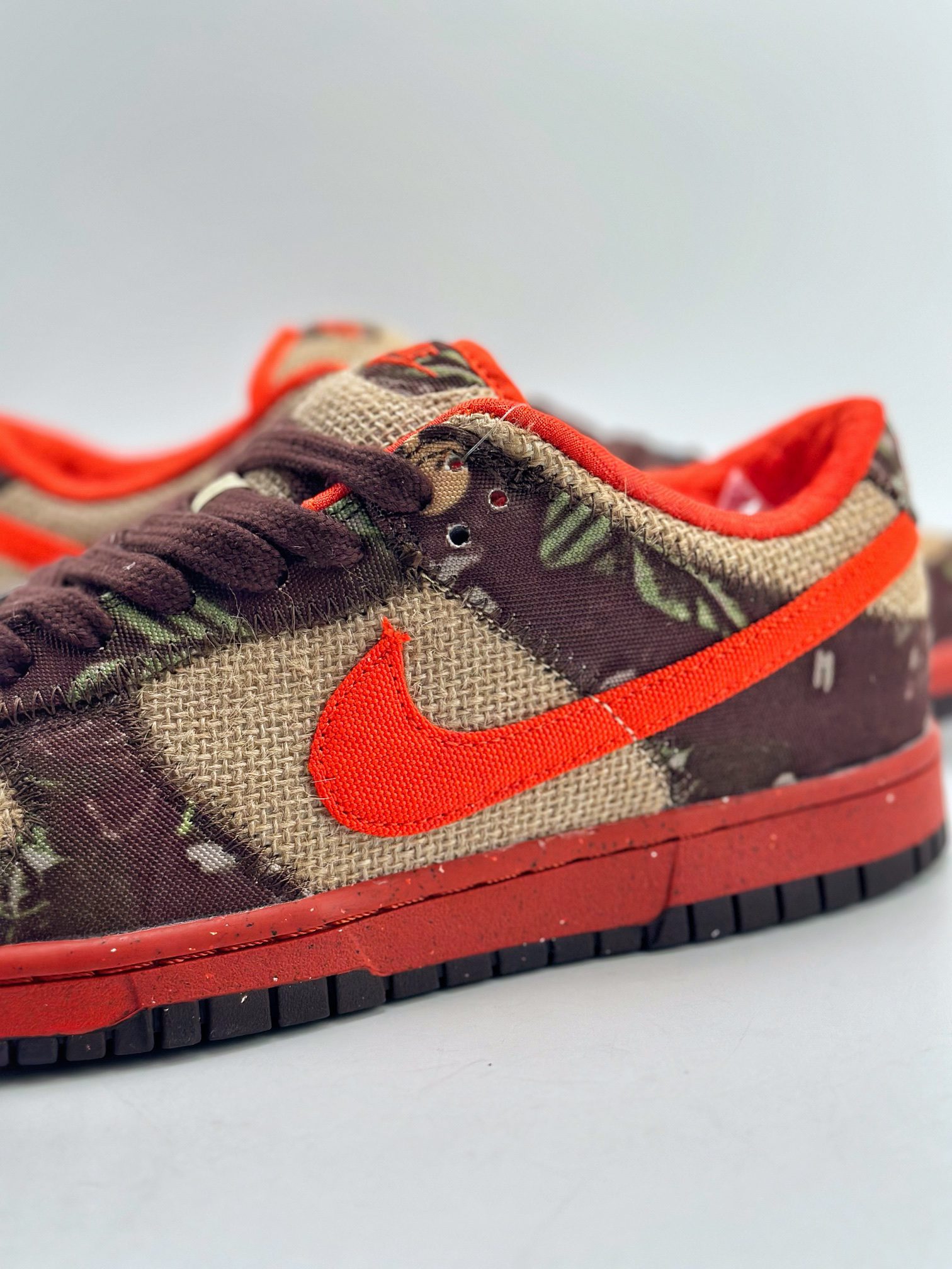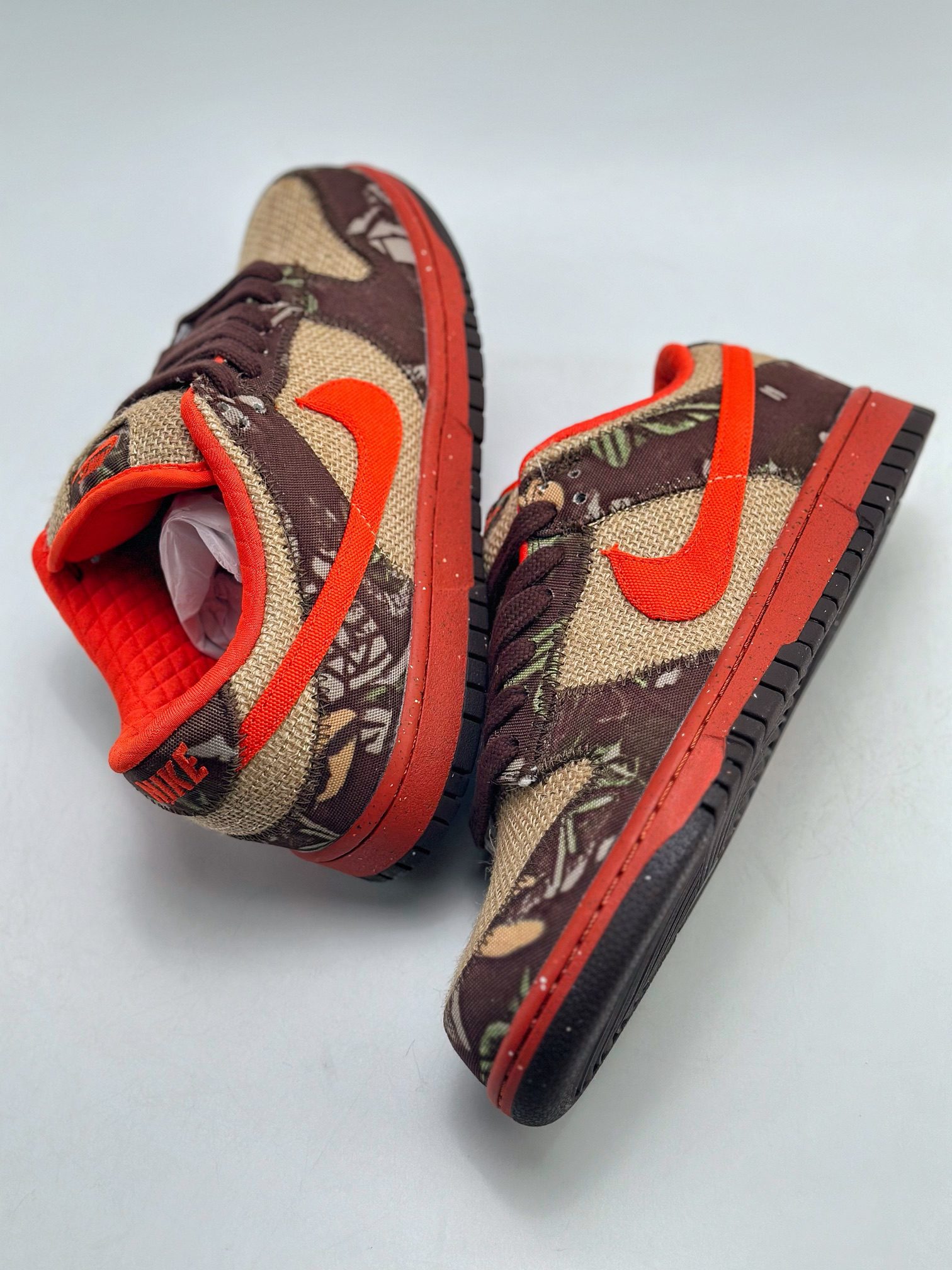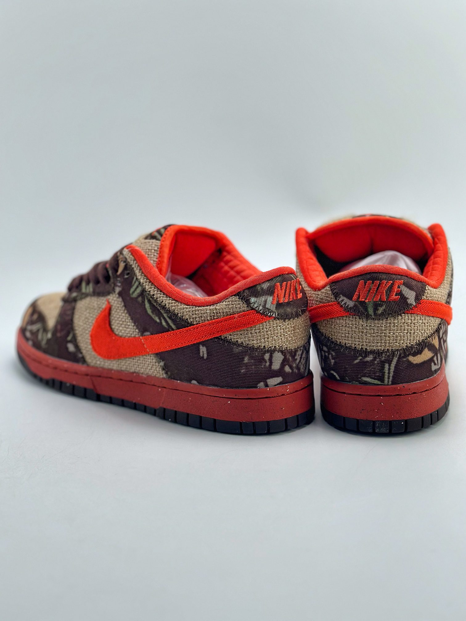 The Nike SB Dunk Low Reese Forbes Hunter is renowned for its blend of textures and colors that evoke a hunting motif. The burlap upper provides a natural, tactile feel, while the camouflage canvas overlays reinforce the outdoor theme. Safety orange accents not only enhance visibility but also add a pop of color that contrasts with the earthy tones. Released in the pink box, a hallmark of early Nike SB releases, this sneaker holds nostalgic value for collectors. Its design reflects a thoughtful approach to skateboarding footwear, combining durability with style. The chocolate brown outsole and orange-speckled midsole contribute to the shoes rugged aesthetic, suitable for both streetwear and skateboarding. Reese Forbes influence is evident in the choice of materials and color blocking, making this sneaker a unique chapter in Nike SBs history. The Hunter model is often discussed in sneaker communities for its bold departure from traditional skate shoe designs, highlighting Nike SBs willingness to experiment and innovate.