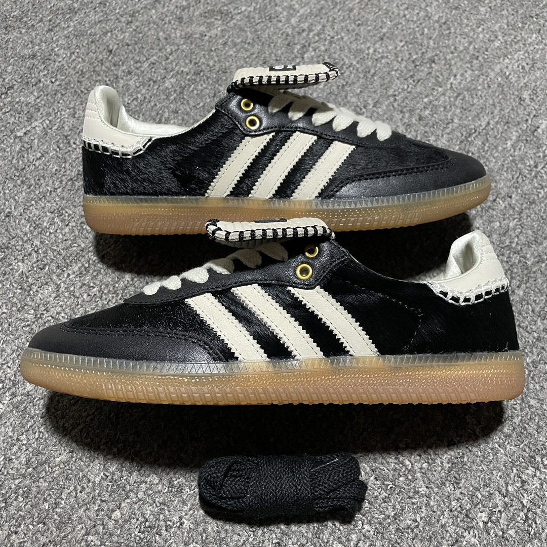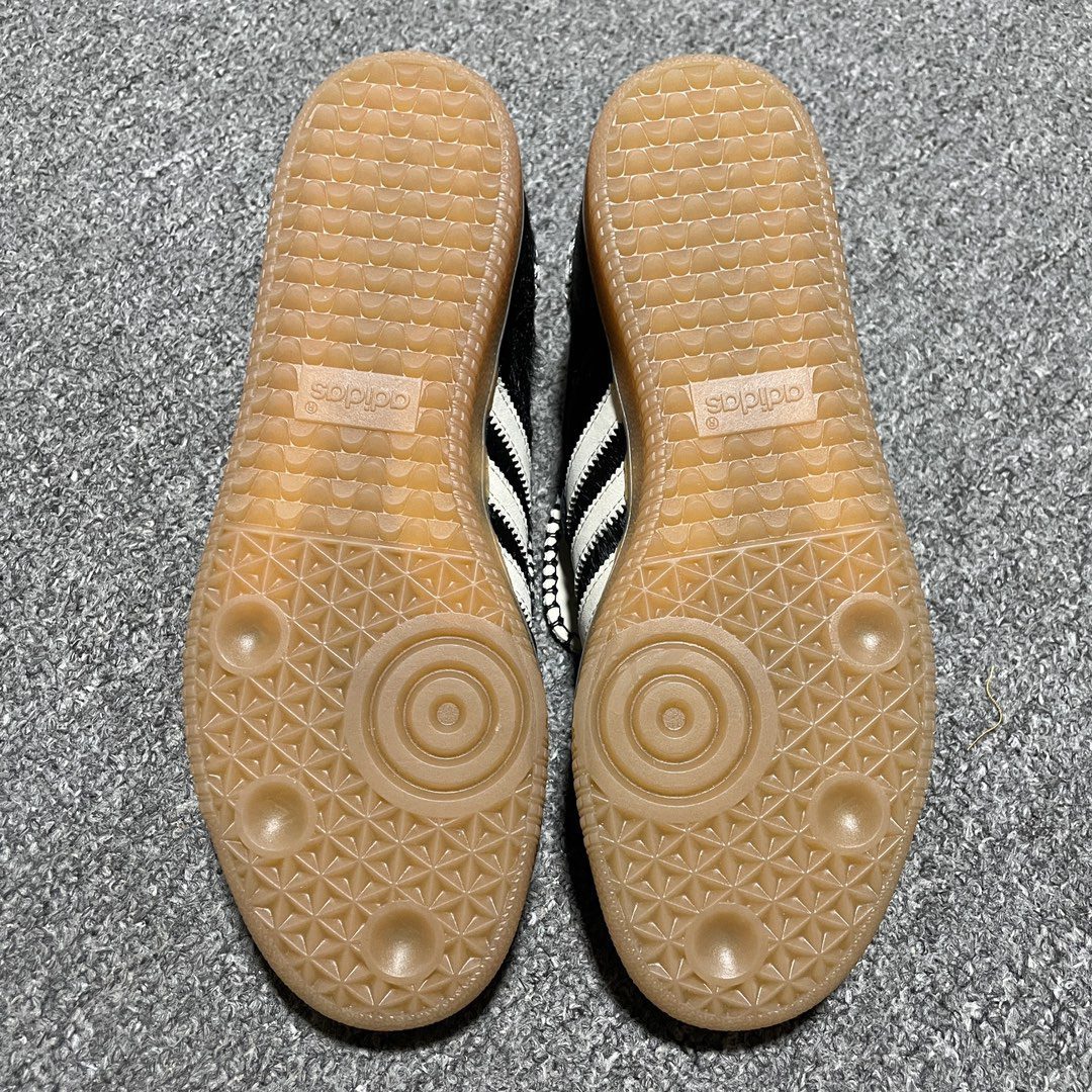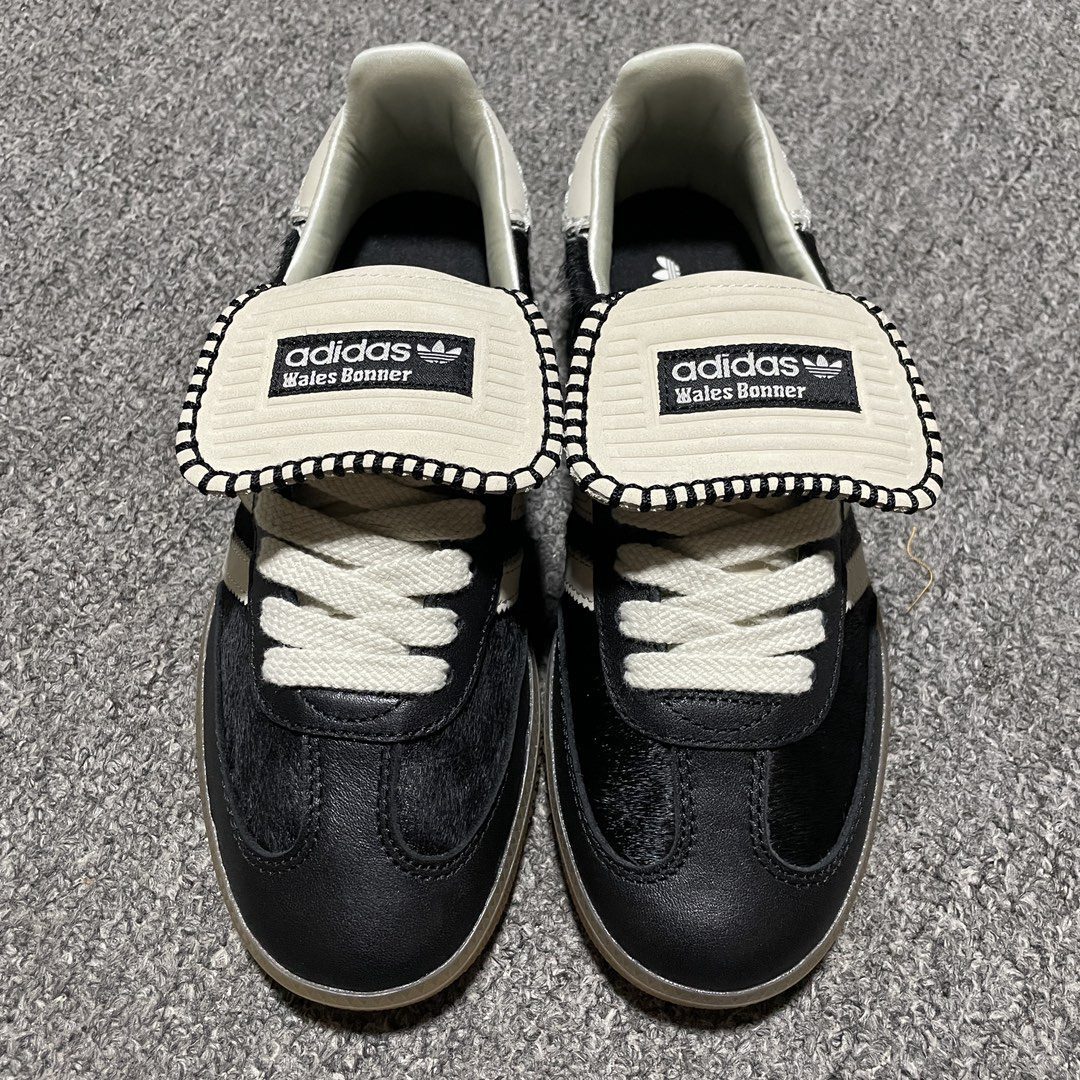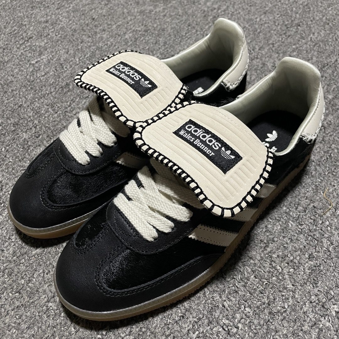 The adidas Samba Pony Tonal Low x Wales Bonner ‘Core Black’ continues the collaboration’s legacy by offering a low-profile version that maintains the same premium materials and design ethos. Both the adidas Samba Pony Tonal Wales Bonner Core Black and the low variant feature a black faux pony hair base paired with luxe black leather overlays, creating a textured and rich visual appeal. The adidas x Wales Bonner Samba Pony Tonal Core Black IE0580 model is distinguished by its co-branded woven tags and cream-colored leather three-stripes, which add contrast and depth to the predominantly black upper. These sneakers combine traditional Samba elements with Wales Bonners unique aesthetic, resulting in a versatile and stylish shoe suitable for unisex wear. Whether you choose the classic or low version, the adidas Samba Pony Tonal Wales Bonner Core Black offers exceptional craftsmanship and a distinctive look that elevates any outfit.