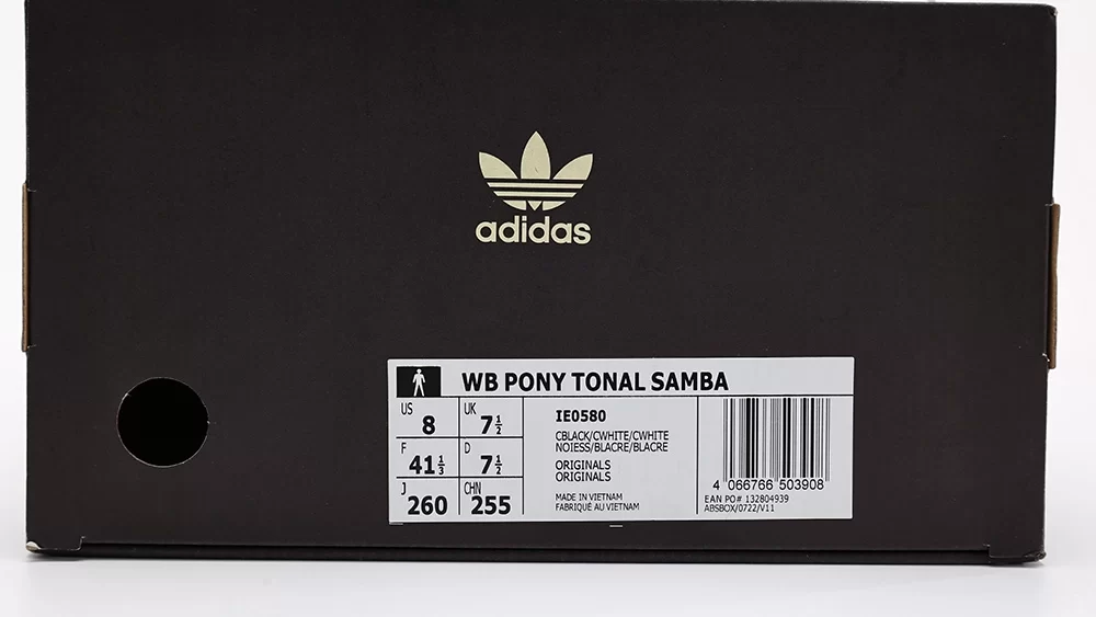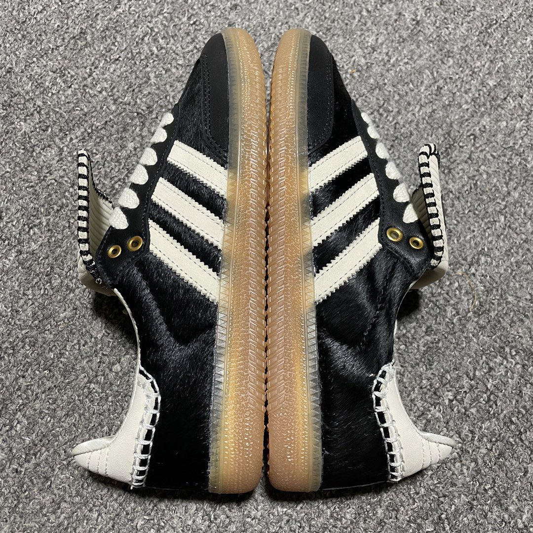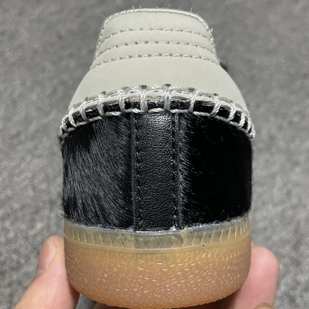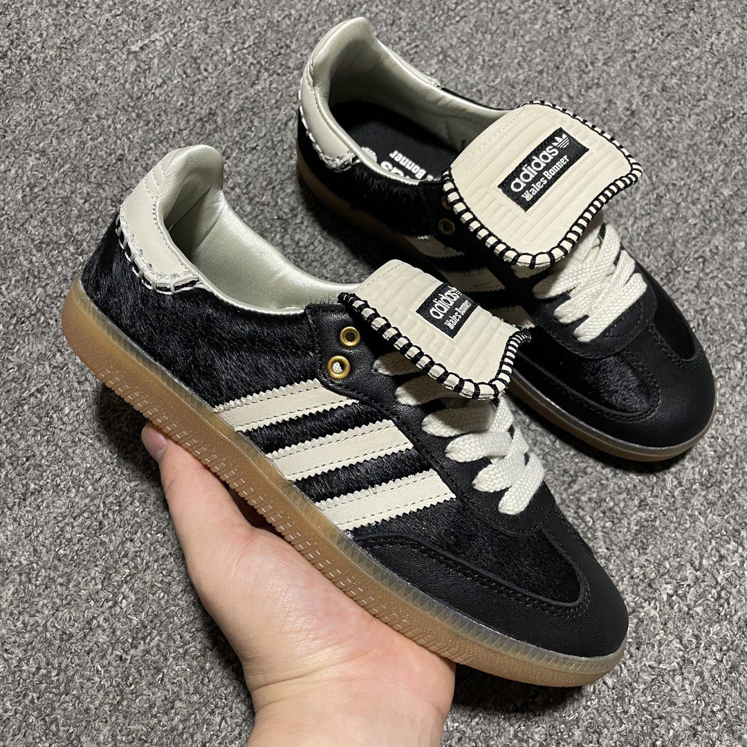 The adidas Samba Pony Tonal Low x Wales Bonner ‘Core Black’ continues the collaboration’s legacy by offering a low-profile version that maintains the same premium materials and design ethos. Both the adidas Samba Pony Tonal Wales Bonner Core Black and the low variant feature a black faux pony hair base paired with luxe black leather overlays, creating a textured and rich visual appeal. The adidas x Wales Bonner Samba Pony Tonal Core Black IE0580 model is distinguished by its co-branded woven tags and cream-colored leather three-stripes, which add contrast and depth to the predominantly black upper. These sneakers combine traditional Samba elements with Wales Bonners unique aesthetic, resulting in a versatile and stylish shoe suitable for unisex wear. Whether you choose the classic or low version, the adidas Samba Pony Tonal Wales Bonner Core Black offers exceptional craftsmanship and a distinctive look that elevates any outfit.