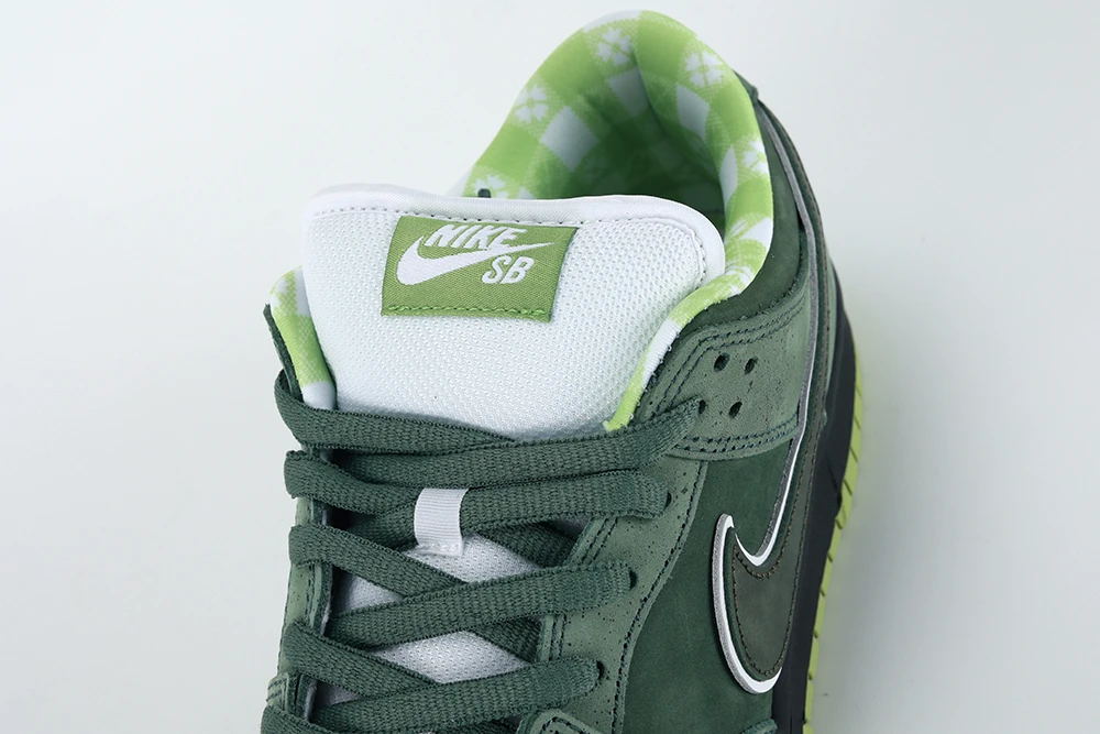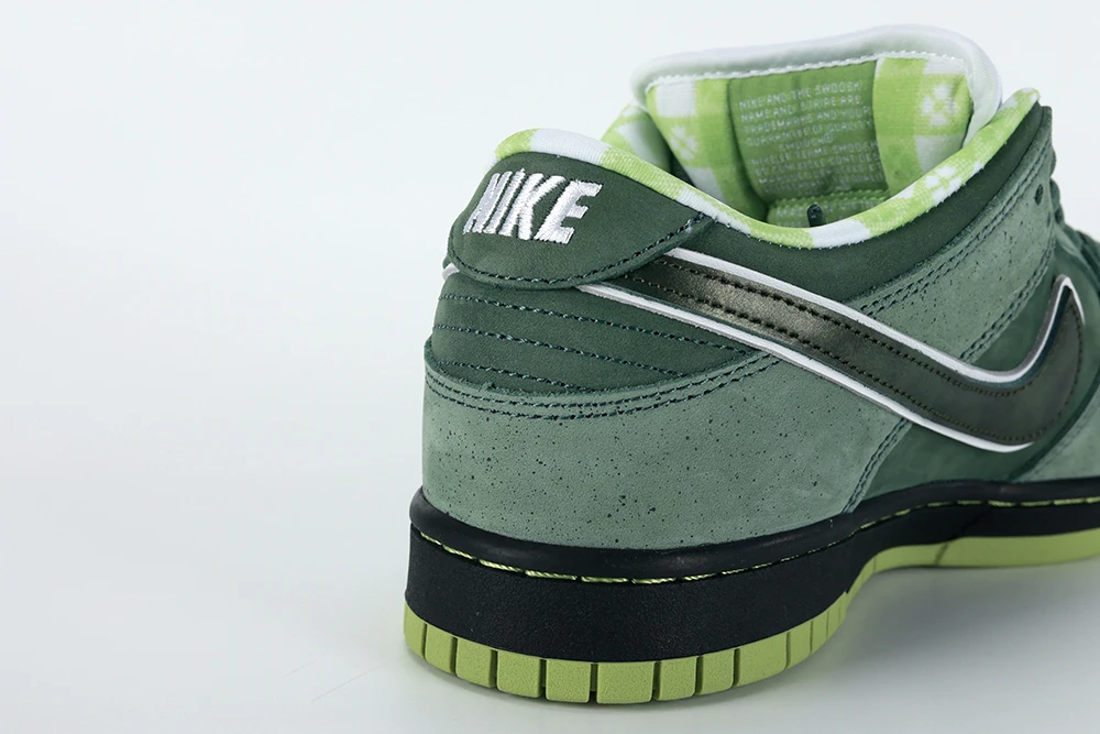 The Nike SB Dunk Low Concepts Green Lobster is part of a celebrated series inspired by the lobster theme, with the green variant being a mashup of previous blue and yellow colorways. This sneaker features a combination of nubuck and leather on the upper, providing durability and style. The black midsole contrasts sharply with the bright green outsole, enhancing its visual appeal. Released in extremely limited quantities, the Green Lobster edition is known for its exclusivity and premium packaging, including a special box for some versions. The sneaker’s style is complemented by its padded white tongue and detailed craftsmanship, making it a favorite among sneakerheads. The collaboration between Concepts and Nike SB has produced several iconic Dunk Low models, with the Green Lobster standing out for its unique color palette and thematic design. Whether in the regular box or special box edition, this sneaker remains a coveted item in the sneaker community, combining streetwear culture with high-quality materials and design.