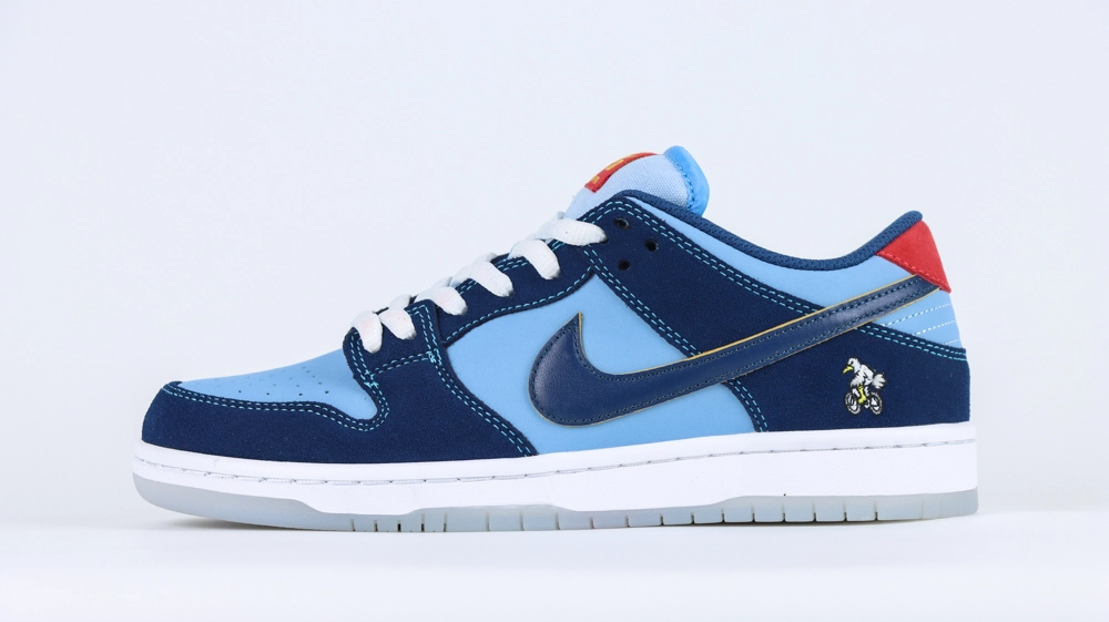 The Why So Sad x Dunk Low SB The Predatory Bird is a standout sneaker collaboration that blends style with a meaningful message. Released in 2022, this Dunk Low SB features a light blue leather upper paired with navy suede overlays, creating a fresh and eye-catching look. A unique wear-away Swoosh fades from Coastal Blue to Speed Yellow, adding dynamic visual interest. The sneaker prominently displays an embroidered Predatory Bird mascot on the lateral heel, symbolizing the collaboration’s theme of positivity and mental wellness. The red suede heel tab is accented with a yellow question mark, while the interior tongue tag bears the ‘Why So Sad?’ inscription. Underfoot, a translucent rubber outsole provides excellent traction. This model perfectly embodies the spirit of the Why So Sad initiative, making the Why So Sad x Dunk Low SB The Predatory Bird a must-have for collectors and fans alike.